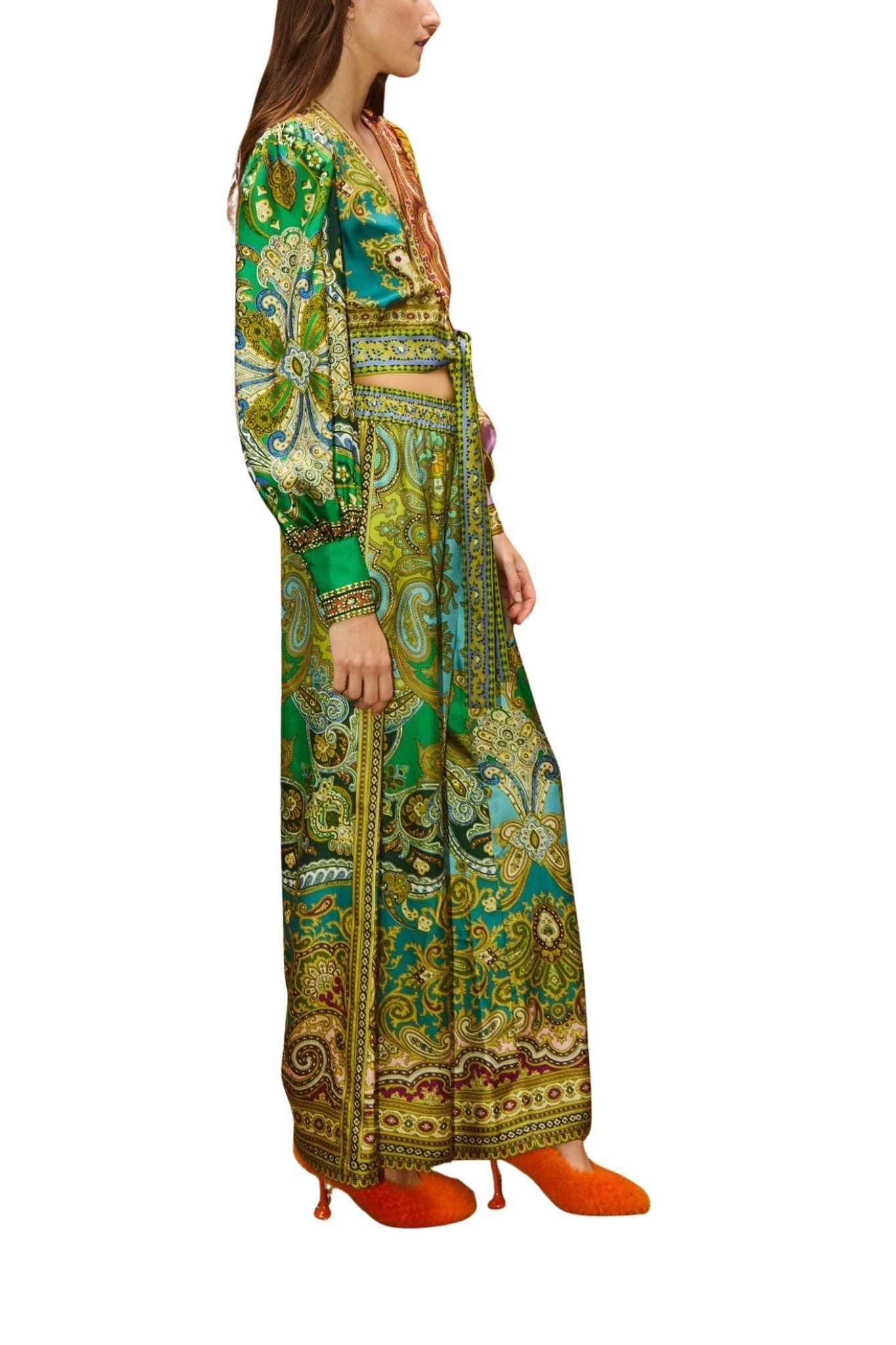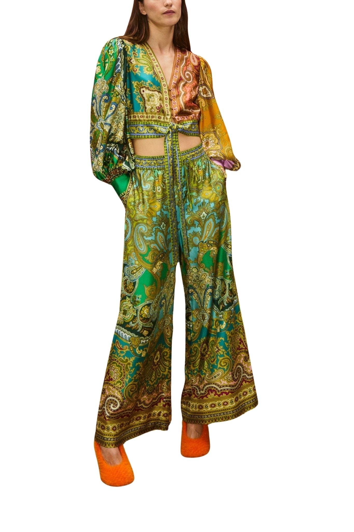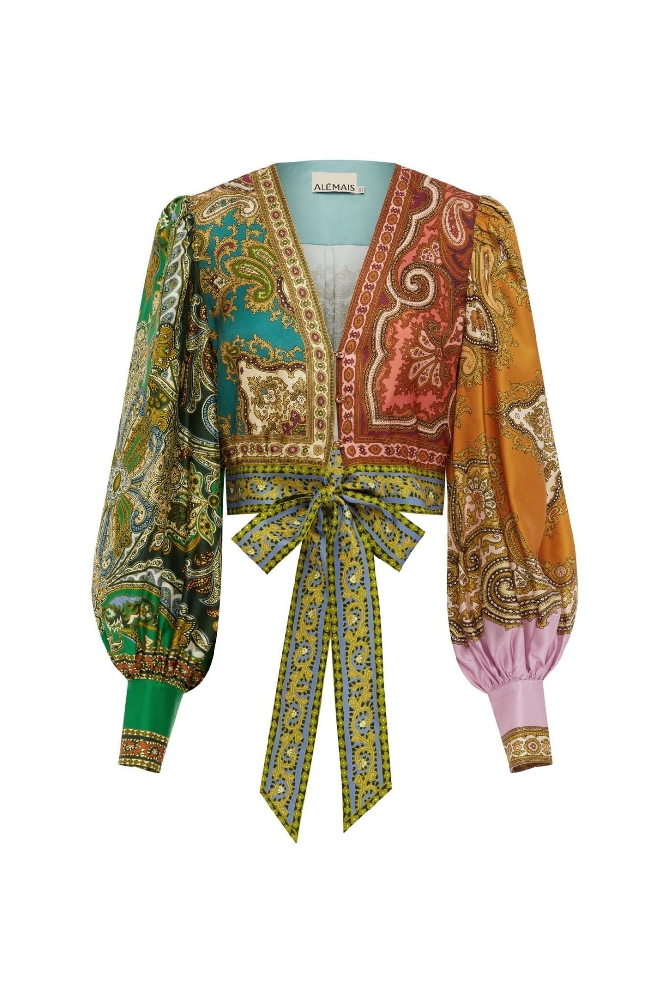 The Alemais Splice Crop Top is a cropped blouse silhouette designed with a flattering V‑neckline and gathered sleeves finished with button‑up cuffs. A self‑tie detail at the waist adds definition and shape, while the overall cut creates a modern yet feminine look. For accurate garment measurements, please refer to the size guide, and for true colour representation, consult the flat lay product shots.