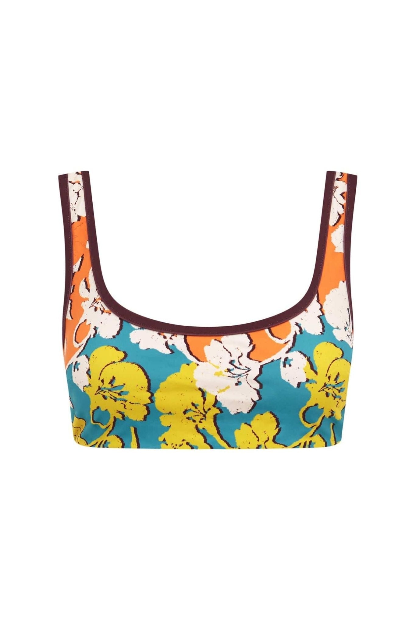 The Alemais Splice Scoop Neck Top is a stylish bikini piece featuring a scoop neckline with contrast bind detailing at the neck and armholes, a secure clip-back closure, and medium coverage designed to flatter bust sizes A–D, with sizing guided by the brand’s measurement chart and true color best represented in flat lay product shots.