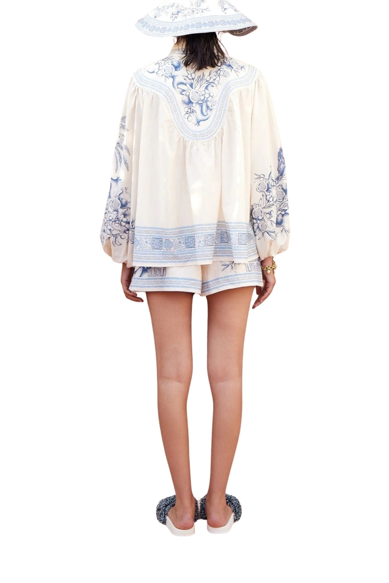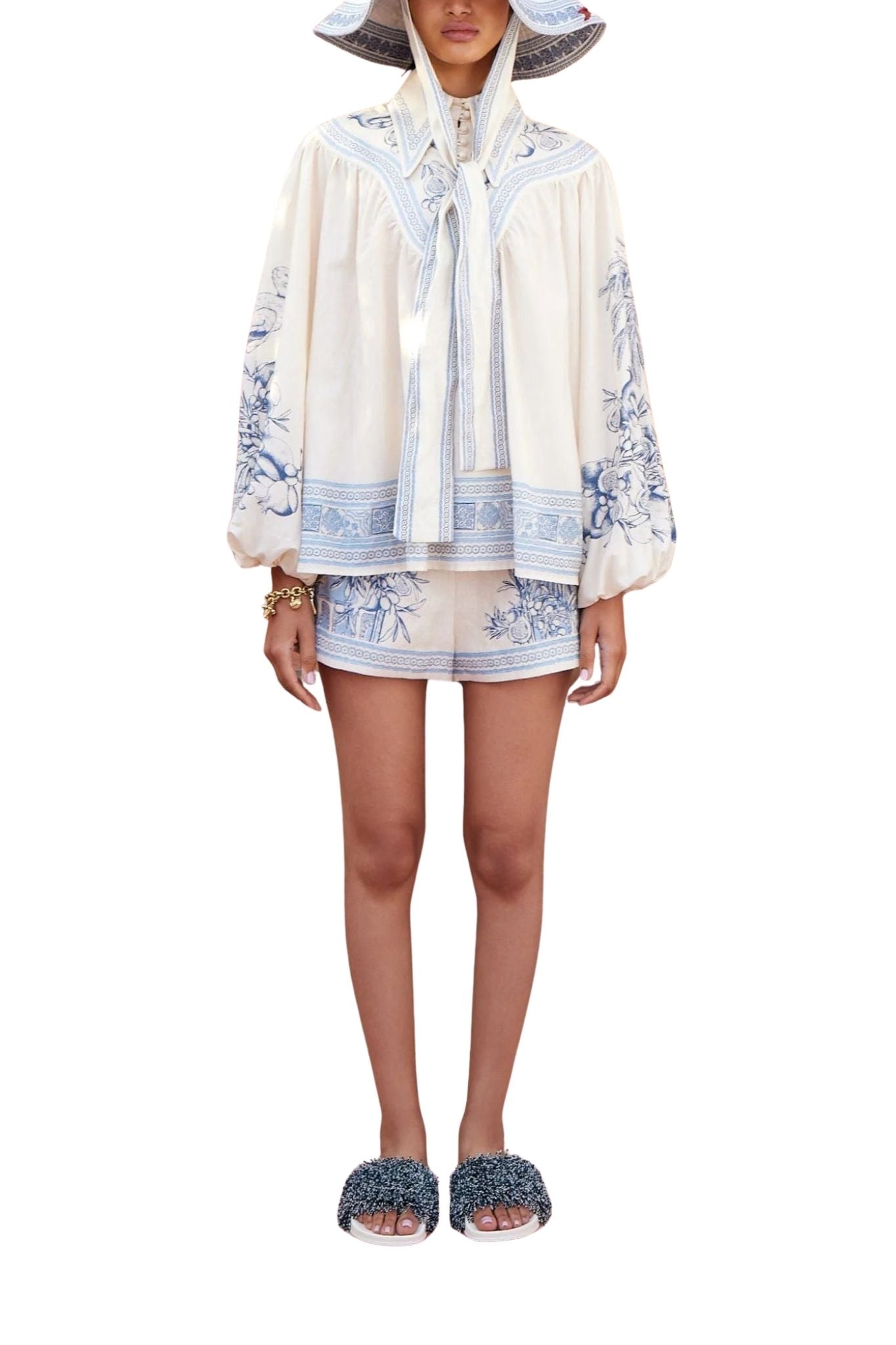 The Alemais Villa Romantica Blouse features a relaxed shirt silhouette with a pointed collar and stand. Detailed with raffia buttons and a shaped yoke, it is finished with soft puff sleeves for a refined yet effortless look.