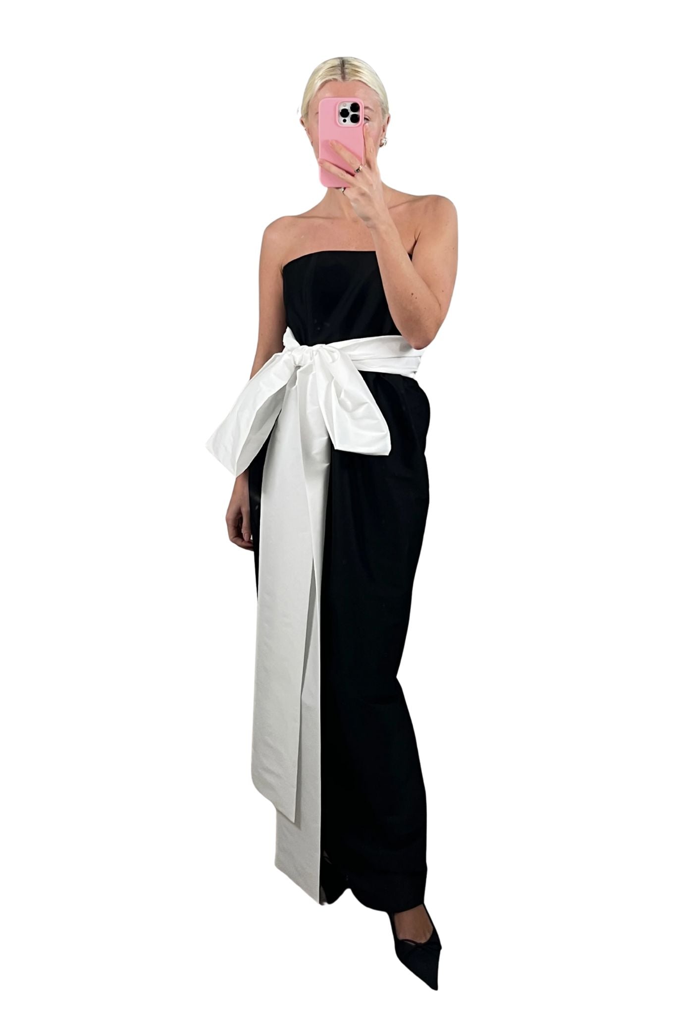 Dress Lina is crafted in sleek black, designed with a structured bustier and defined by an oversized ivory taffeta bow at the waist. Falling into a refined maxi silhouette with a tapered hem, it blends detail with refined sophistication—an elevated choice for the evening.