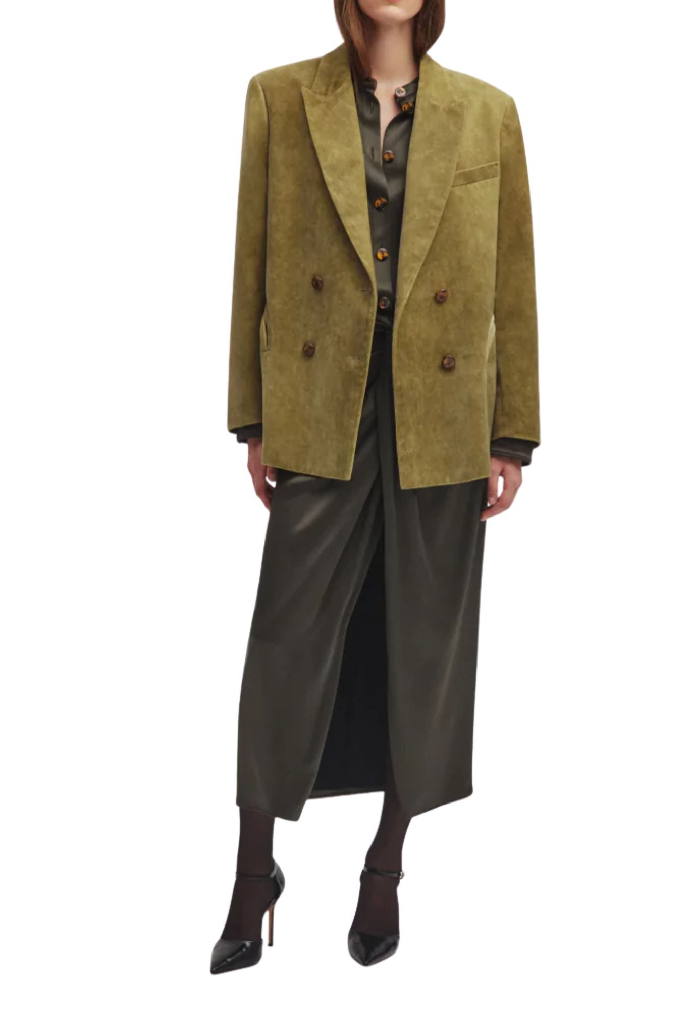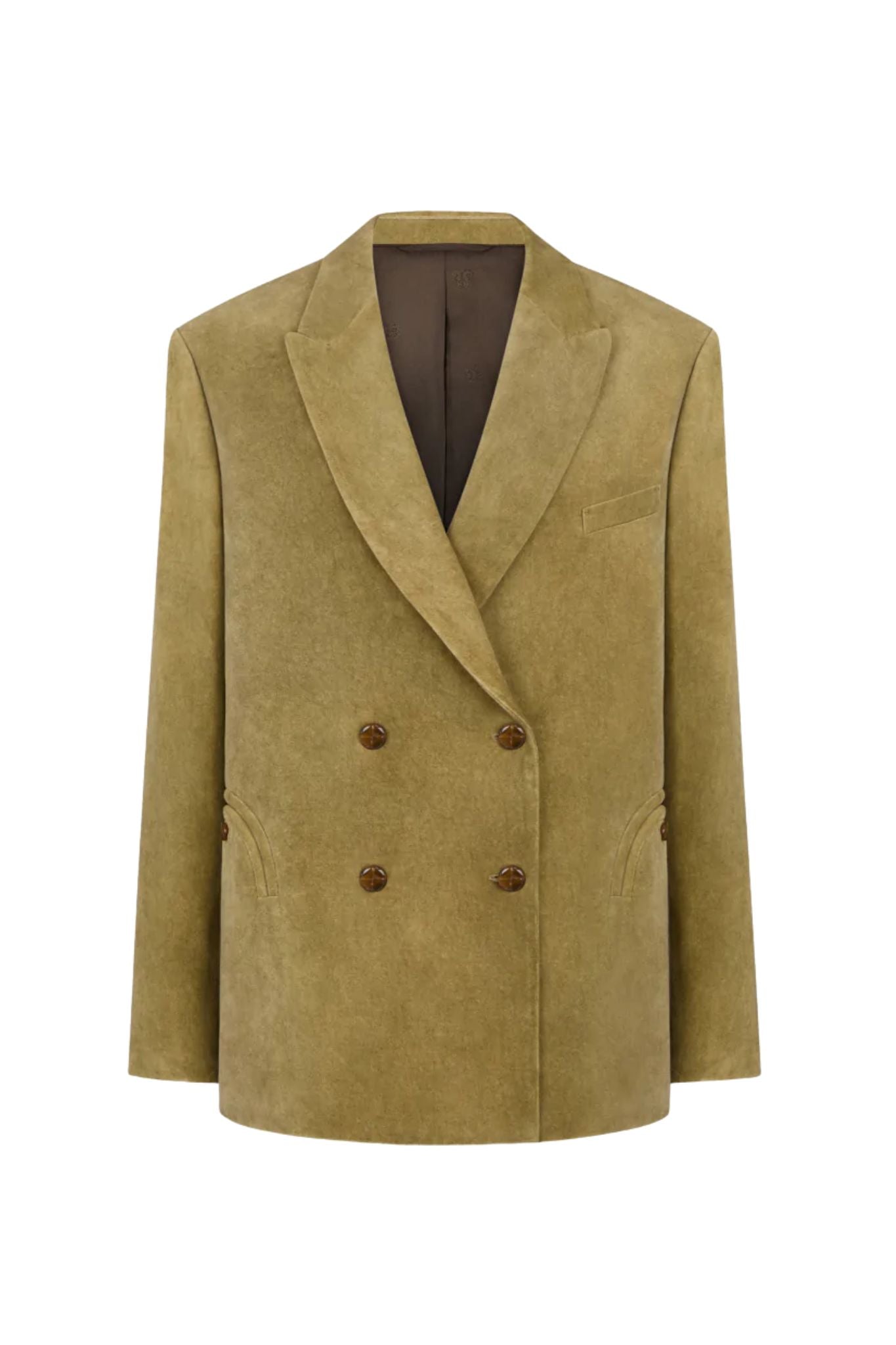 The retro charm of the Jealousy Frog Nightbreak Blazer lies in the distinctive texture of its velvet, dyed using artisanal techniques that give the piece a lived-in, irregular finish with a vintage allure. The oversized double-breasted cut lends itself to multiple interpretations and layering. Each blazer has a unique look due to the treatment, making it a piece to treasure and pass on. .