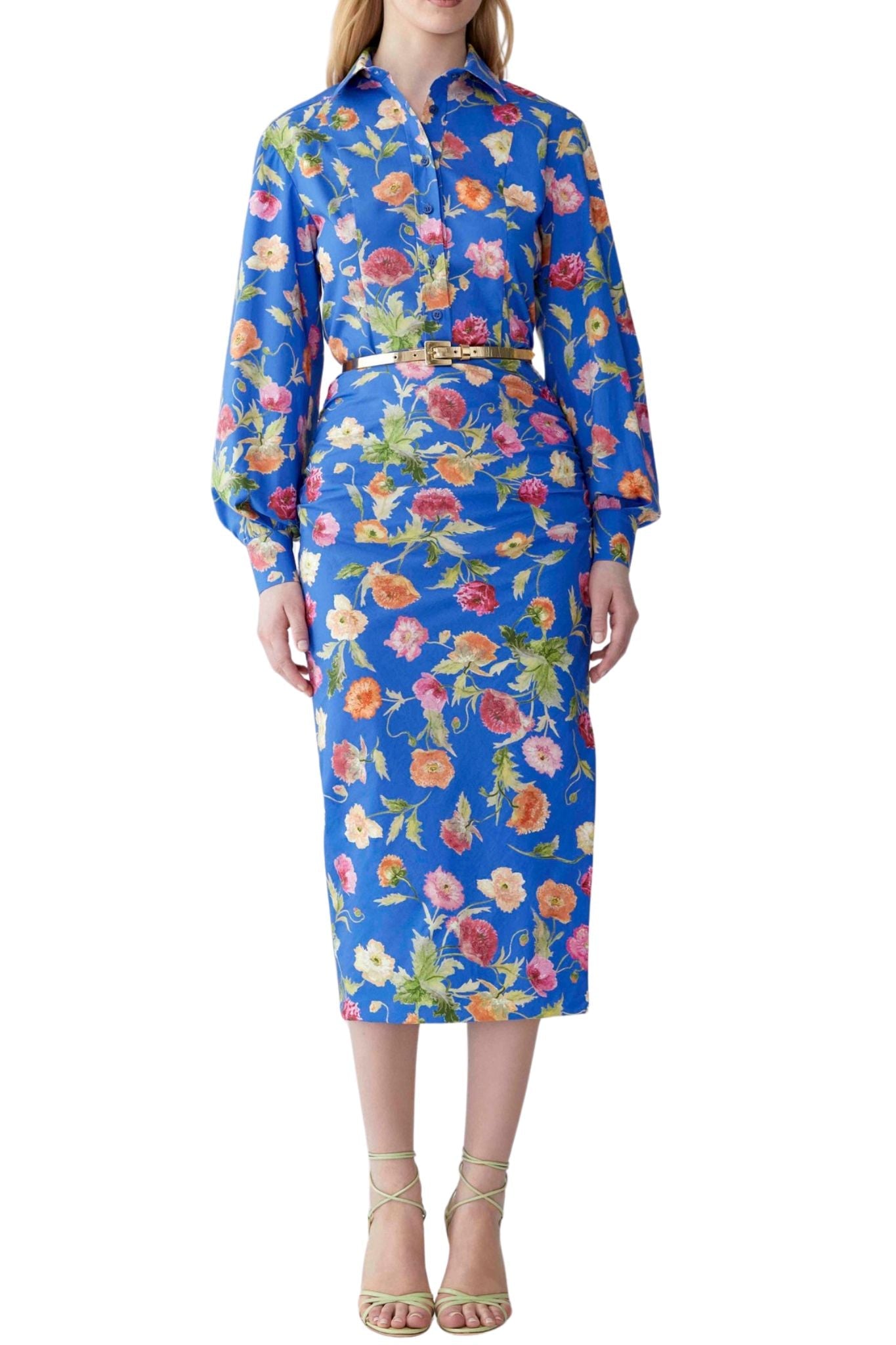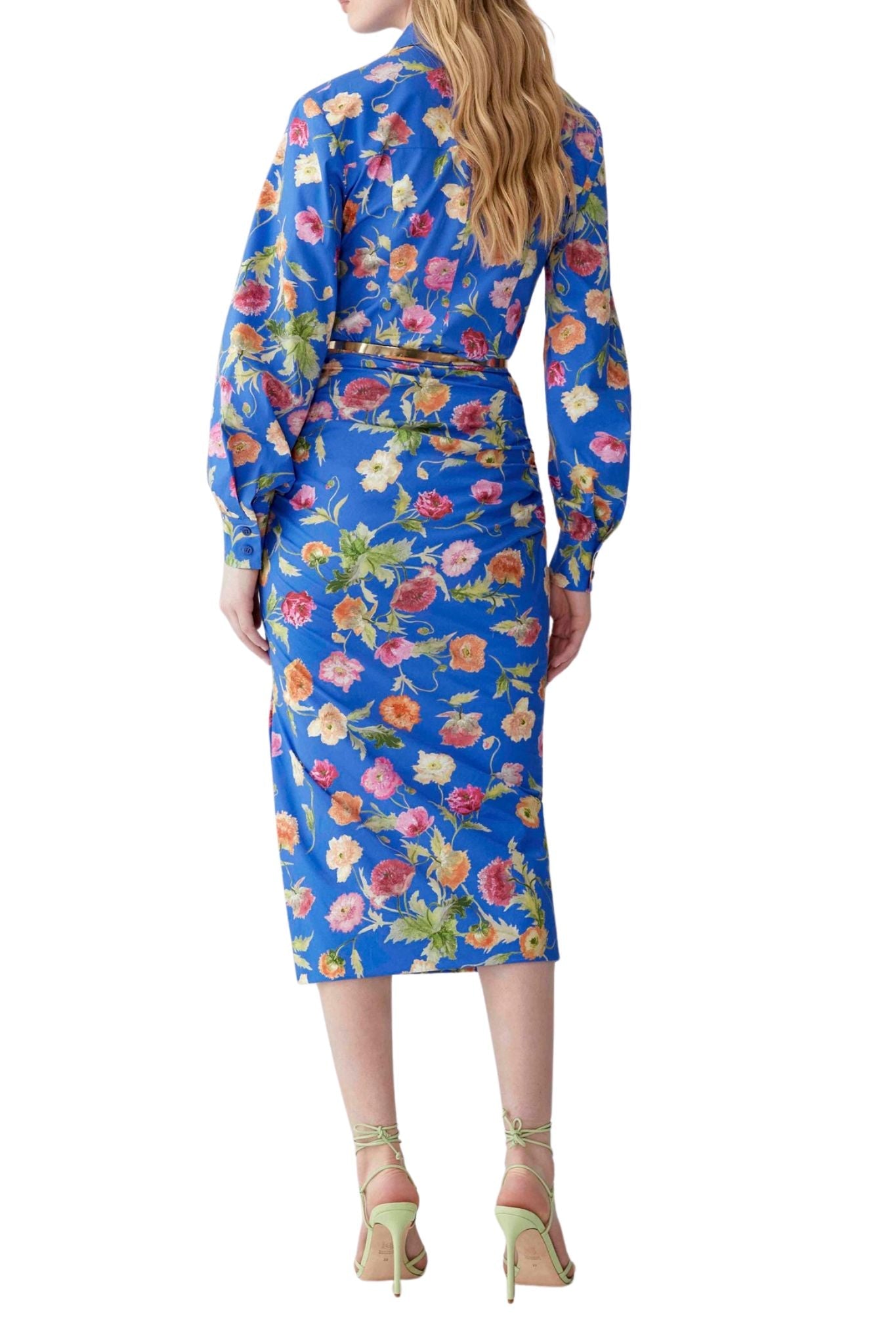 This form-fitting midi skirt is ruched at the sides for a flattering silhouette. It’s printed with vibrant poppies over a background inspired by sun-washed Aegean hues.
