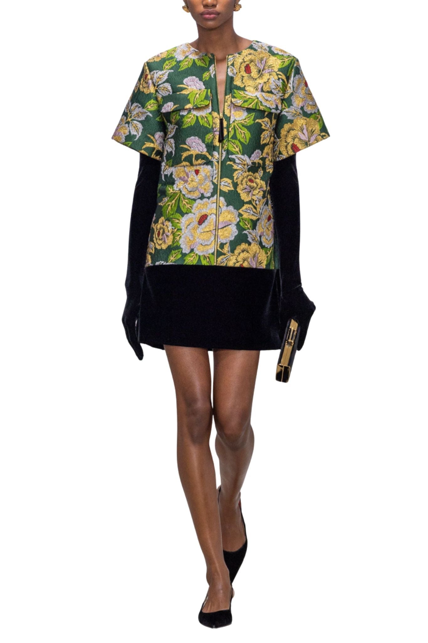 Short Sleeve Crewneck Shift Dress in Pine Green Multi.