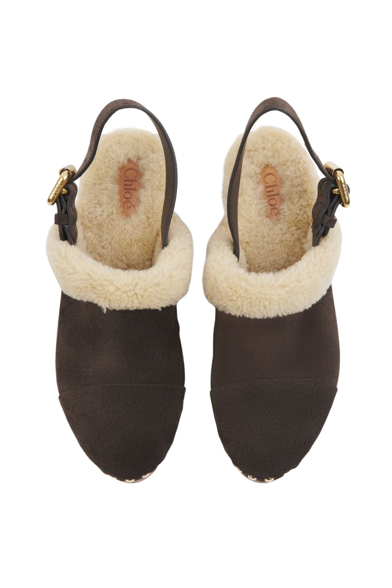 These Jeannette wedge clogs reinterpret an iconic Chloé shape in a lower silhouette. Crafted from a mix of suede calfskin and shearling, they combine an adjustable ankle strap with a chunky wooden wedge platform.