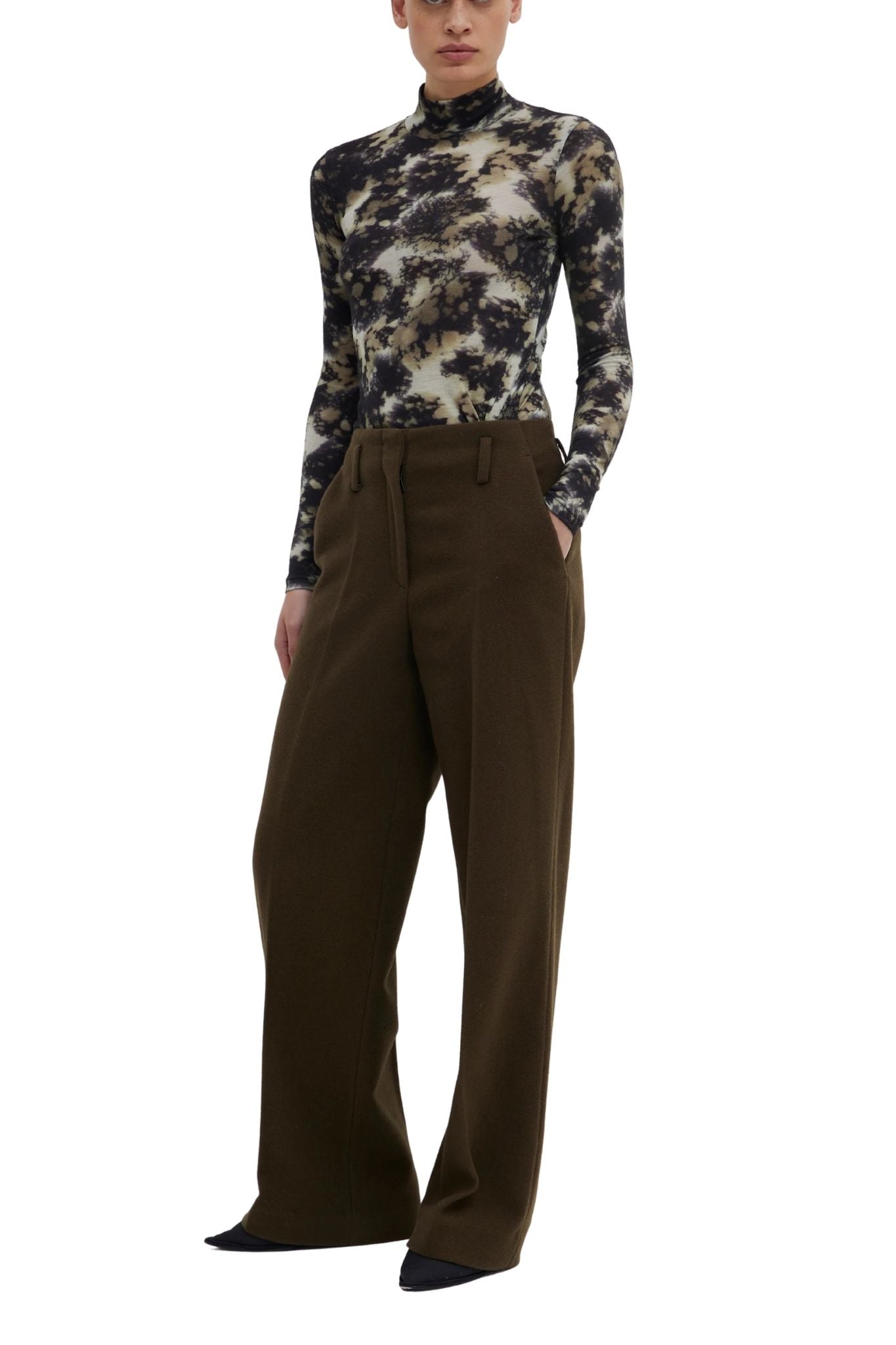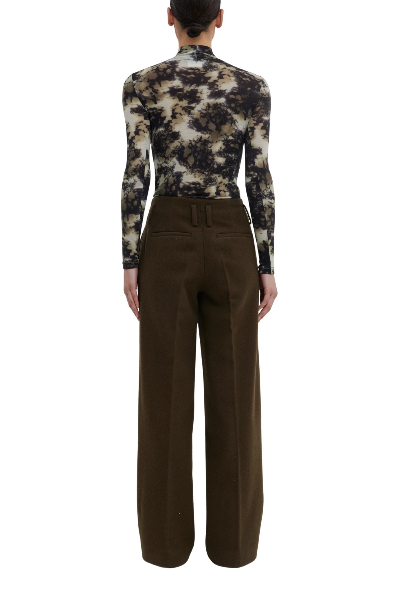 High-neck version of the signature jersey top in a fine blend with natural warmth and flexibility. The in-house designed Raisin Jasper print combines deep browns, khaki greens, and soft neutrals in a painterly, diffused pattern. Fits close through the body, making it ideal for layering or wearing solo.