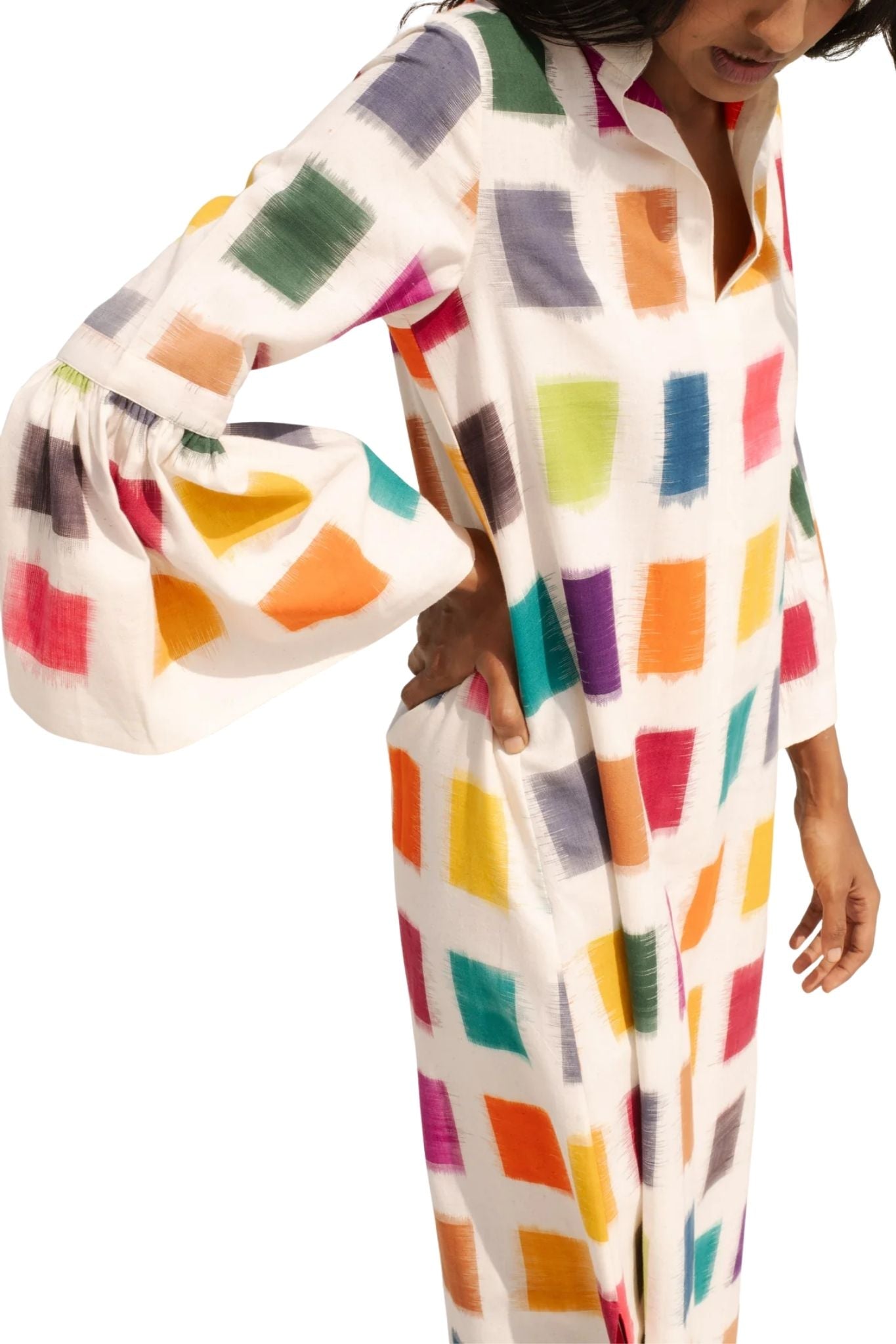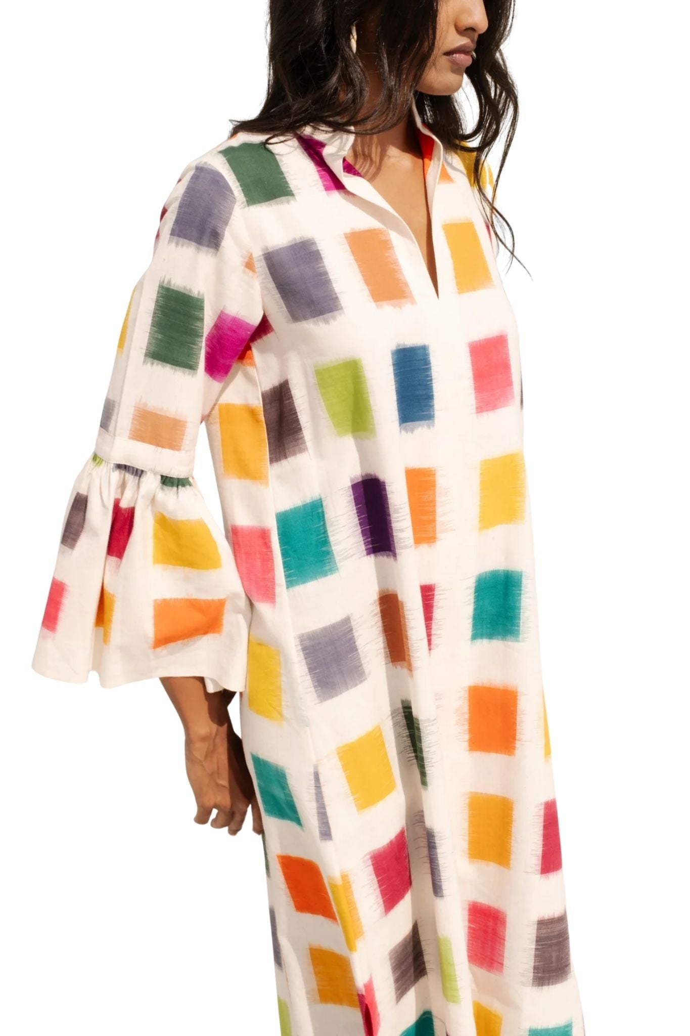 The Parampara tunic dress is crafted from organic cotton, handwoven in the south of India. It features a midi hemline, side slit and flounce sleeves.