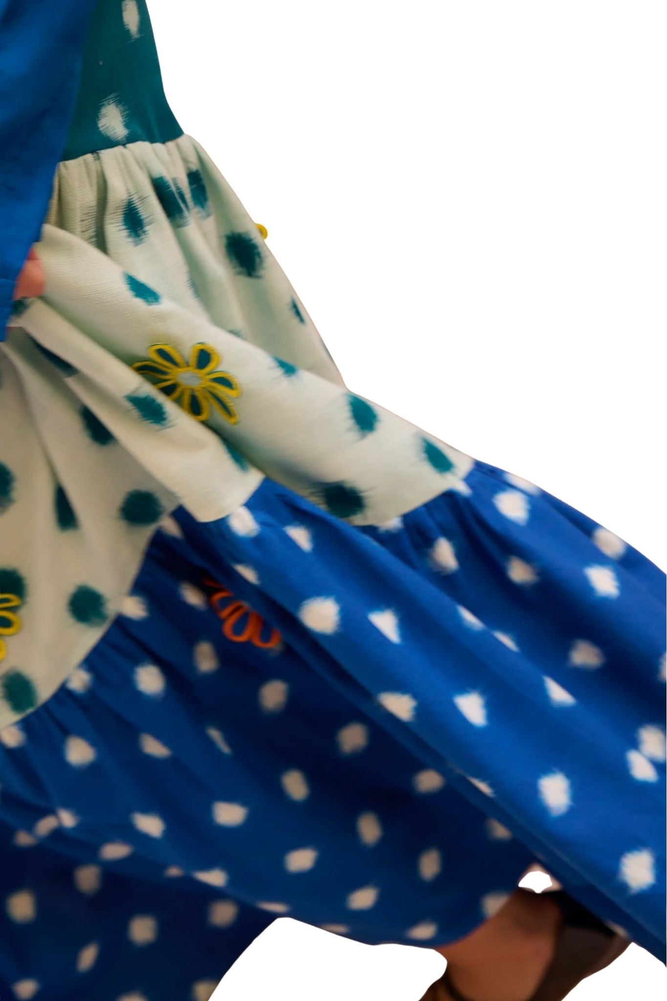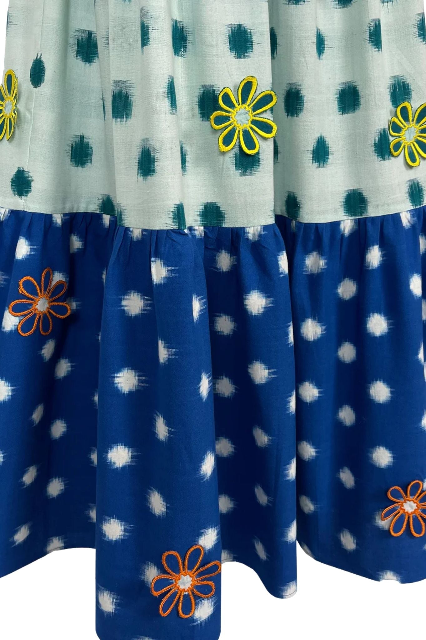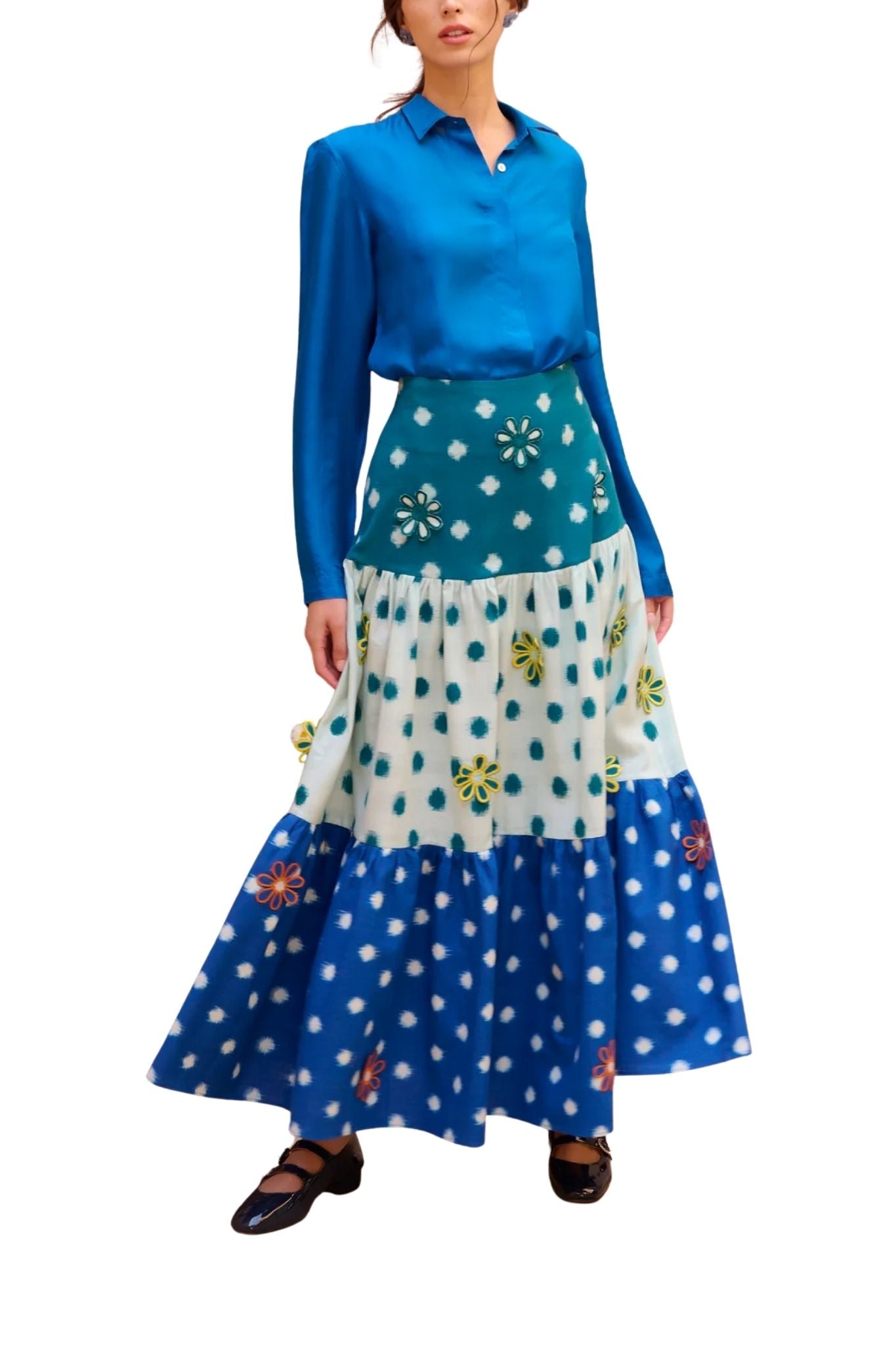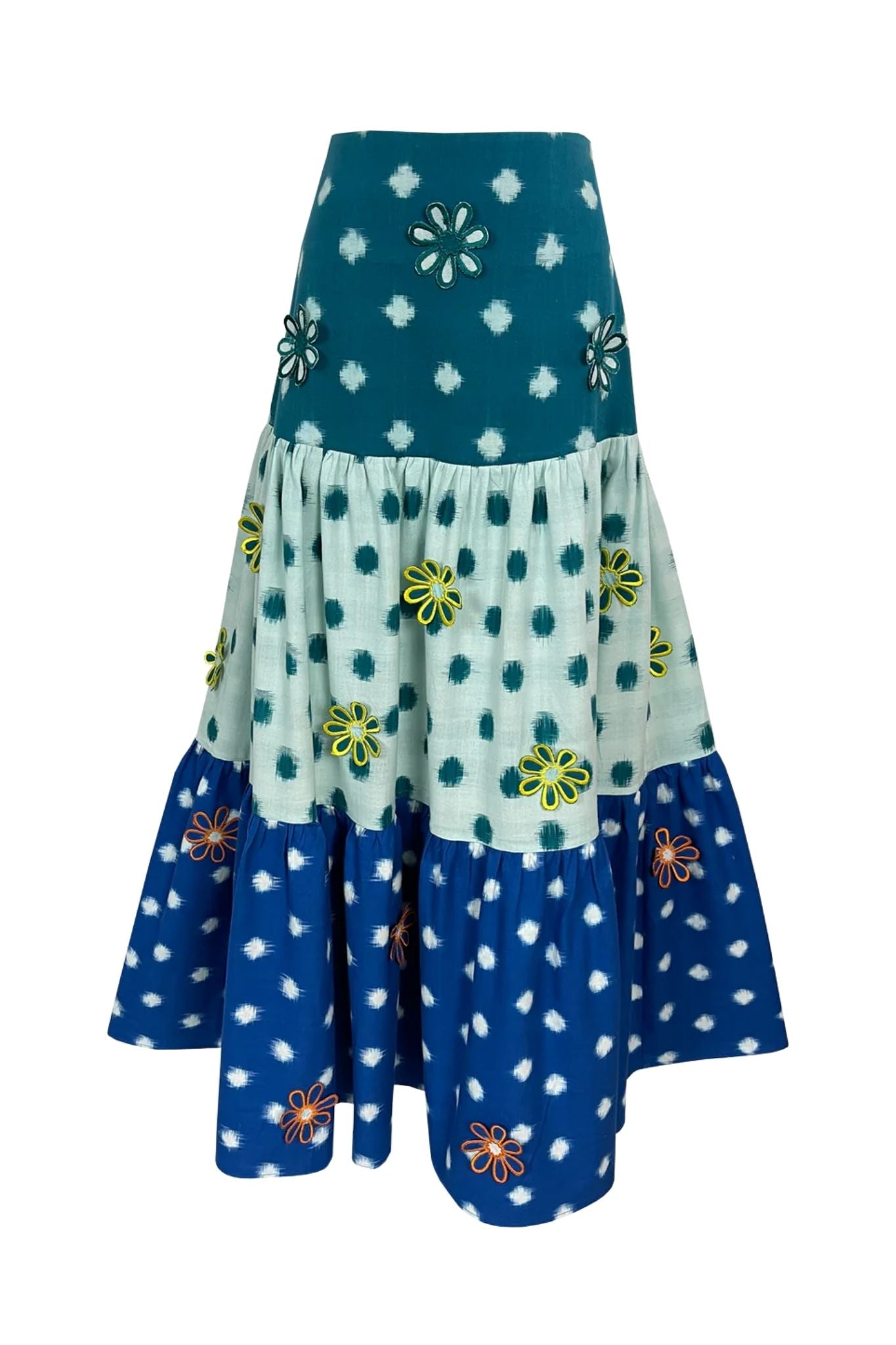 This marine dot skirt is crafted from three shades of polka dot cotton. The detailed design features three vibrant color combinations: green with mint dots, mint with green dots, and royal blue with off white dots. Adding to its beauty, each flare is adorned with delicate embroidered flowers in contrasting shades of green, yellow, or orange. This maxi skirt perfectly hugs the hips and exudes a bohemian flair silhouette.