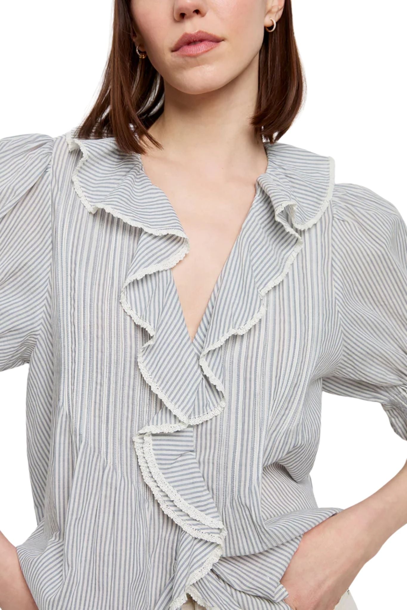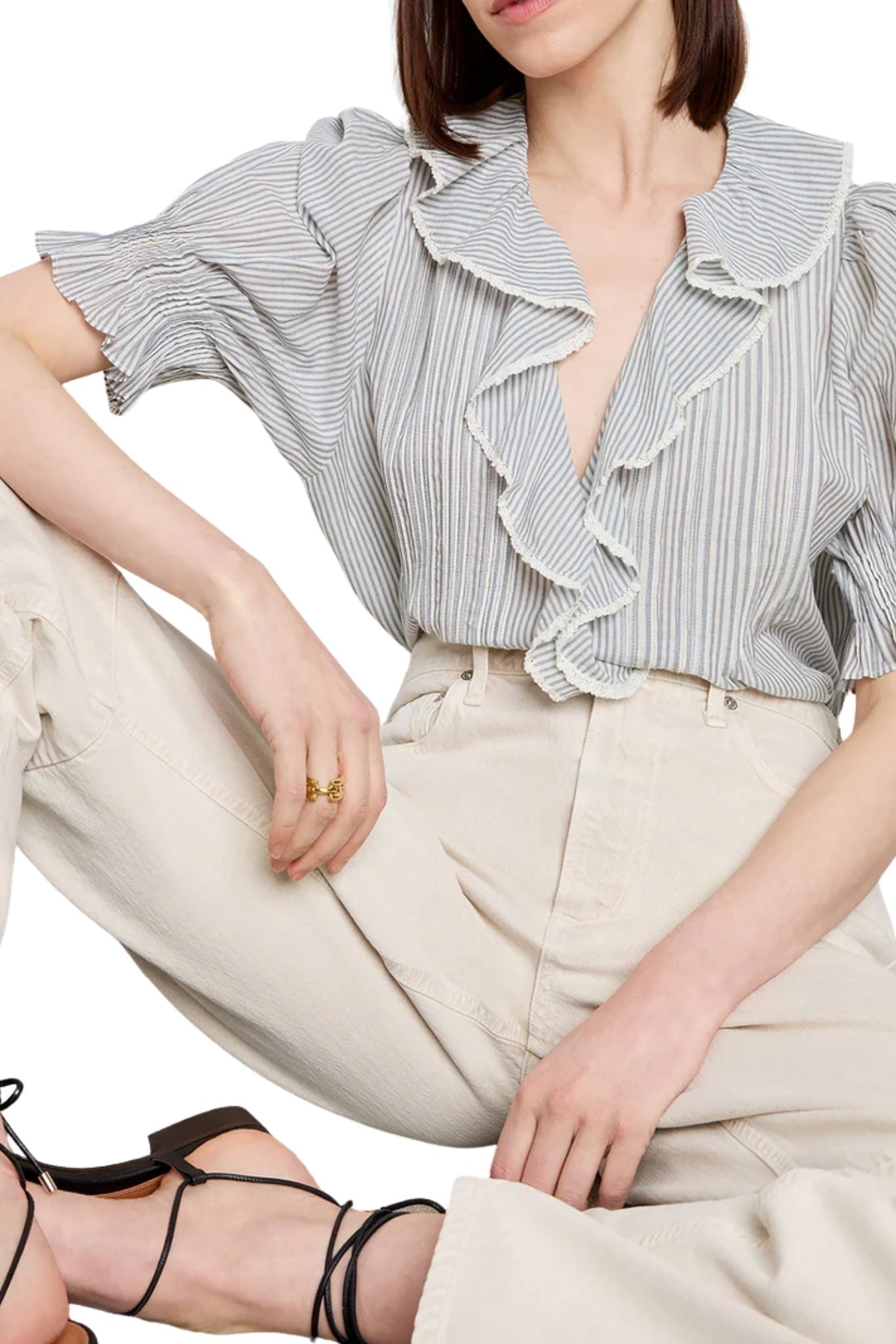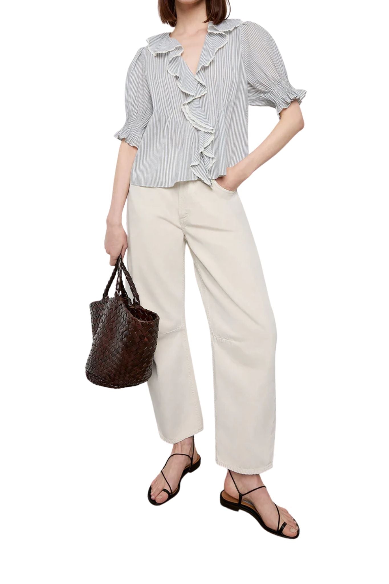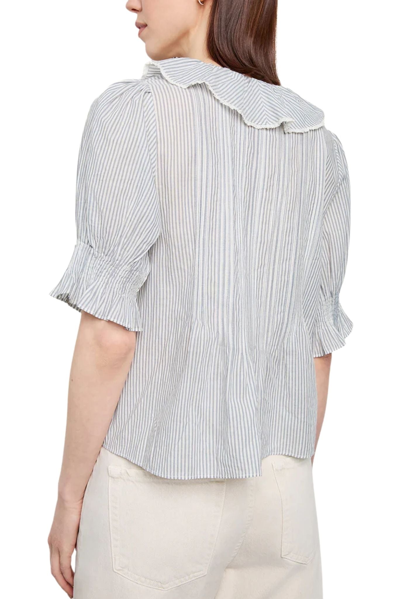 It’s DÔEN’s fan-favorite Henri Top, reimagined here in a blue-and-white stripe that’s both pretty and preppy. Made from the softest organic cotton voile, it has a button-up front, a plunging V-neck with lace-trimmed ruffles, and puff sleeves. And for a touch of texture, it’s finished with delicate pintucks at the yoke and back.