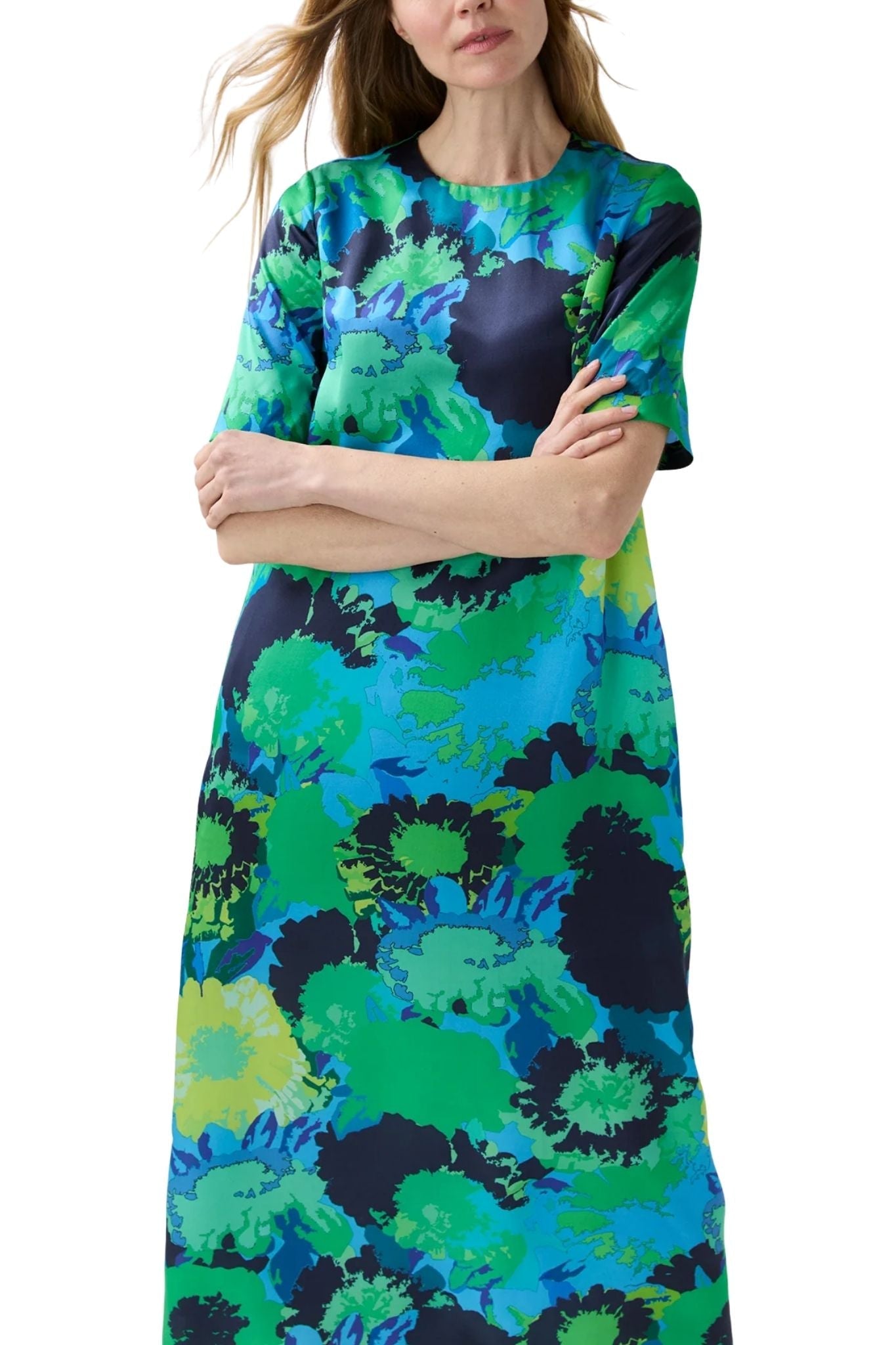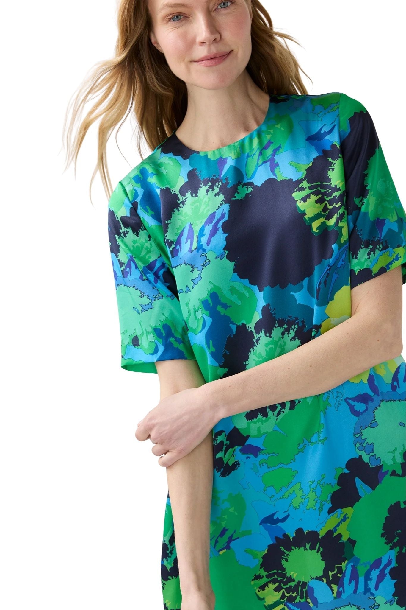 The Paige is an easy t-shirt shape in a luxurious fabric... a smooth, fluid silk charmeuse from Italy with a subtle sheen to the surface and a vibrant floral print. A home run with heels for a summer wedding; but we like it just as much with flat sandals.