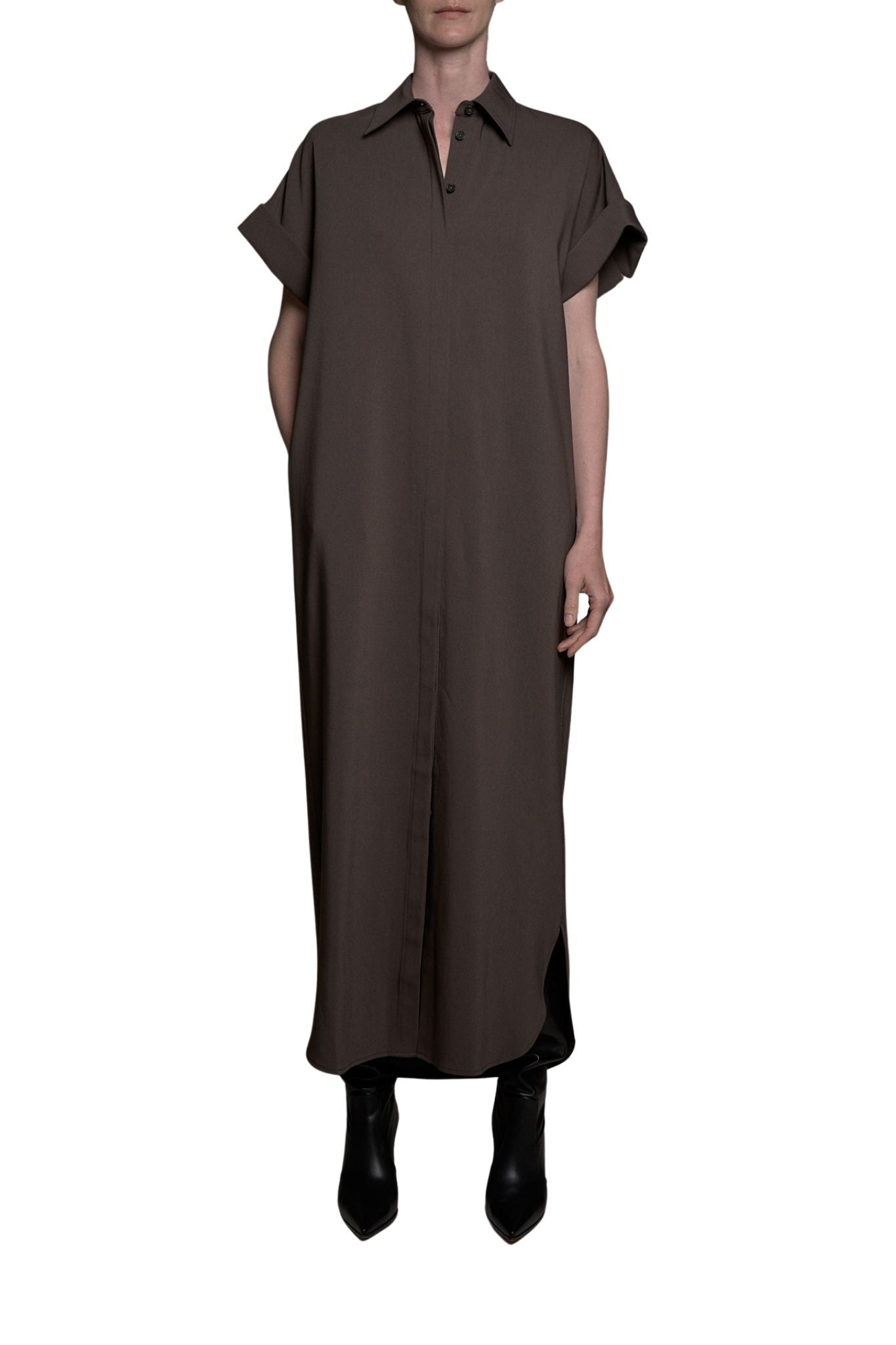 Relaxed yet refined, the Emory Shirtdress reimagines a tailored classic through a modern, minimal lens. Cut in a structured cotton-viscose twill, this easy silhouette features a crisp pointed collar, rolled short sleeves and a concealed front placket for a clean, uninterrupted line.