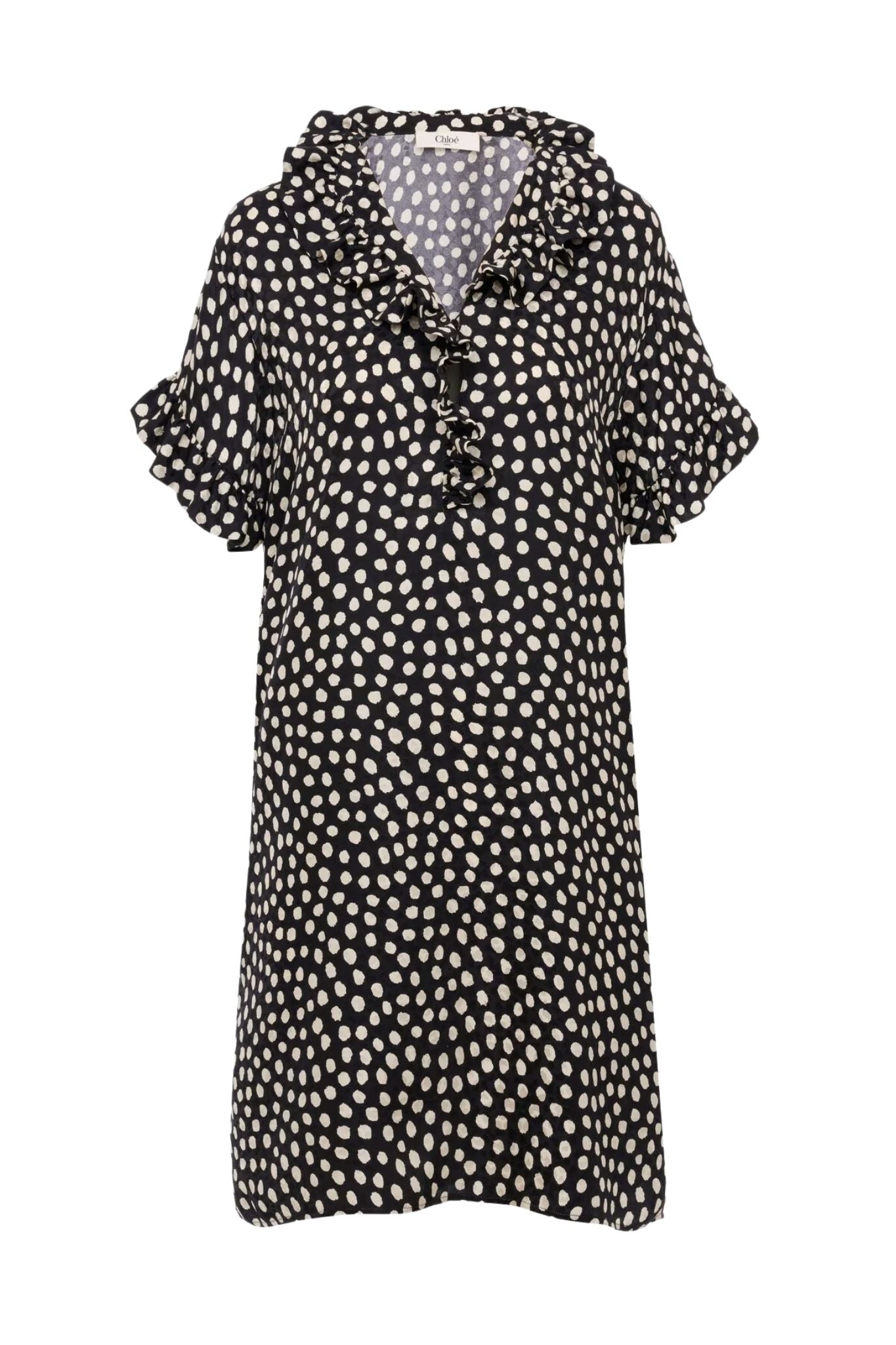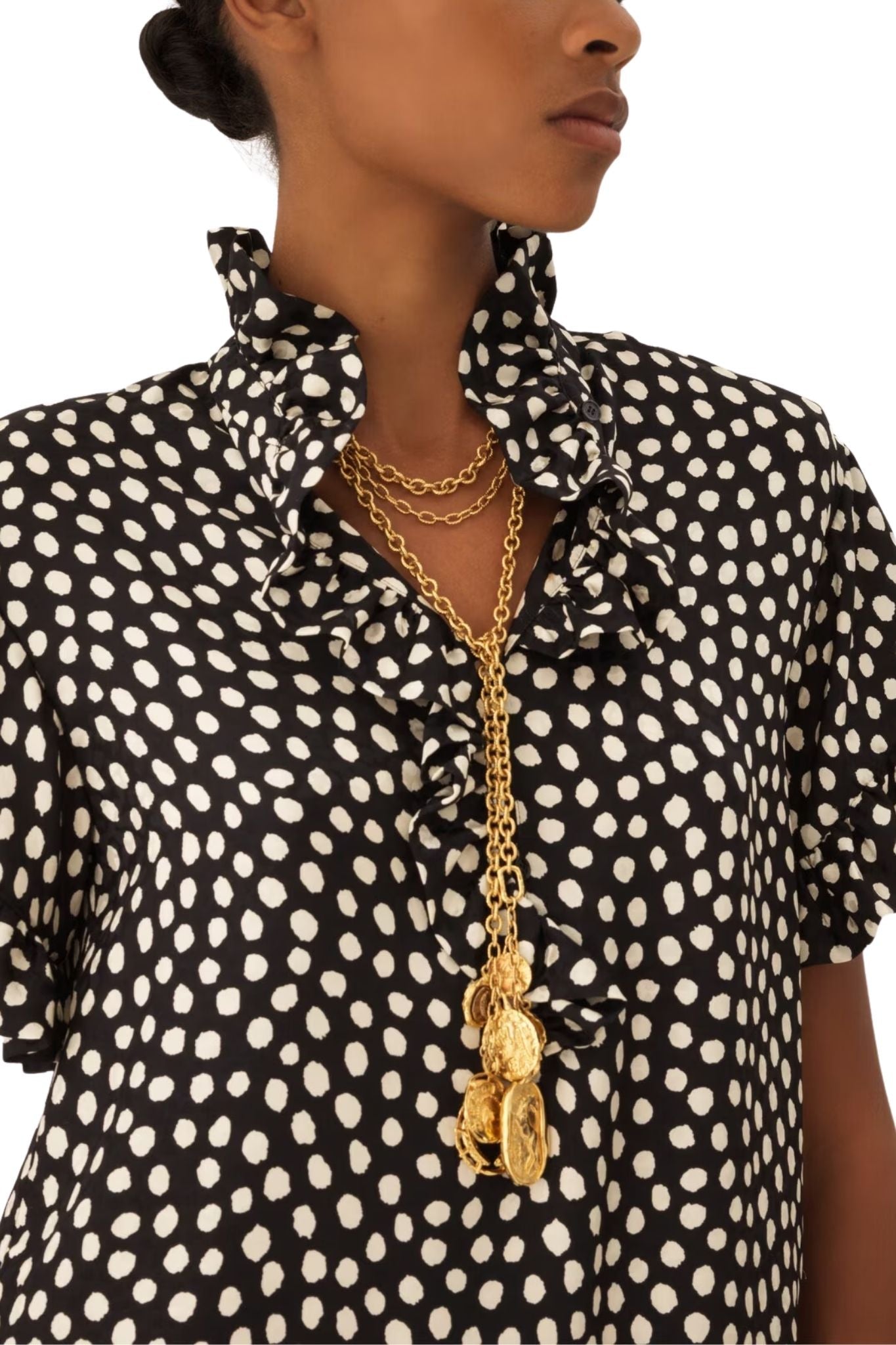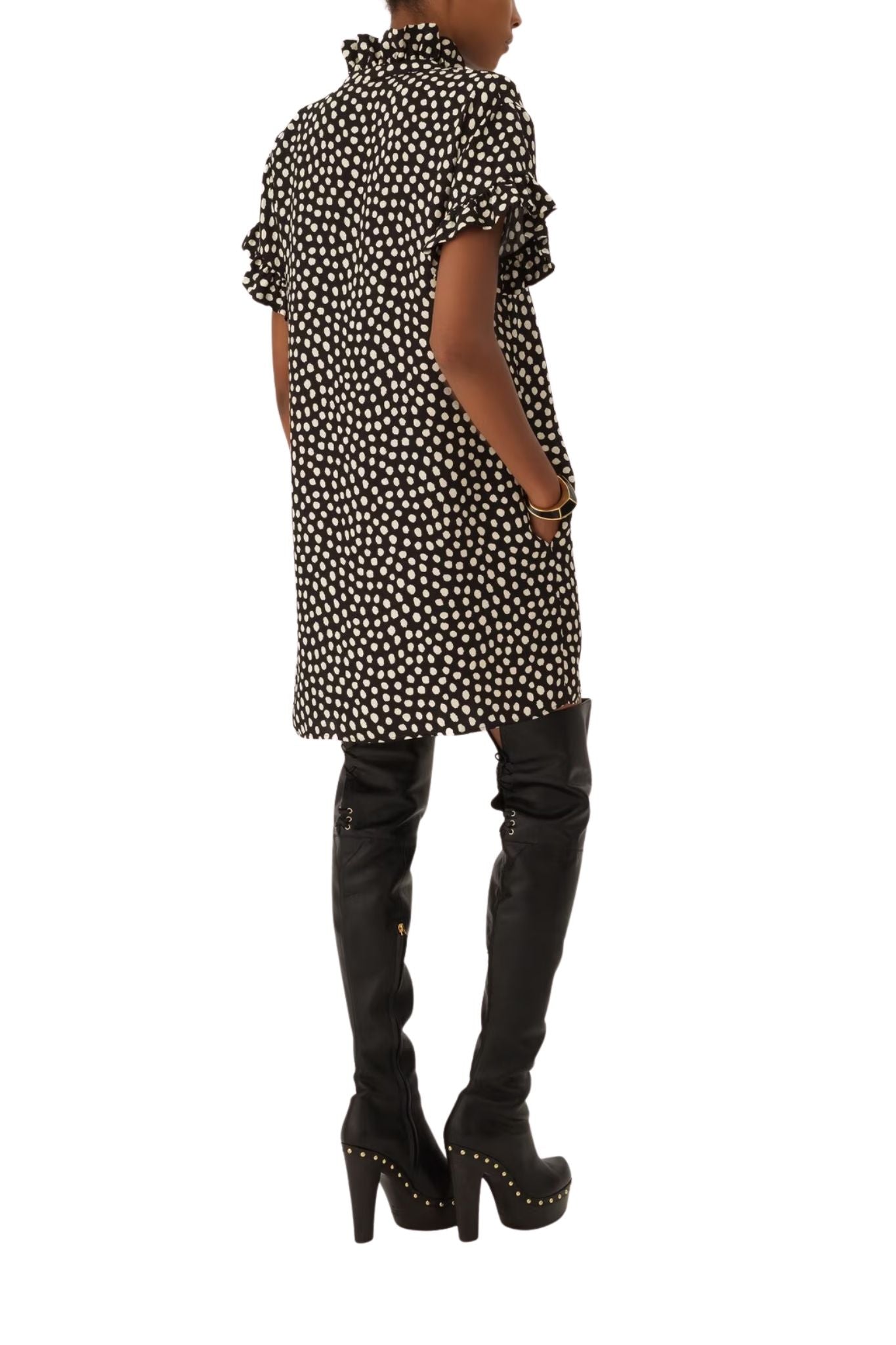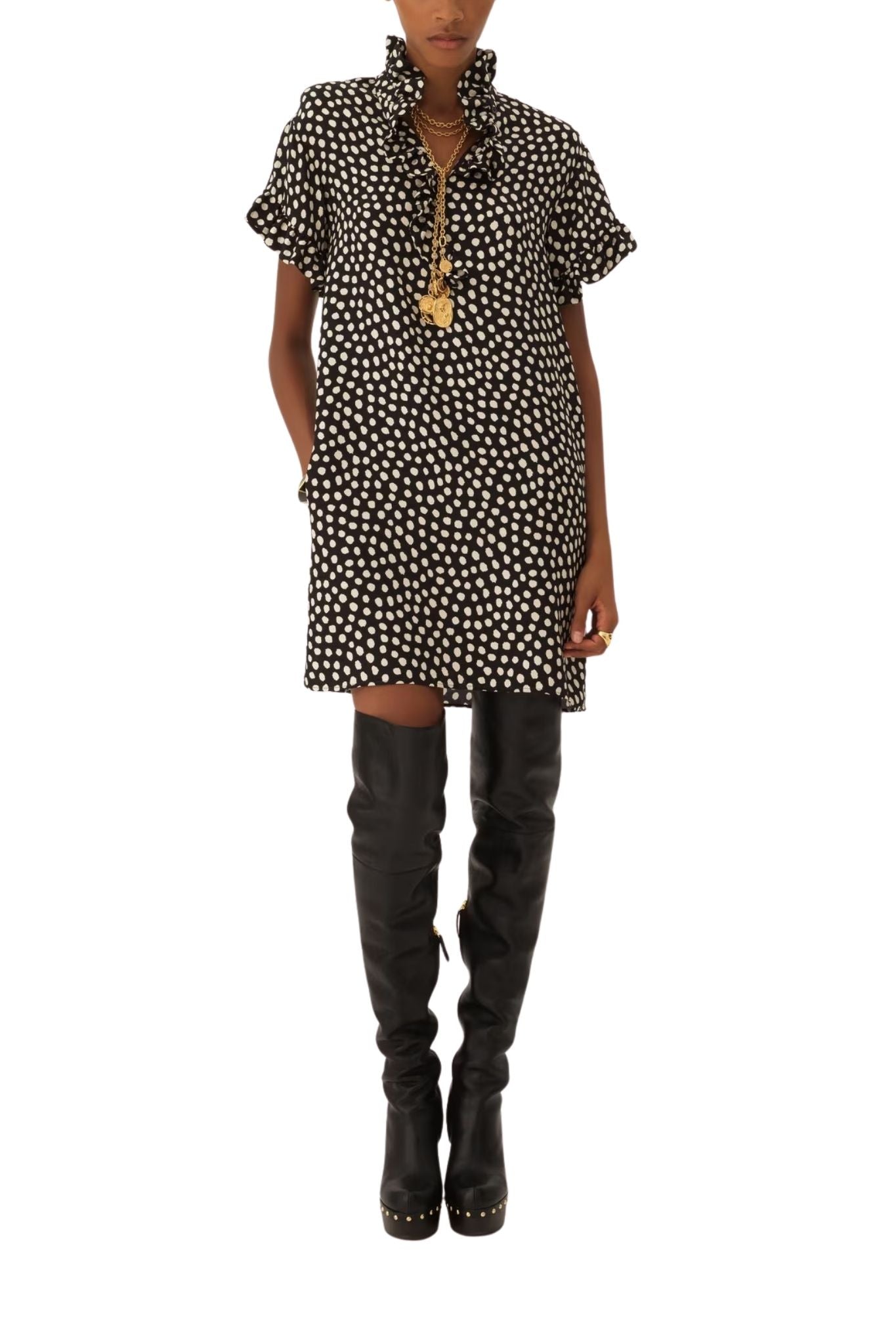 V-neck mini dress in silk jacquard with a dots print, featuring maxi short sleeves, ruffles and mother-of-pearl buttons.
