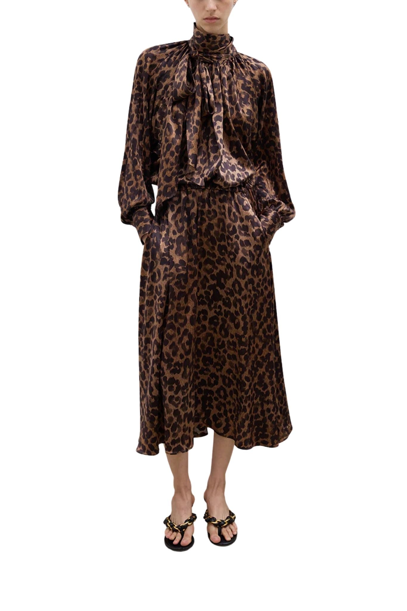 Susan dress by Françoise, made from a silky, lightweight leopard-print fabric. A flared midi dress with a lavallière collar and slightly puffed sleeves.