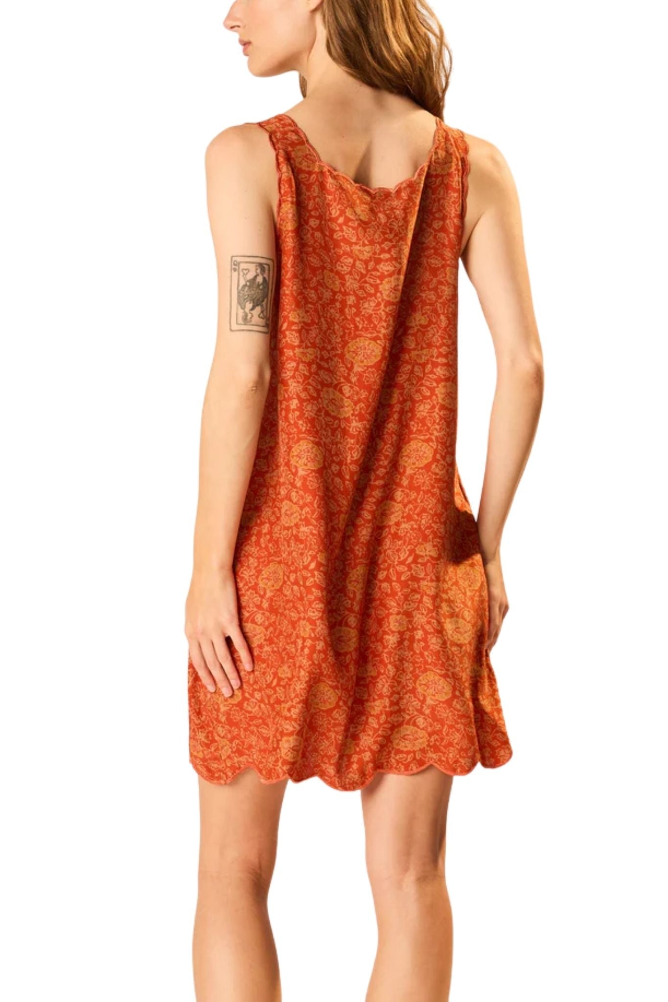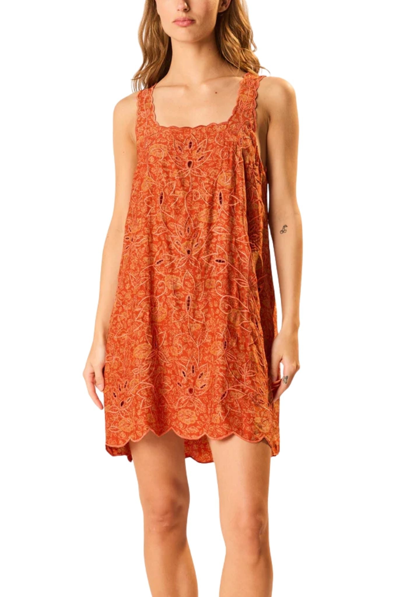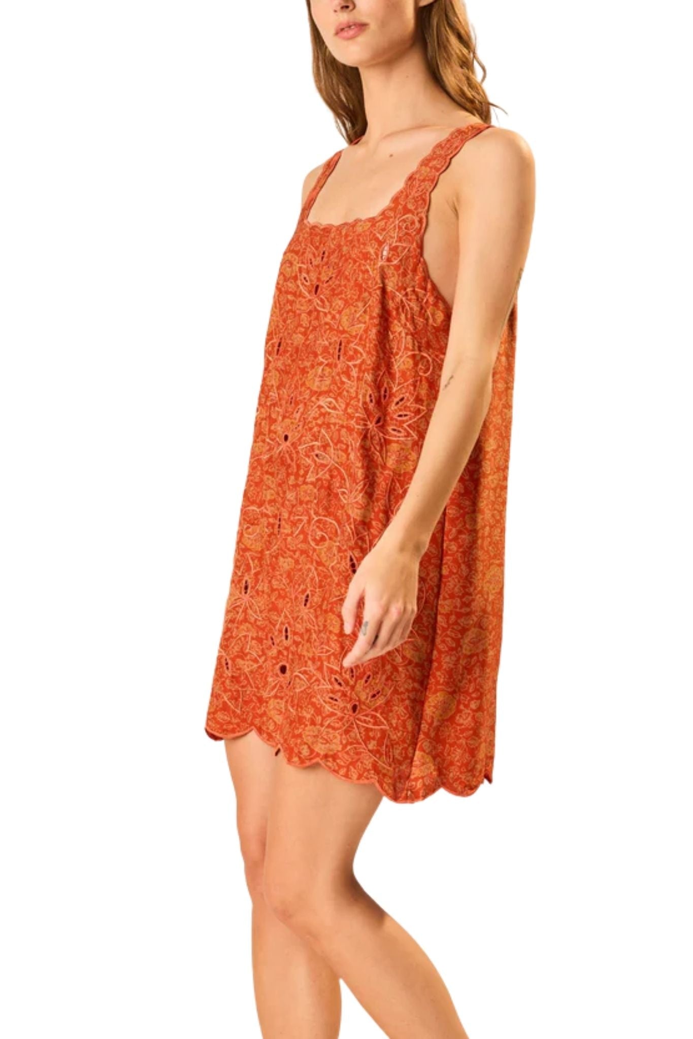Short-length slip dress featuring thick scalloped straps and square neckline. Eyelet details and a scalloped hem.