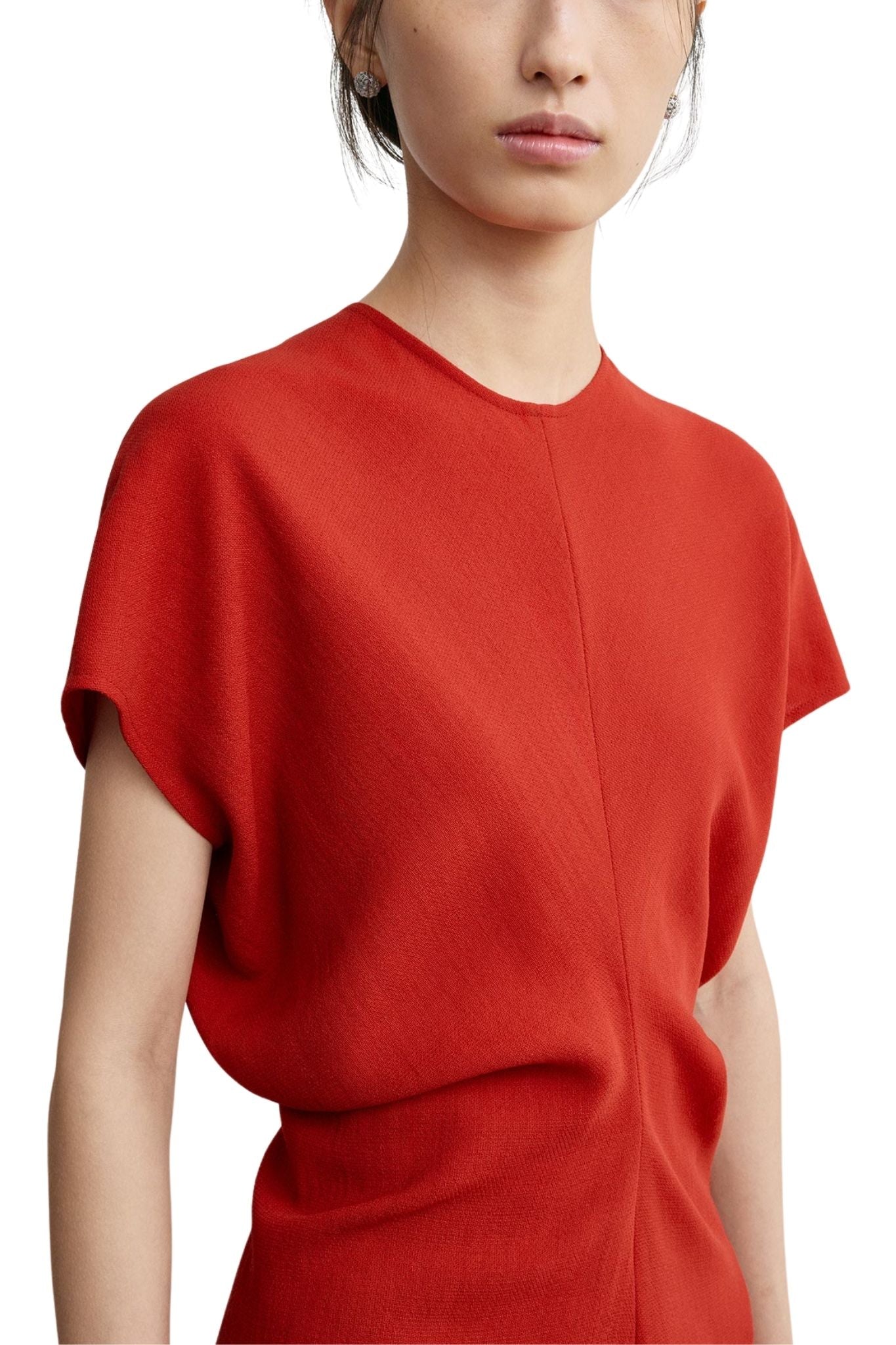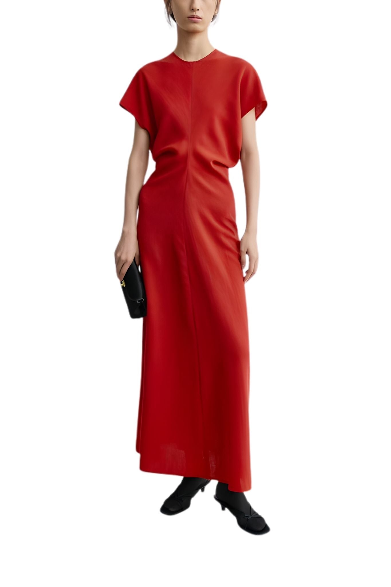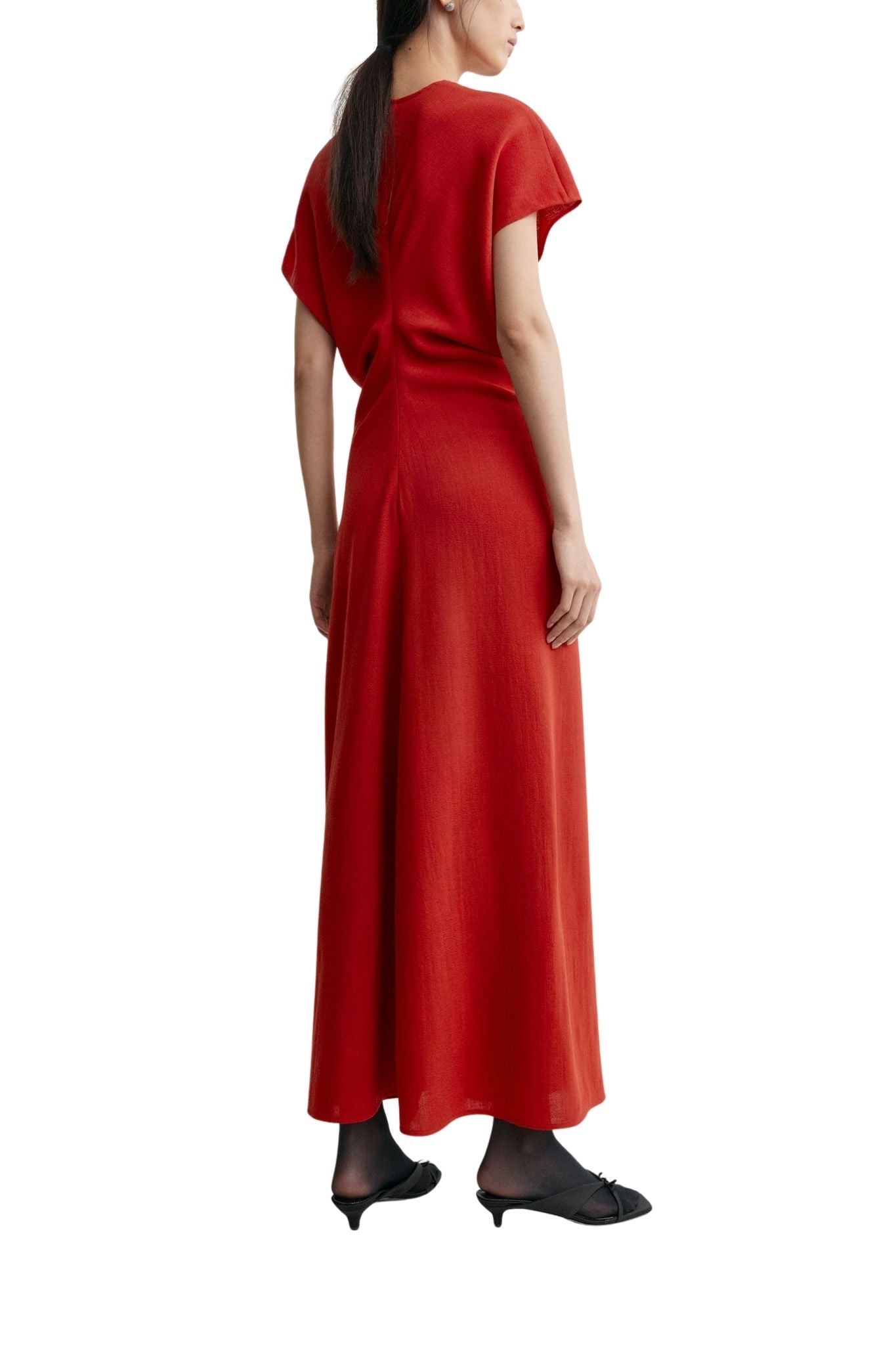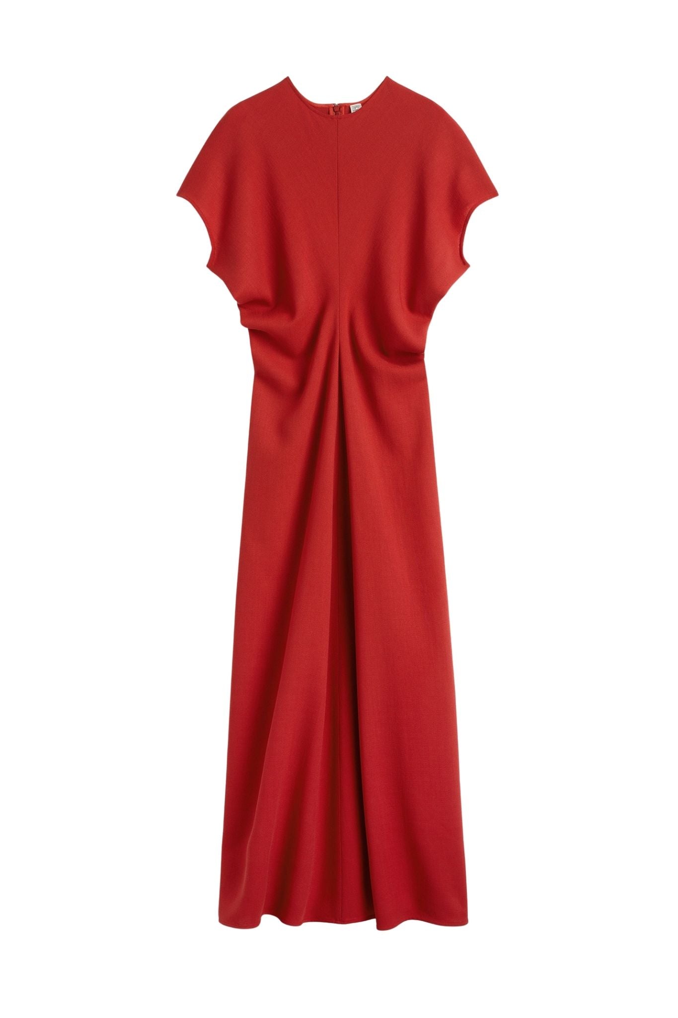 This slouchy waist dress features two curved panels sewn together to create sculptural pleats. Reimagined for winter, it is crafted from luxurious wool in a basketweave pattern. Pair with delicate accessories for a refined look at any special occasion.