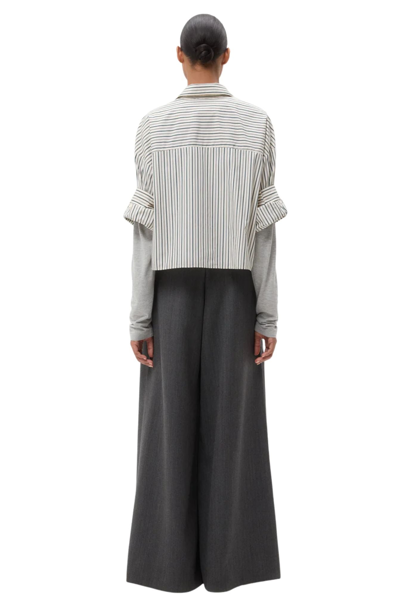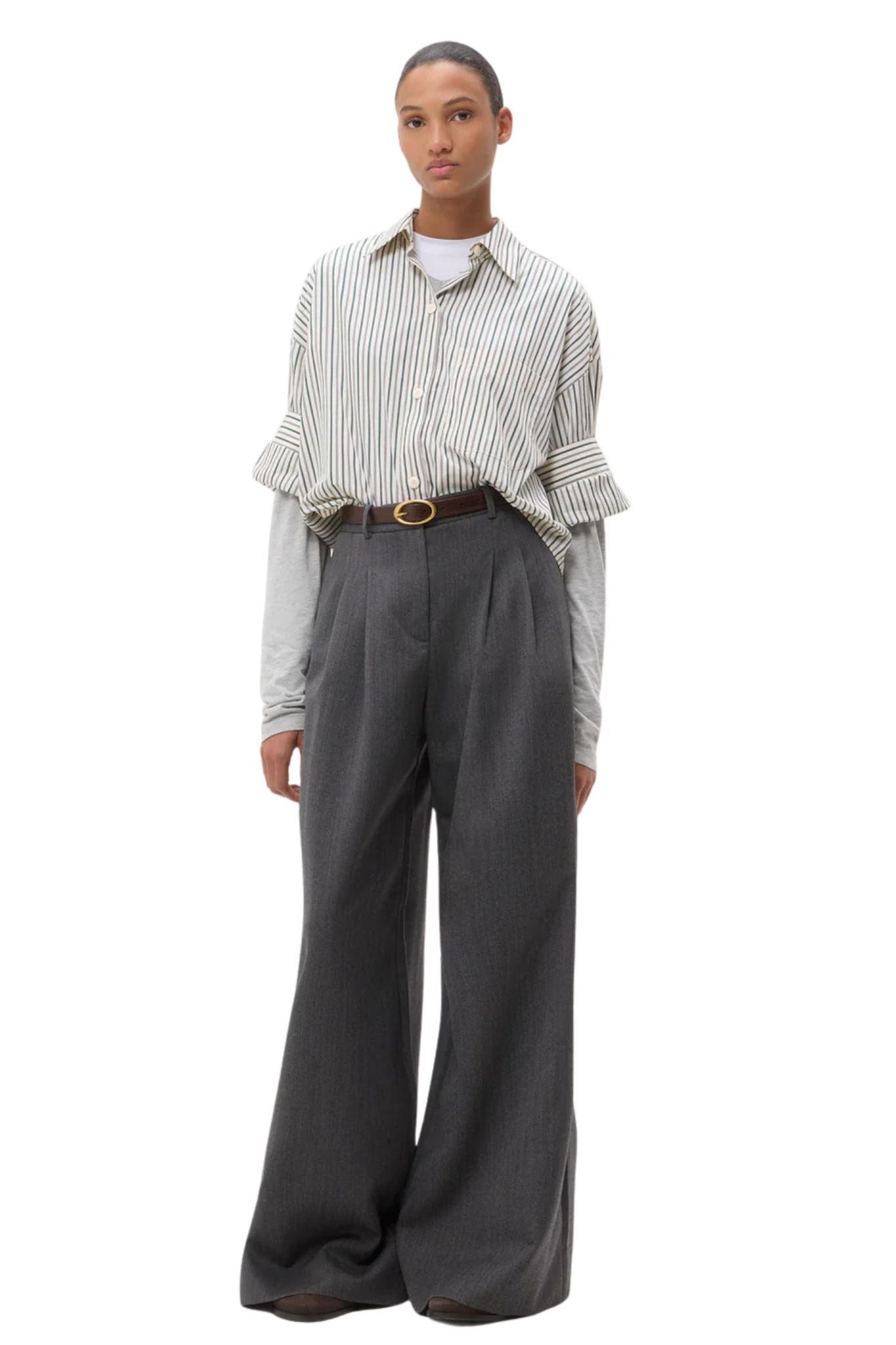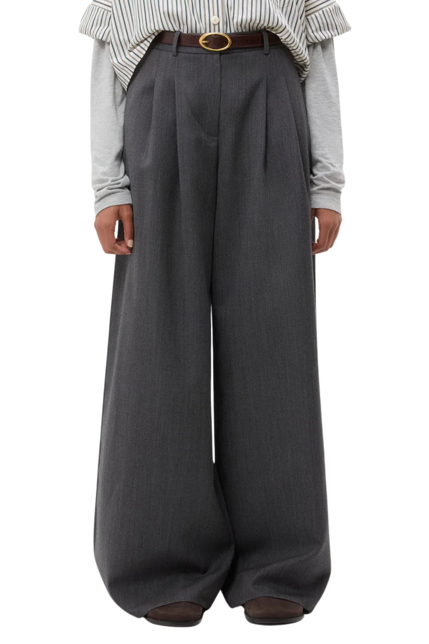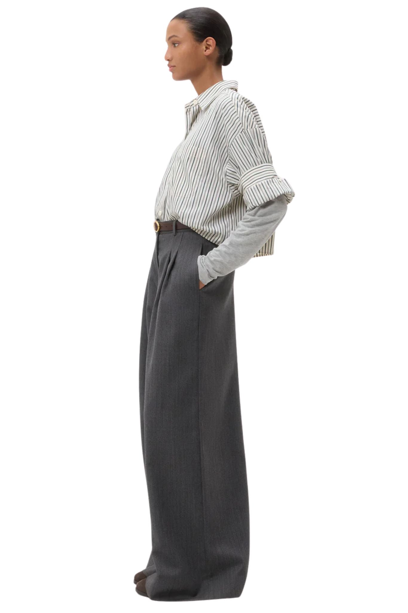 Mid-rise, wide leg pleated pant in stretch wool suiting. This fabric is a viscose/wool blend with a bit of stretch for comfort. The Avery is relaxed through the hip and leg. Complete with side pockets, back welt pockets, belt loops, concealed zip, and hook and eye closure.