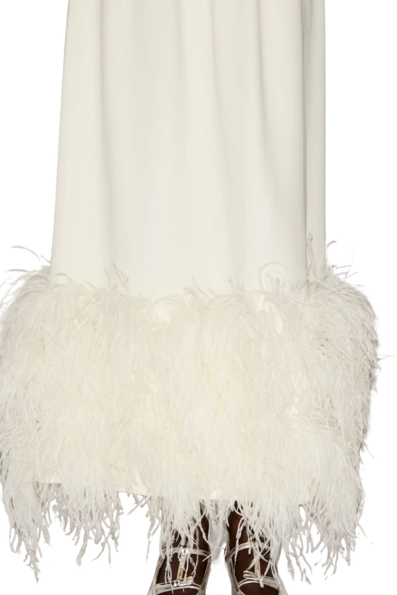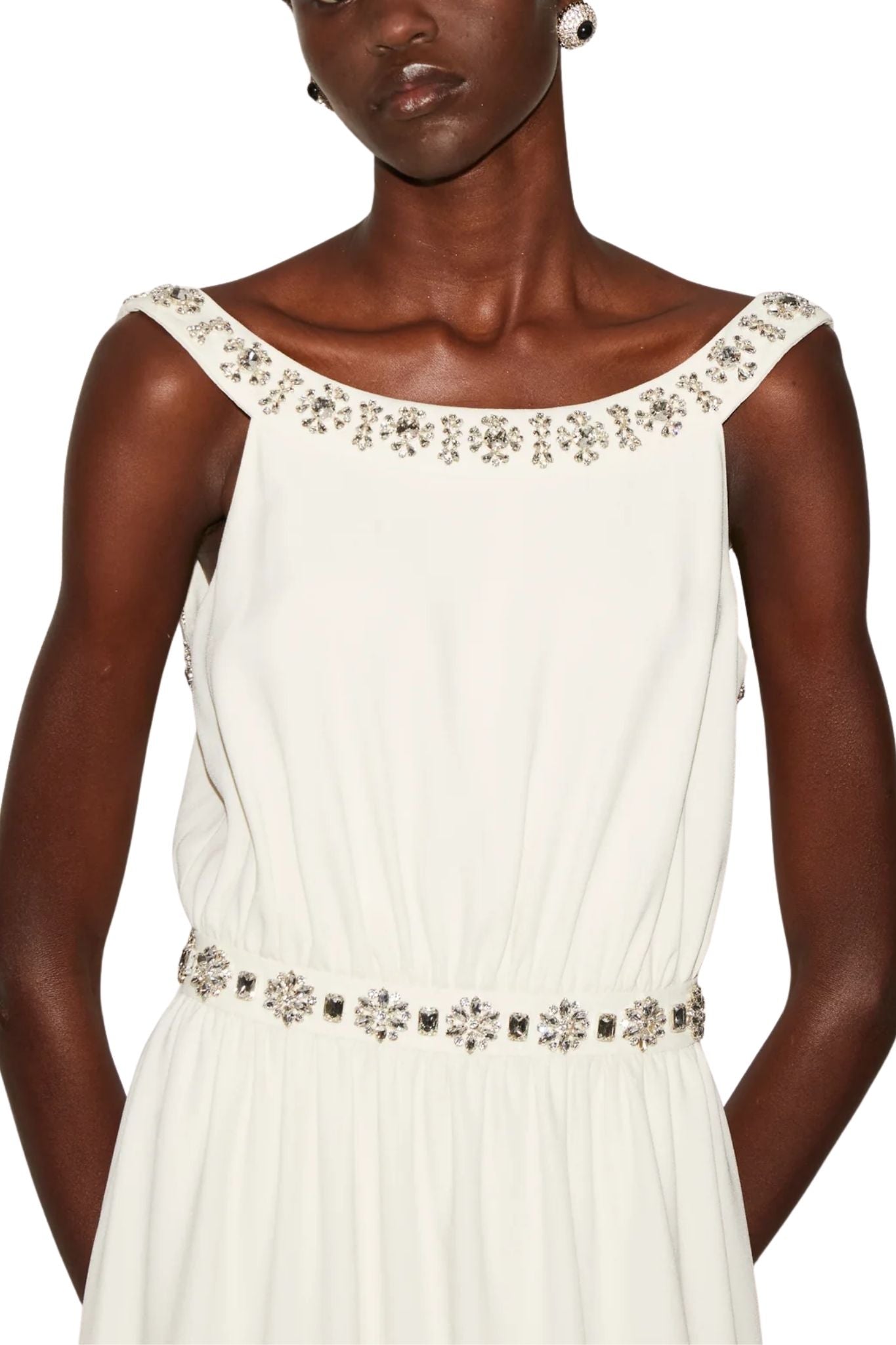 The Romina Gown captures timeless sophistication with a modern touch of playfulness. Cut from fluid buttercream sablé, the gown features a softly gathered silhouette defined by a crystal-embroidered neckline and waistband that highlight the natural waist.