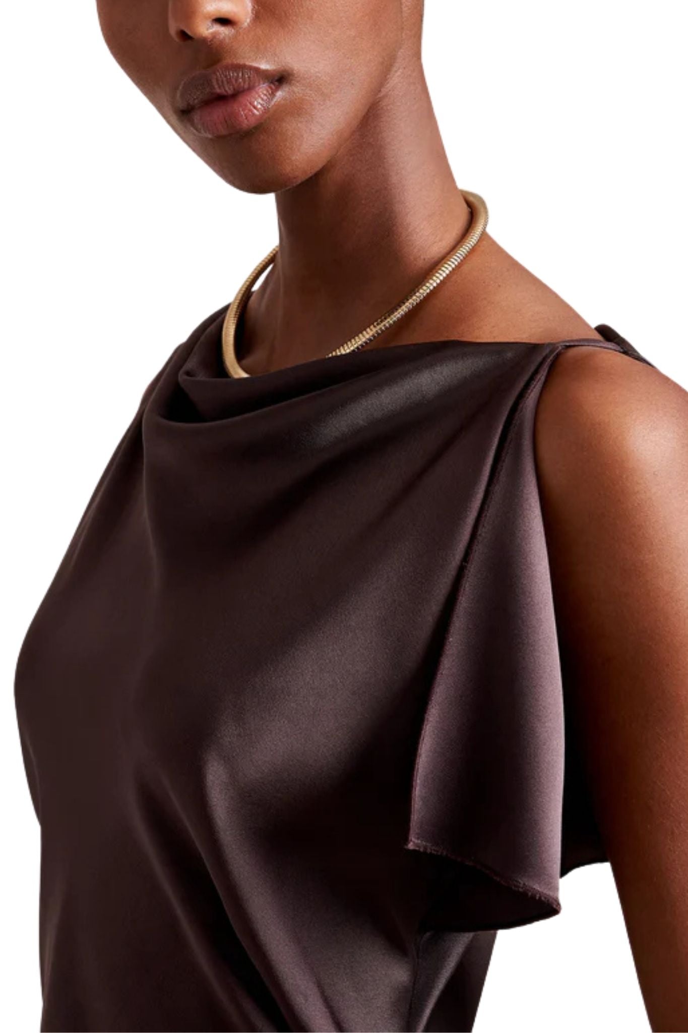 This chocolate brown, satin midi-length dress drapes beautifully with a modern, asymmetrical neckline and a subtle split sleeve that reveals just enough. Soft side ruching at the wearer’s right gently shapes the waist, offering a flattering silhouette without clinging—so you still get that effortless comfort you know us for.