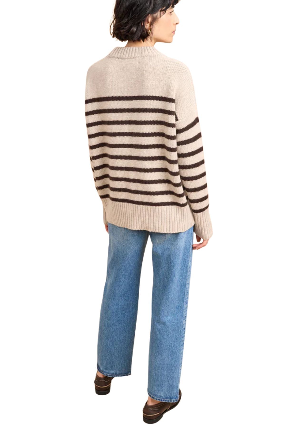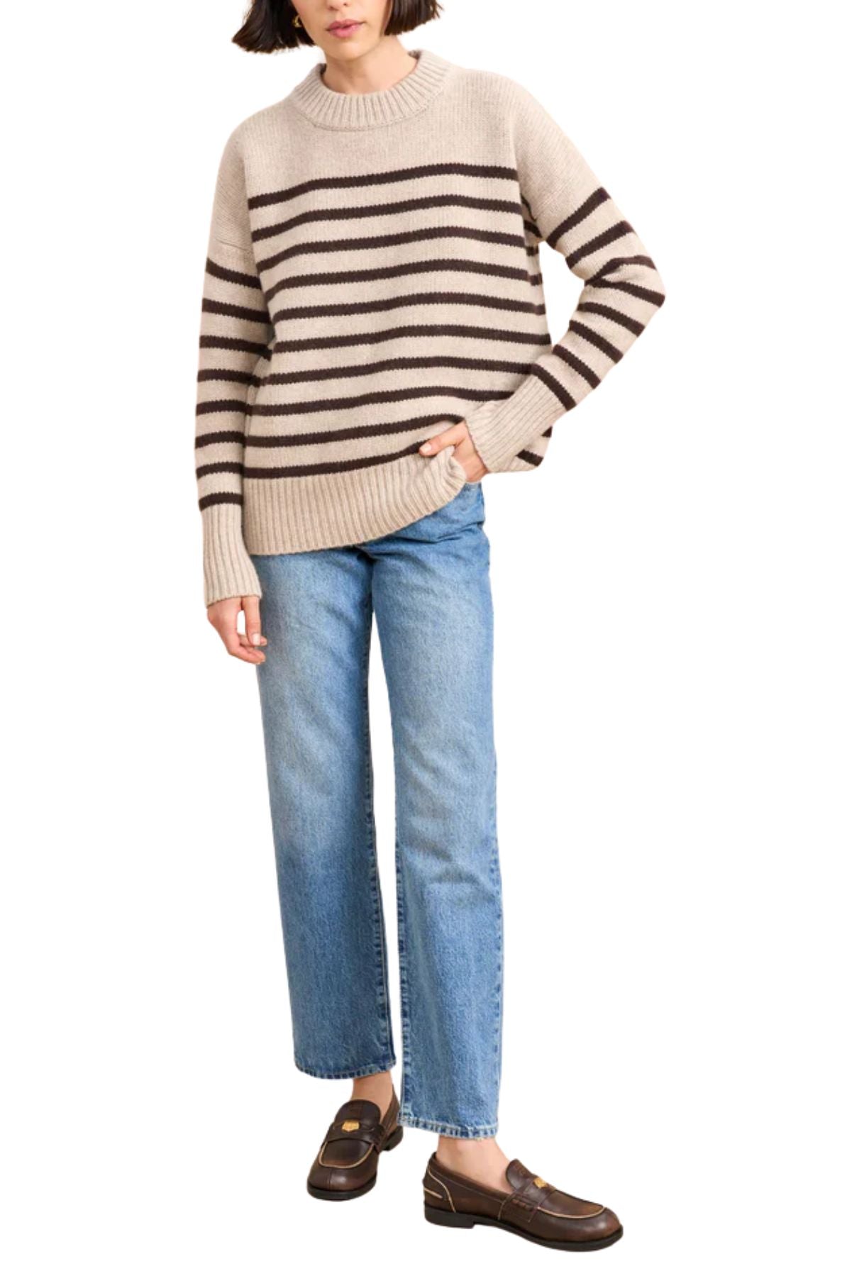 Get on board with our tan and chocolate stripe, 7-ply wool-cashmere sweater. Comfort and style, not mutually exclusive.