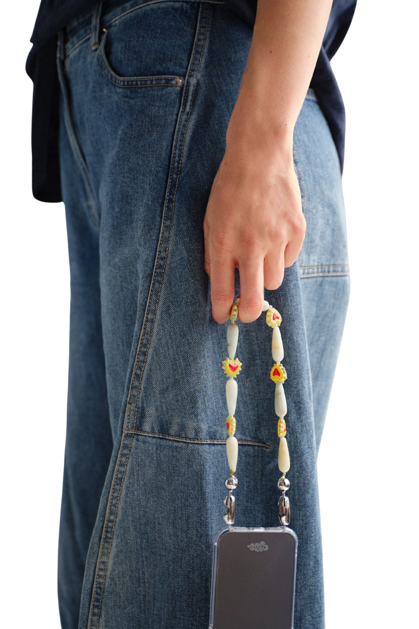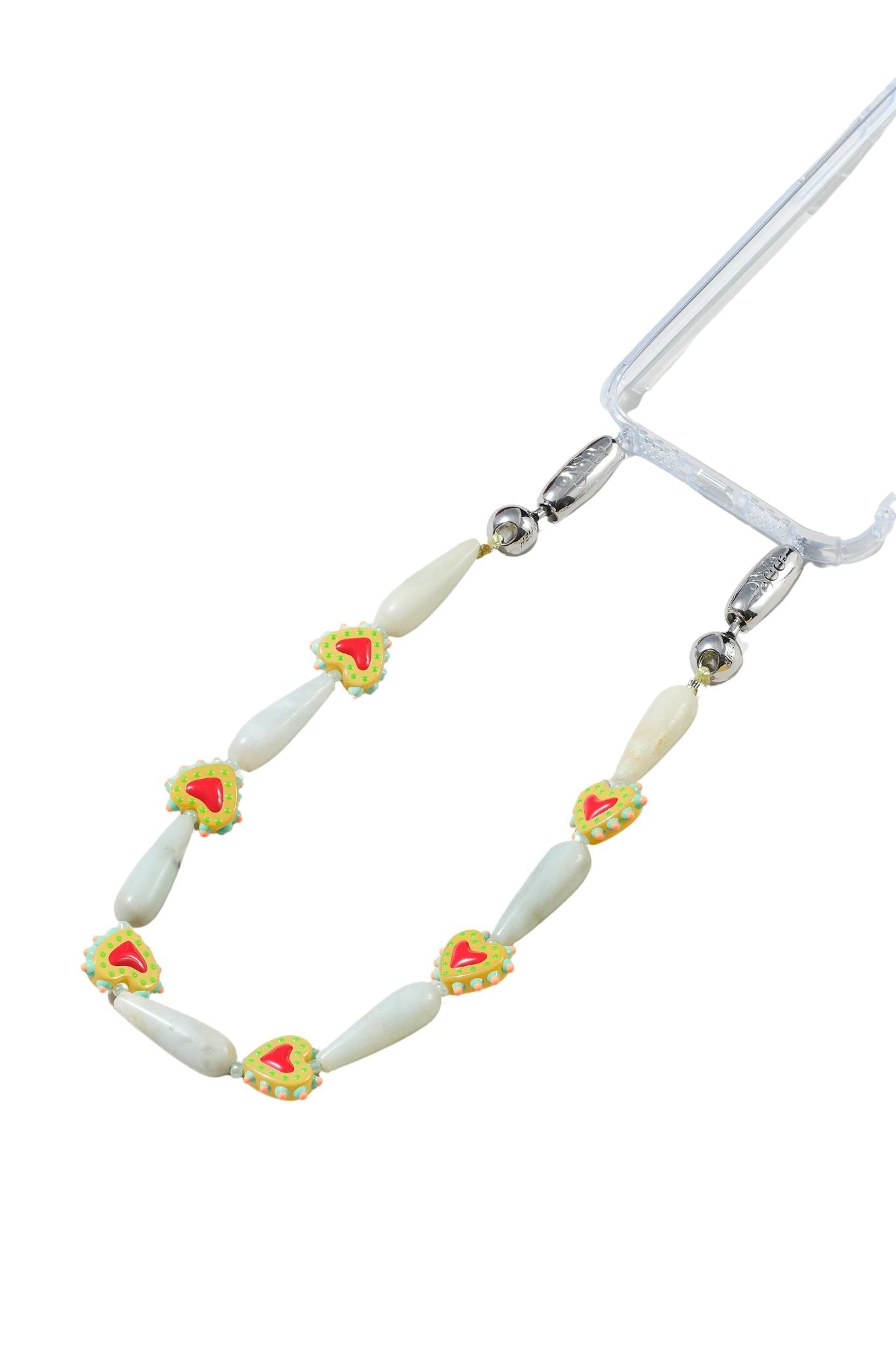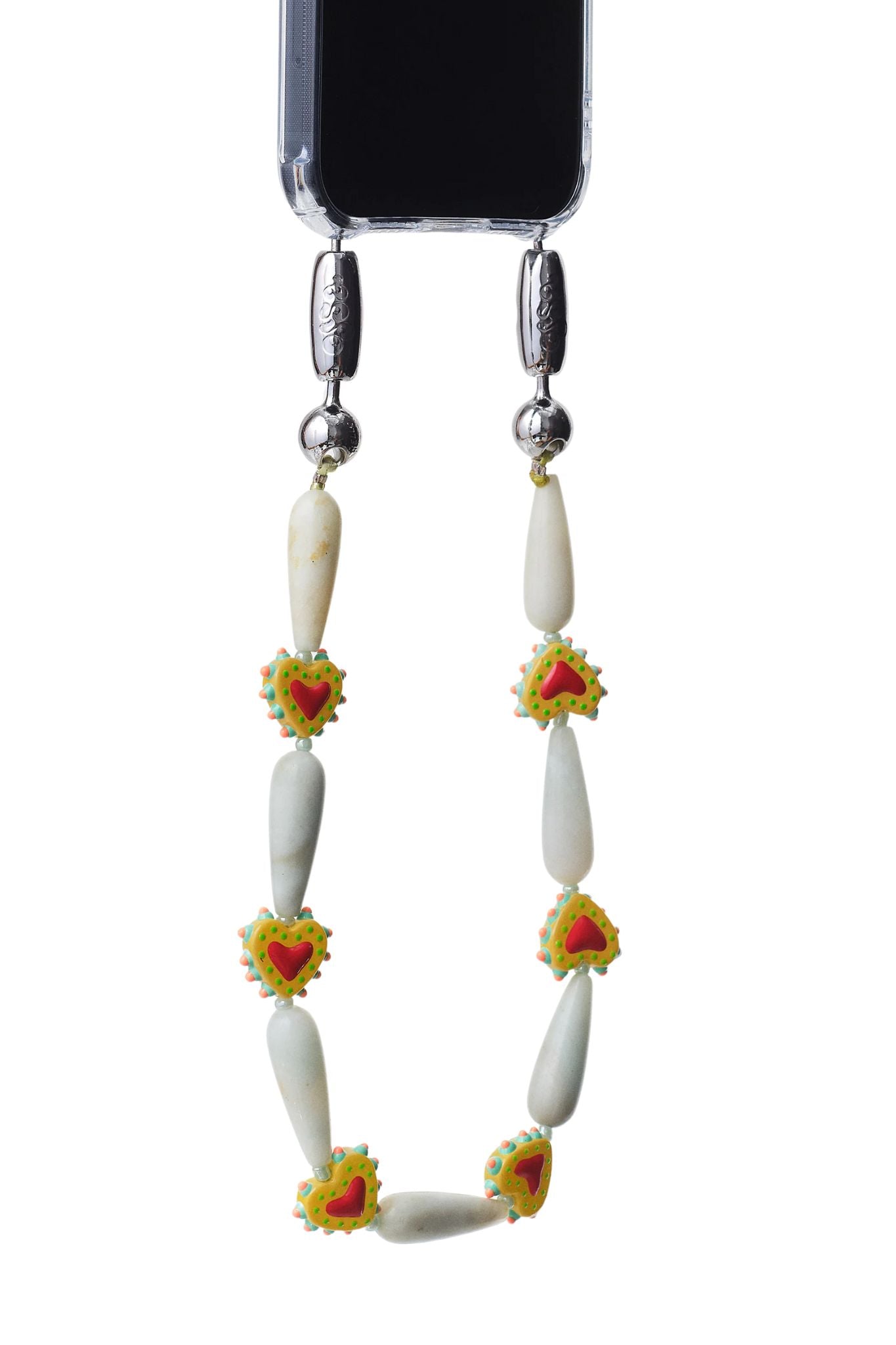 Carved teardrop gemstone beads strung together with western heart motifs.