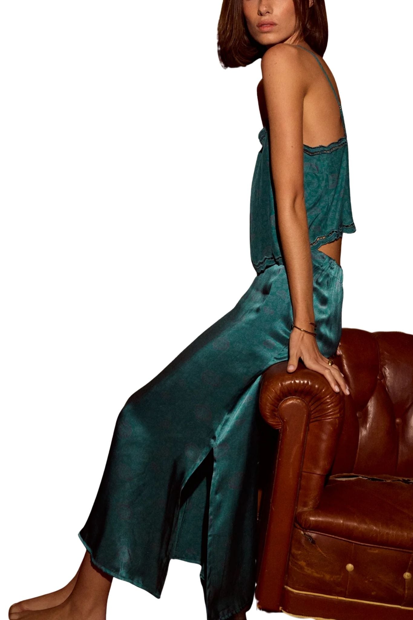 Loose-fit pencil skirt with a side slit, elastic waistband at the back, and zipper closure.
