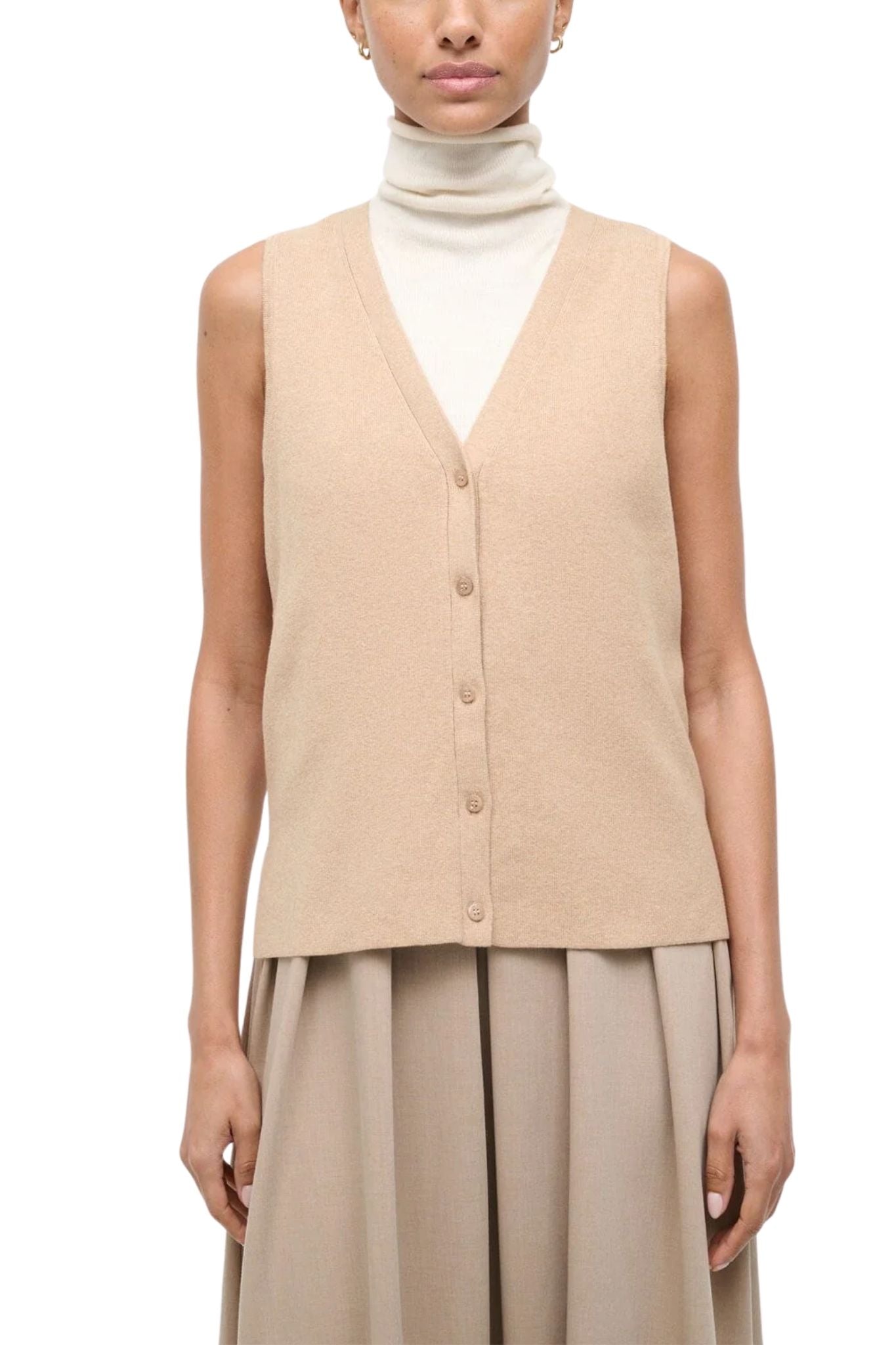 The perfect transitional dress, this pre-styled cotton and cashmere piece offers a pre-styled woven skirt and fully fashioned sleeveless knit vest.