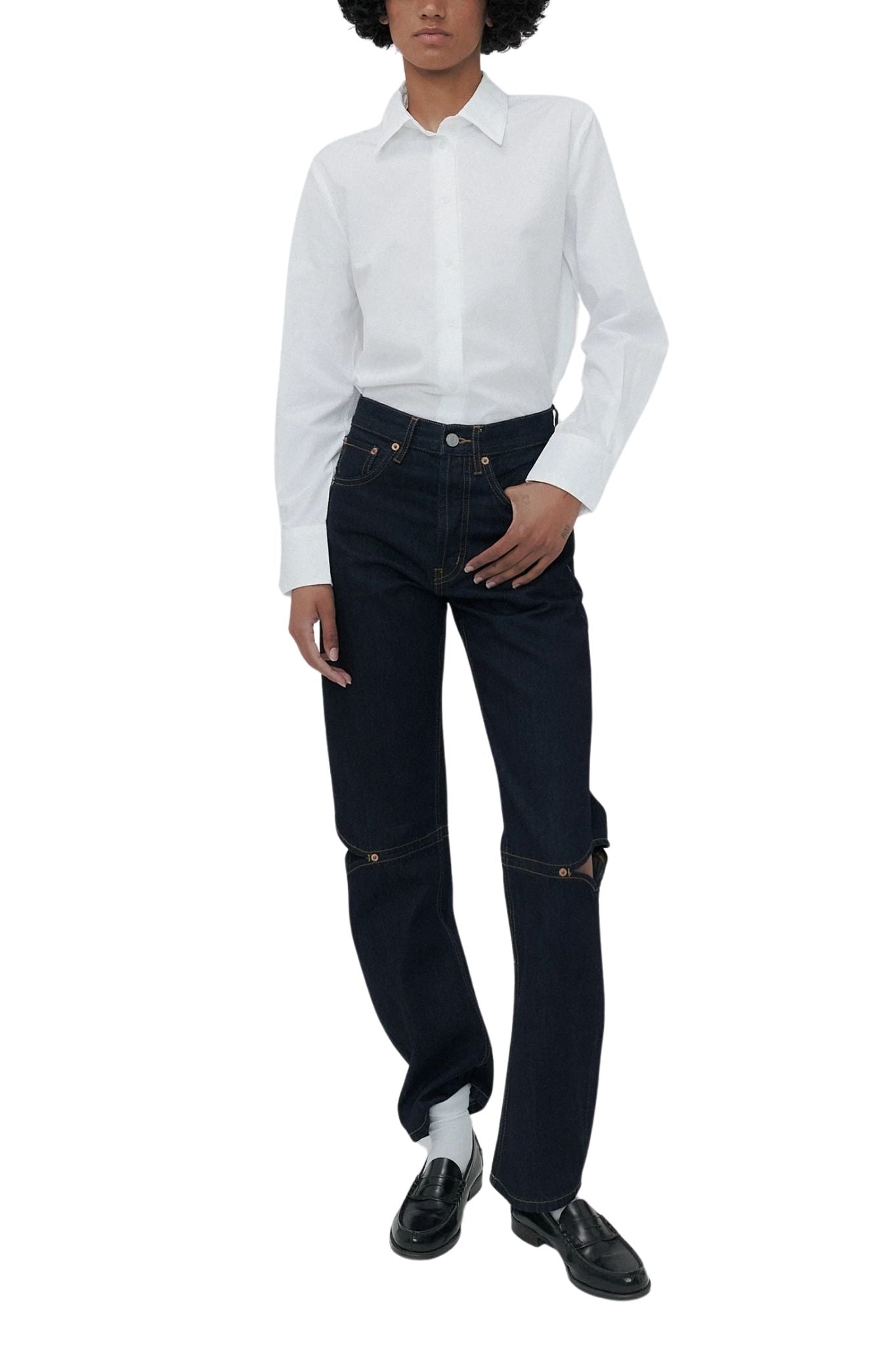 The Cowgirl Jean is inspired by horseback riding cowgirls of the late 19th century. This jean features an inward angled leg and diamond cut-outs on the side knee. These cut-outs are secured with our custom rivet hardware. It features a classic button fly, custom hardware and our signature 'SH' embroidery.