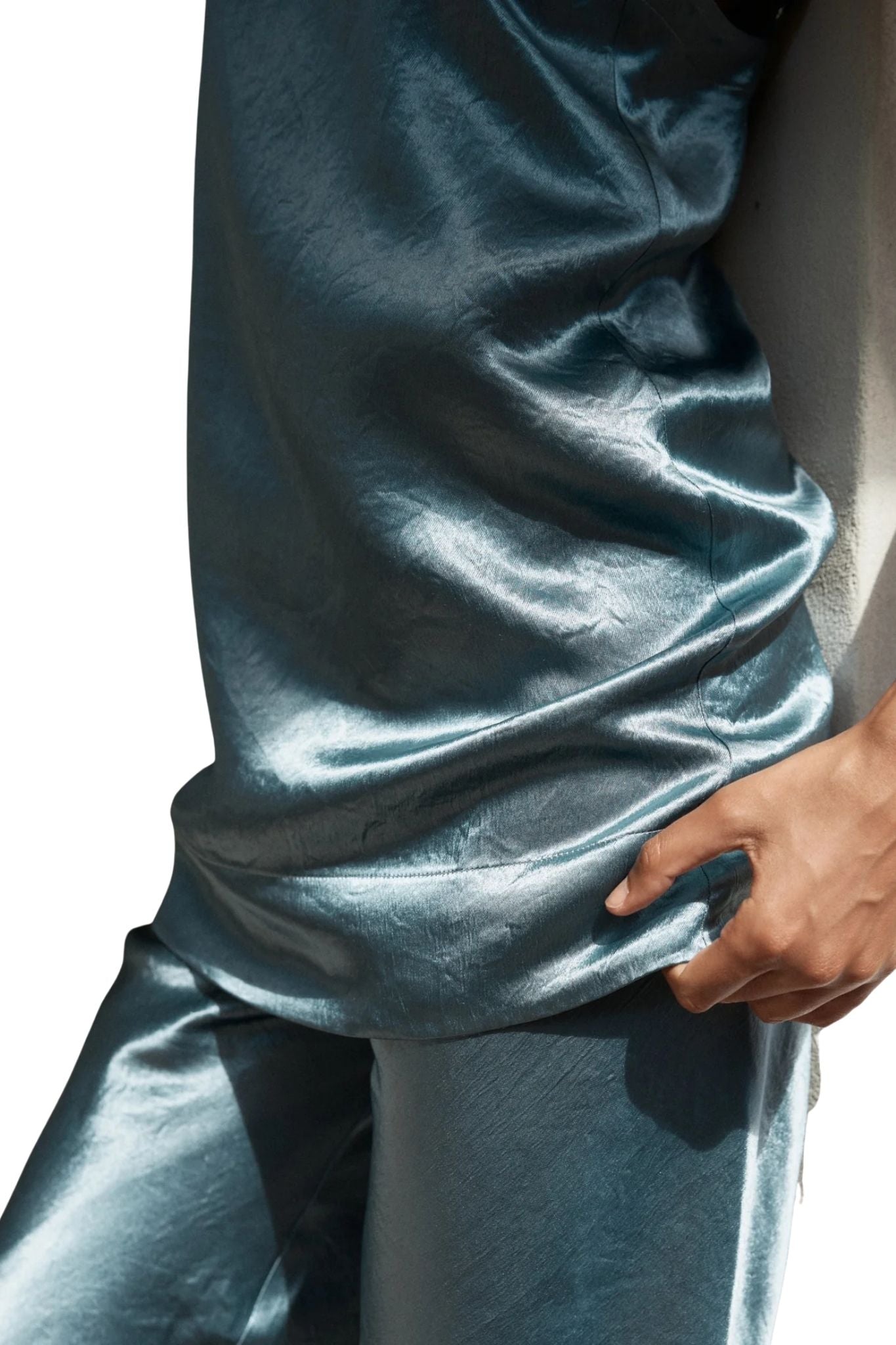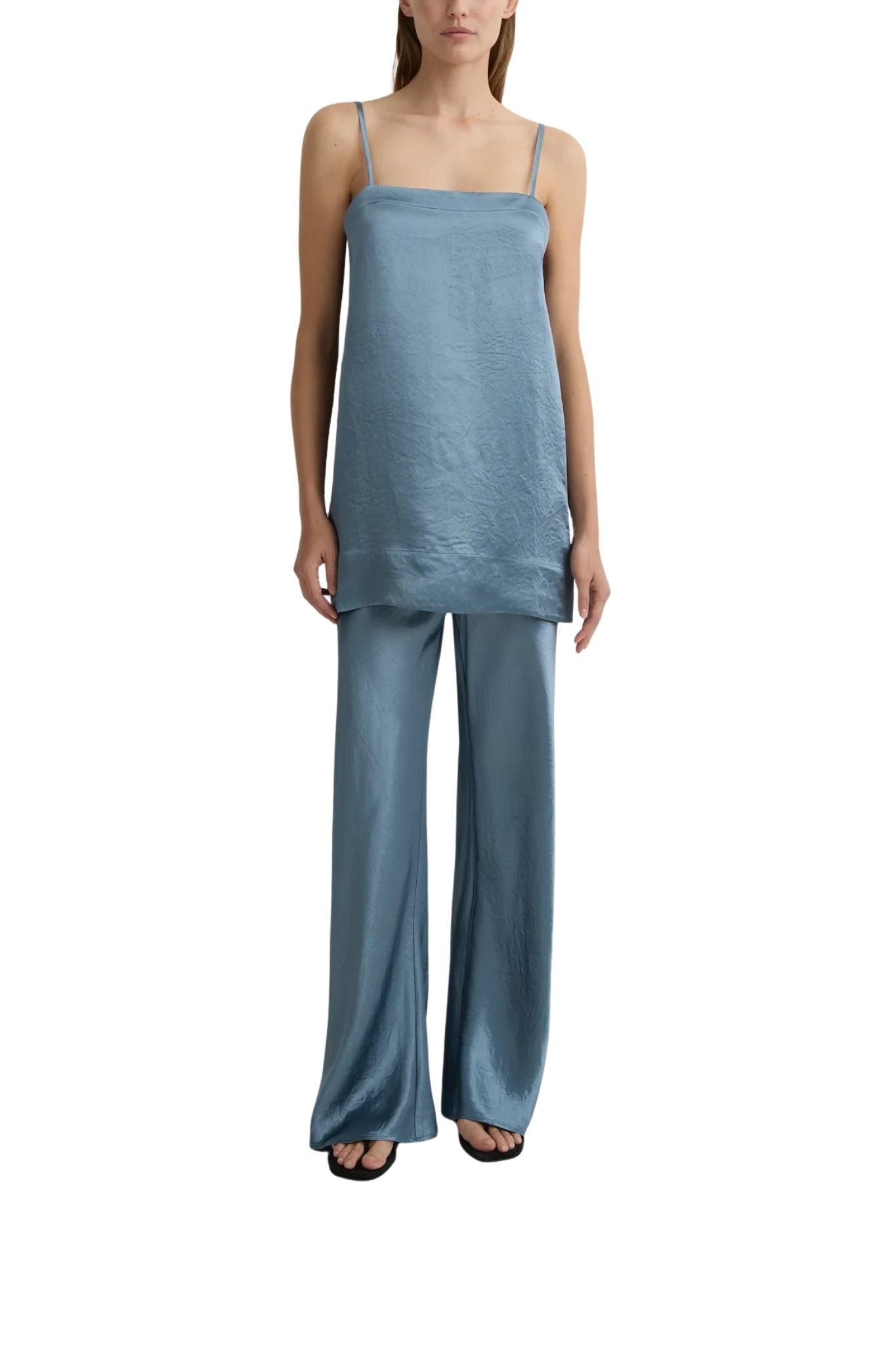 The Kobe Mini Slip Dress in Steel Blue is a minimalist silhouette, crafted from Japanese Naia™ acetate satin with a subtle sheen. Featuring a straight neckline and slender adjustable straps, this effortless mini falls straight from the hip for a relaxed fit. Wear alone for understated elegance or layered over our Kobe Bias Pant for a statement resort look.