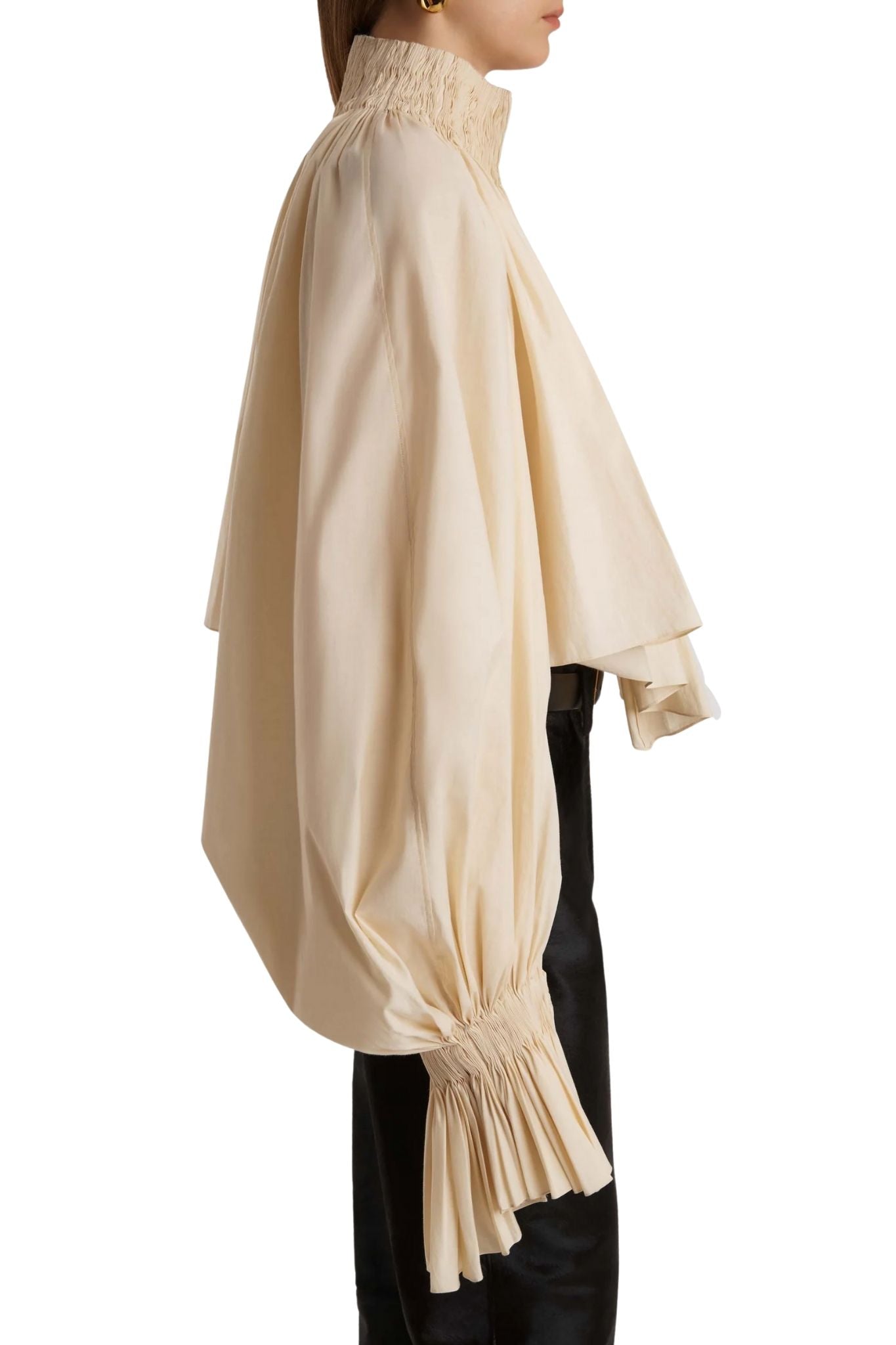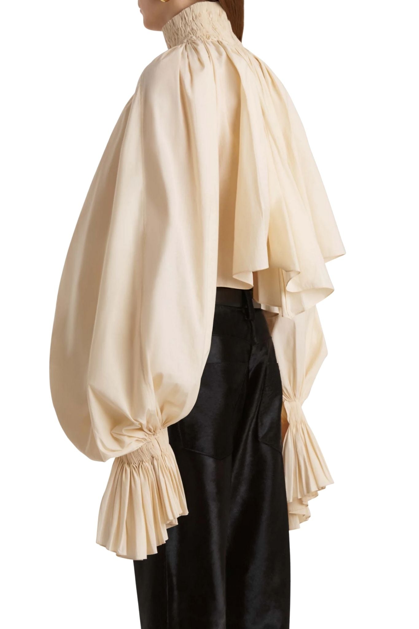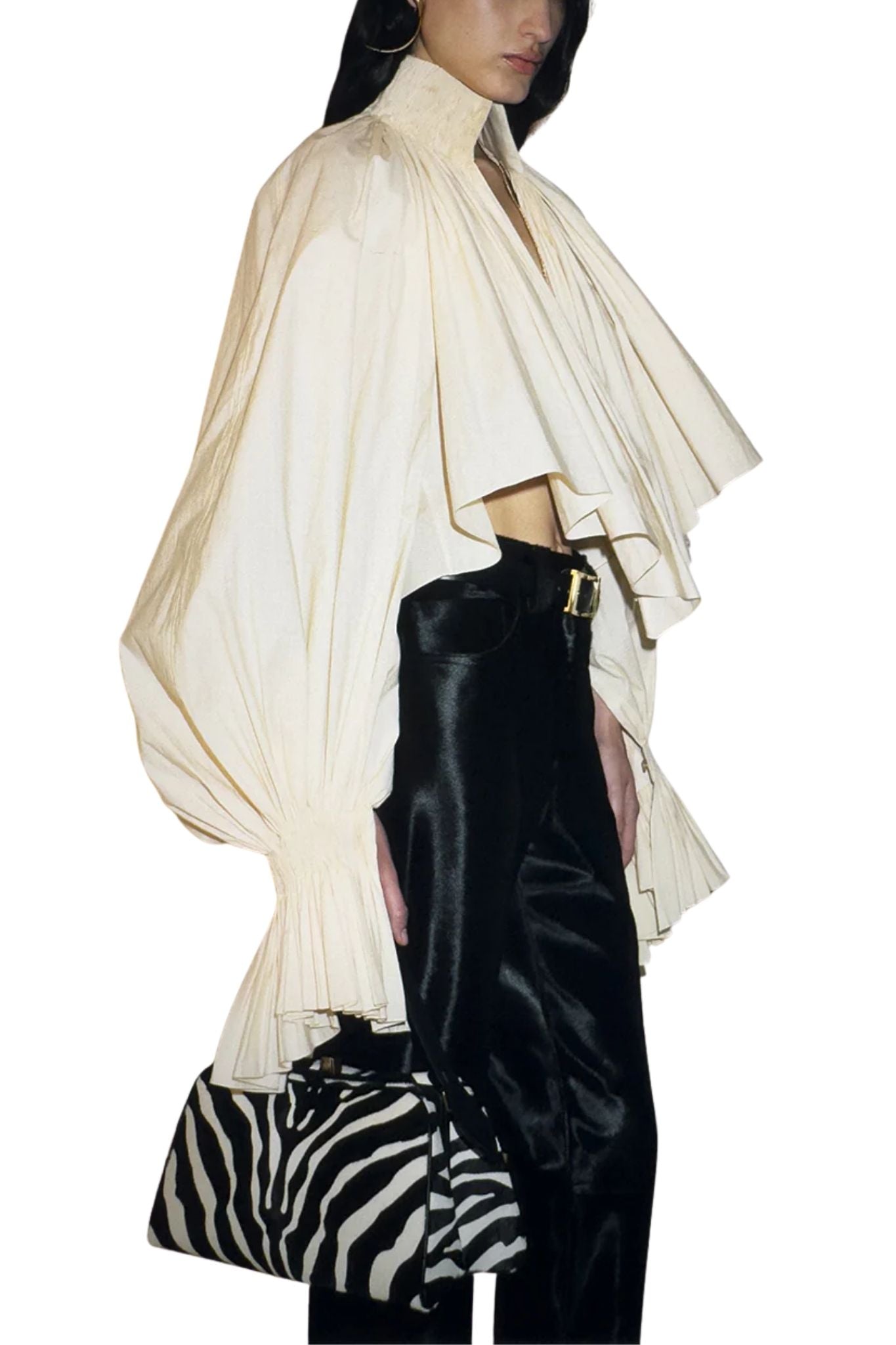 Fusing ‘90s grunge with a bohemian spirit, this fluidly formed shirt is framed by a high stand collar for a regal bearing. Cutaway silhouette animated by hand-crushed cartridge pleating, with billowing sleeves cinched at the wrist. Wear with slit neckline at front or back.