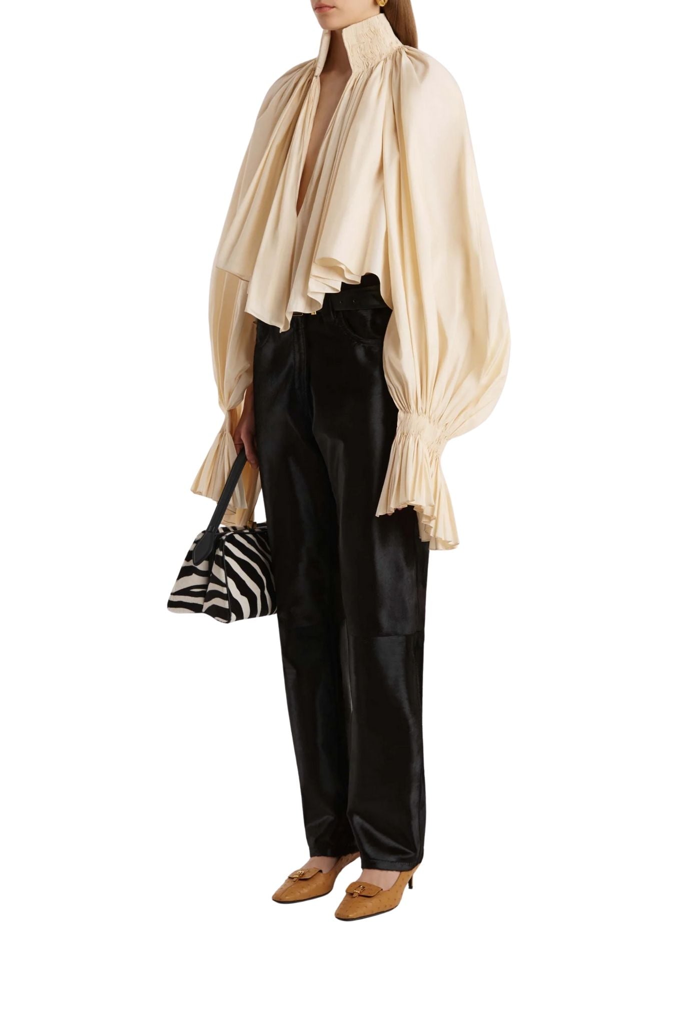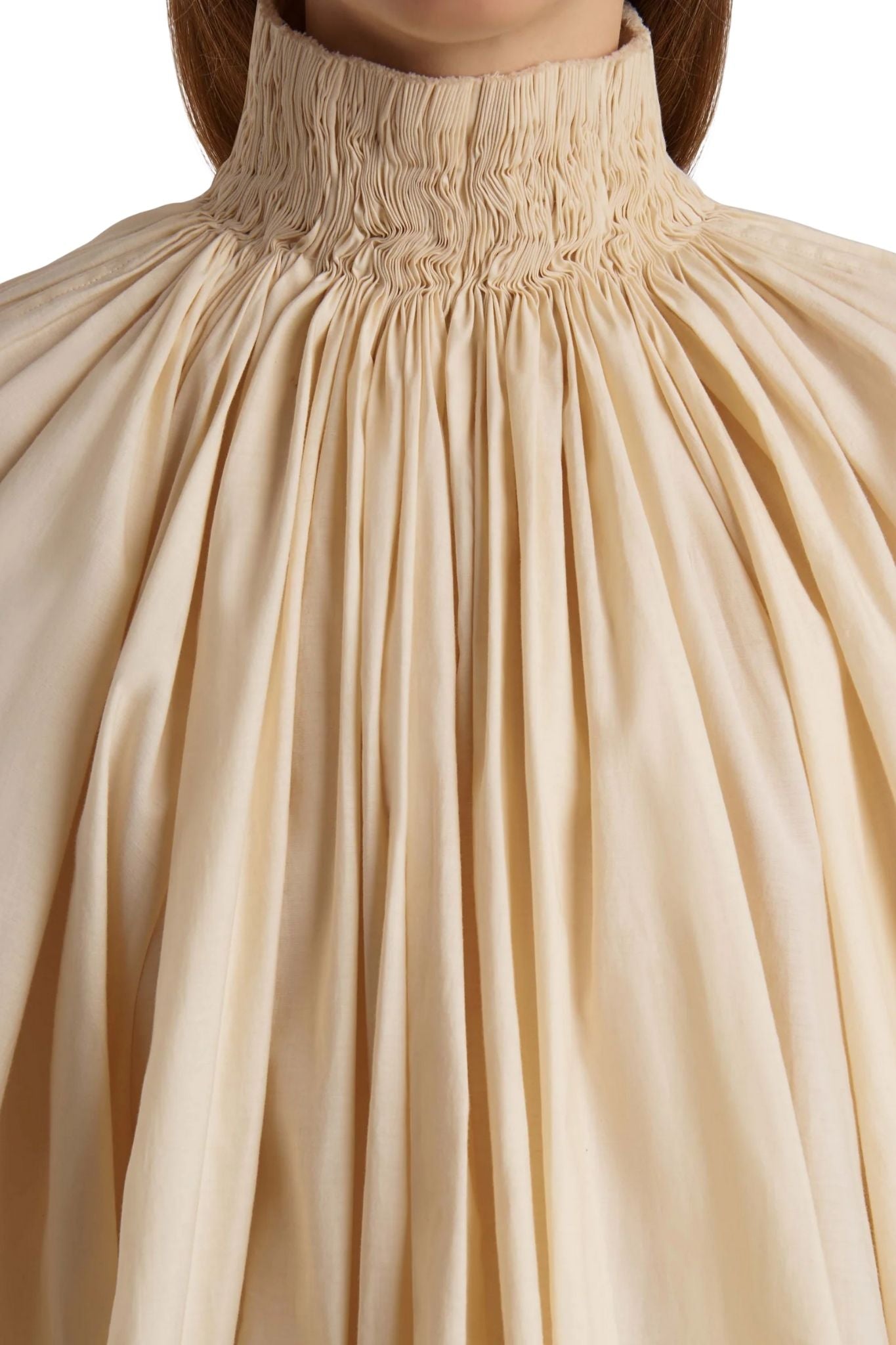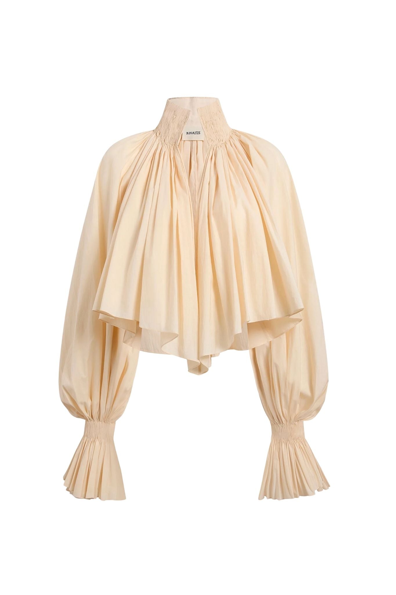 Fusing ‘90s grunge with a bohemian spirit, this fluidly formed shirt is framed by a high stand collar for a regal bearing. Cutaway silhouette animated by hand-crushed cartridge pleating, with billowing sleeves cinched at the wrist. Wear with slit neckline at front or back.