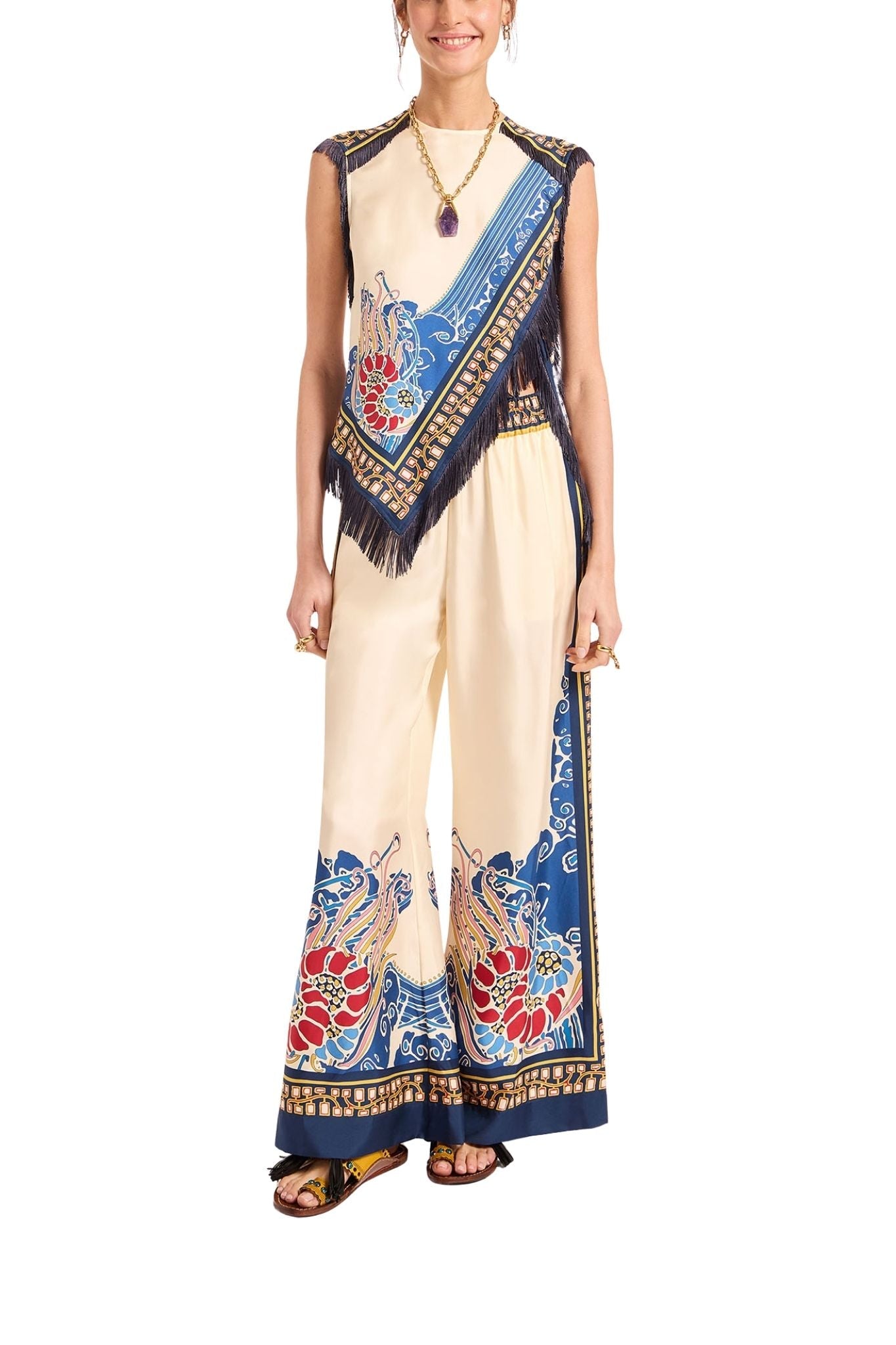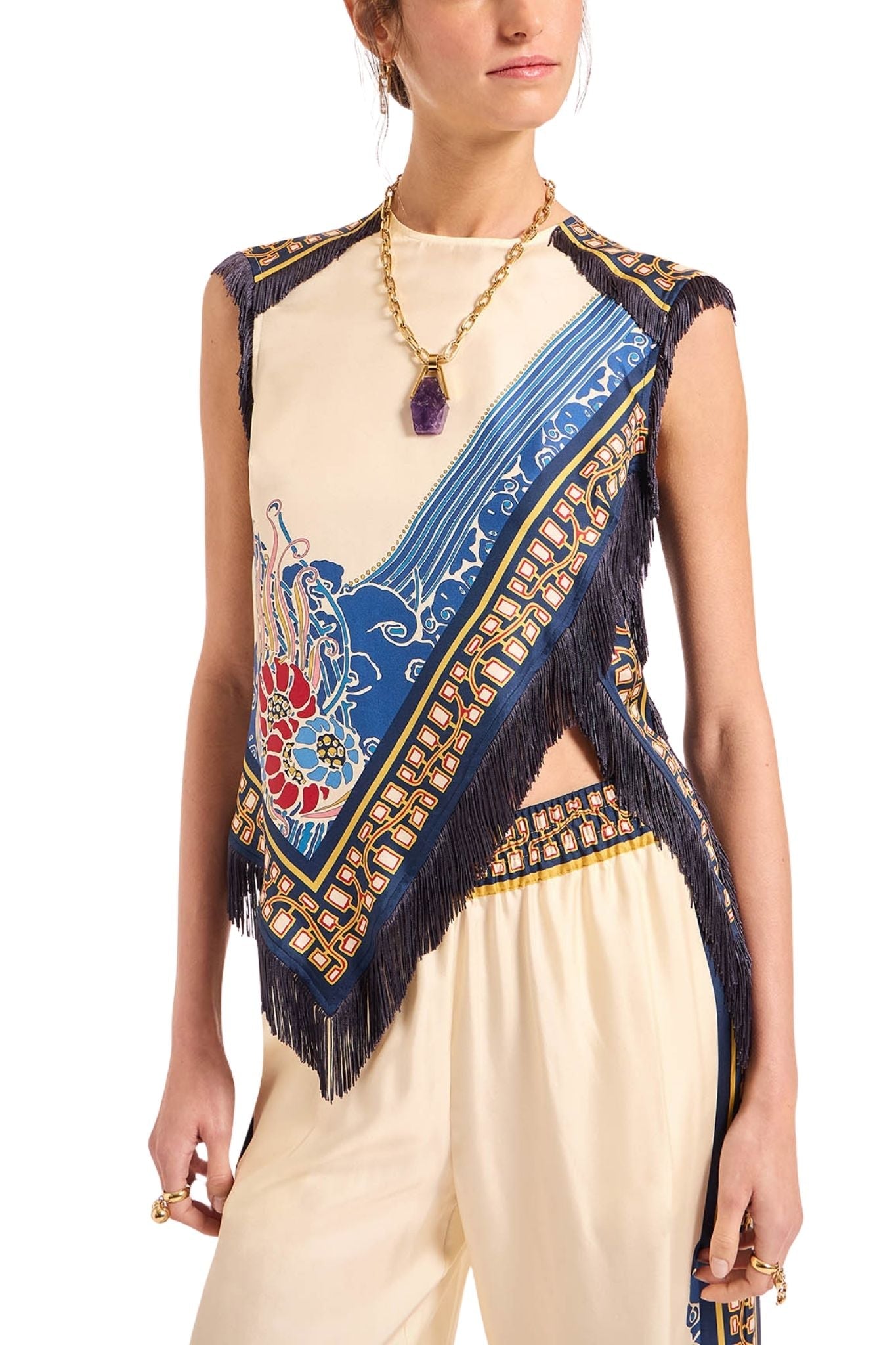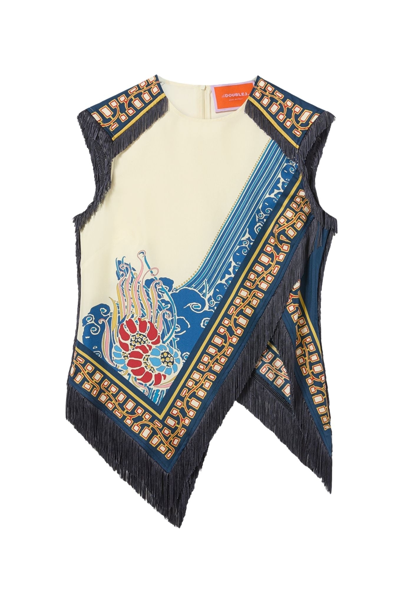 Sometimes we like to show off. Such is the case with this stunning Scarf Top, a stunning example of our Italian artisans’ exceptional craftsmanship, woven together for a contrasting foulard effect with fringe detailing across the armhole and hem. We love the asymmetrical hem and the mini cap sleeve that delivers a strong warrior-queen silhouette. Wear it with the Scarf Skirt for full foulard fabulousness.