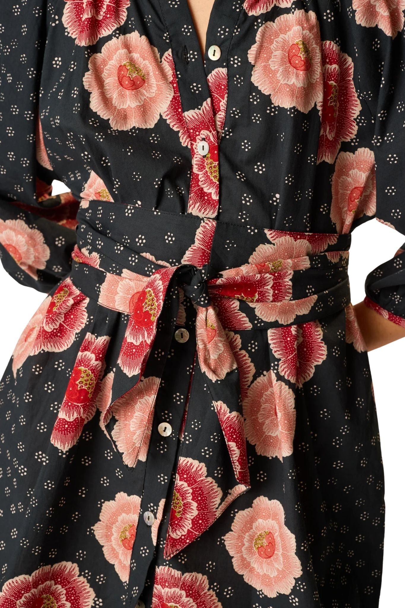 Short dress with 3/4 length sleeves. Collarless neckline with slight pleating for fullness. Shell buttons run all down the front. Comes with removable sash belt.