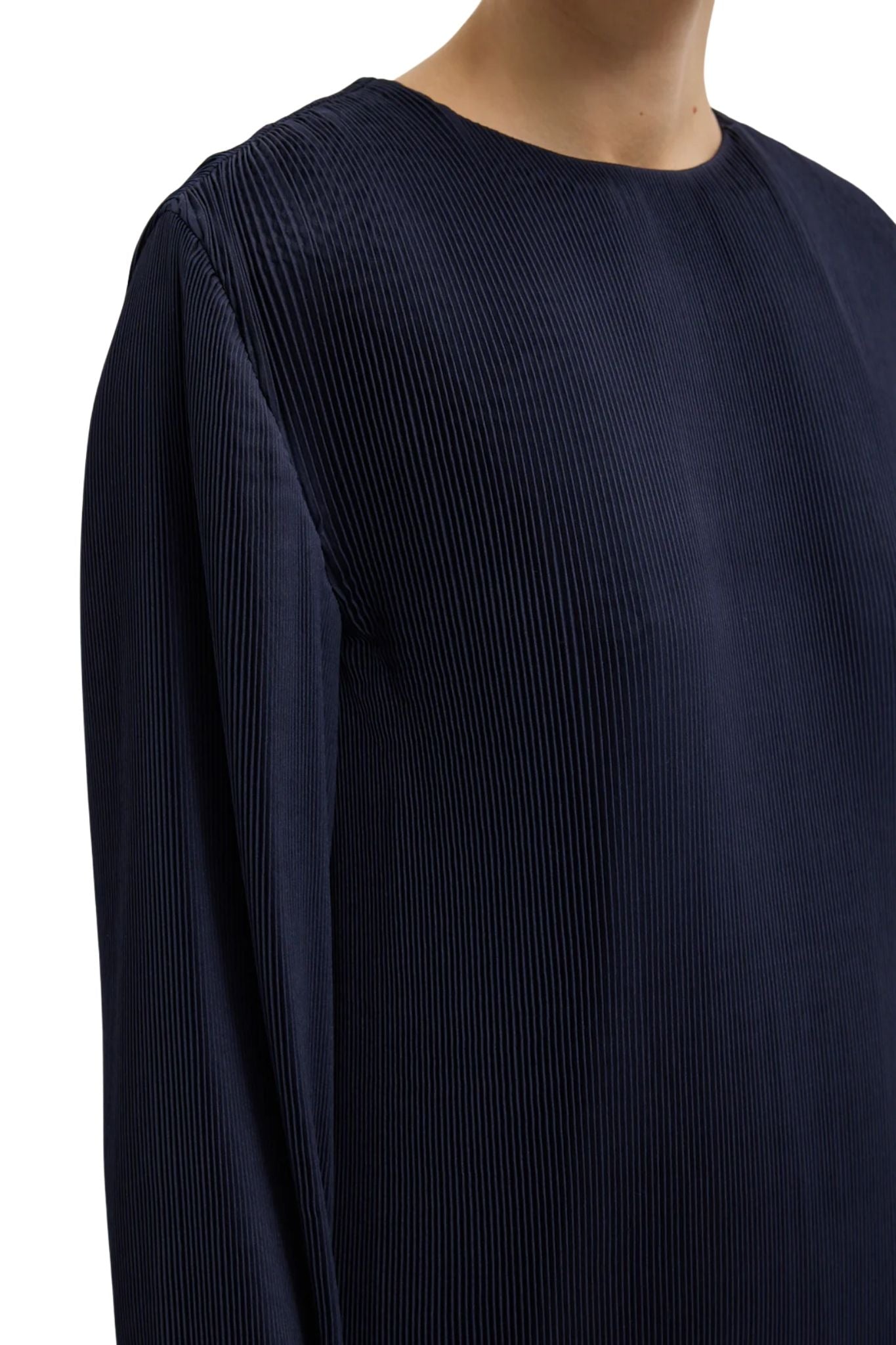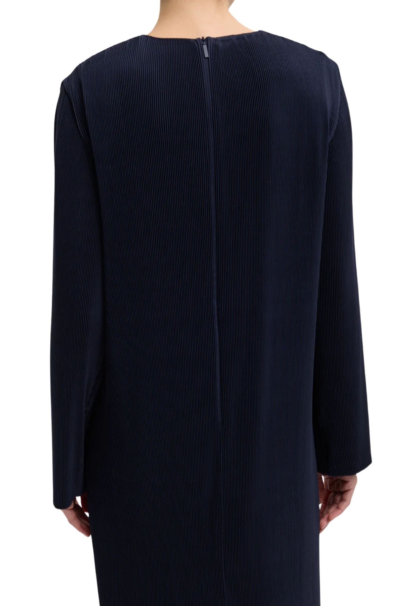 The Plissé Midi Dress is cut in custom pleating on an ultra light stretch base with a softly wrinkled finish that is equal parts ease and intrigue. Designed with an exaggerated shoulder and clean shift shape, the pleats catch the light and create dimension with every step. Offered in three hero shades across the Color Wheel, Ring 2 Dark Navy, Ring 3 Green, and Ring 4 Red, it adapts to mood and setting. Ground with monochromatic hosiery and a heel for polish, or style with the Harry Boot for nonchalant ease.