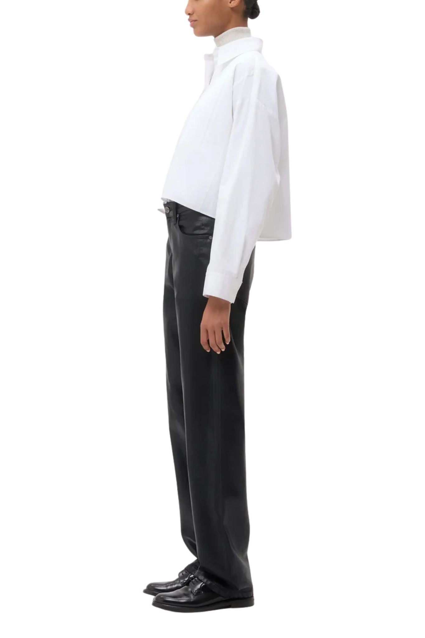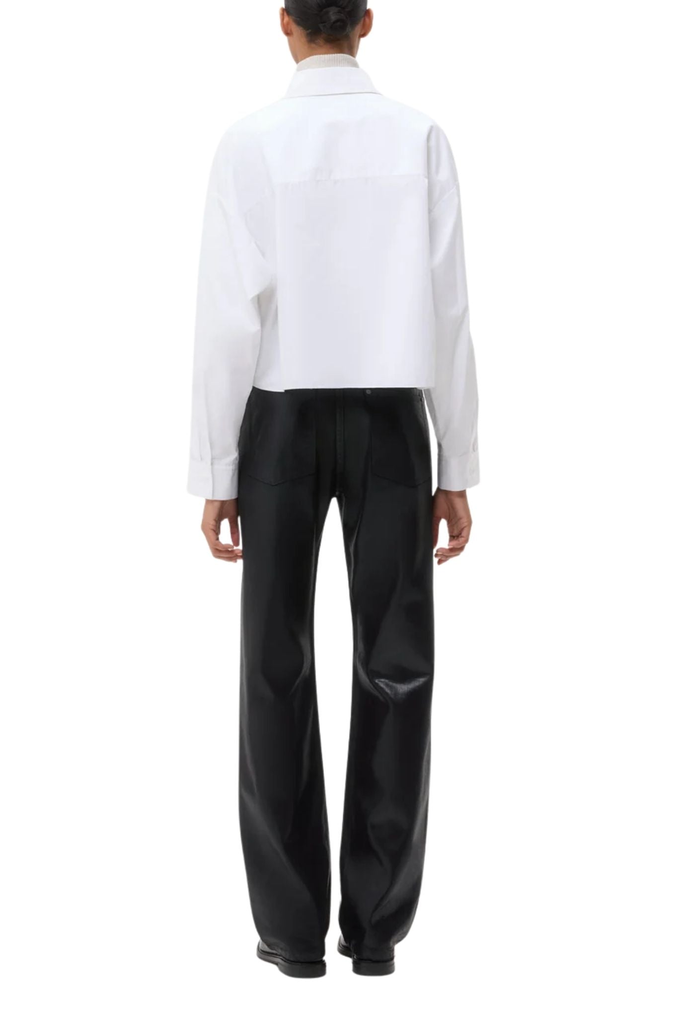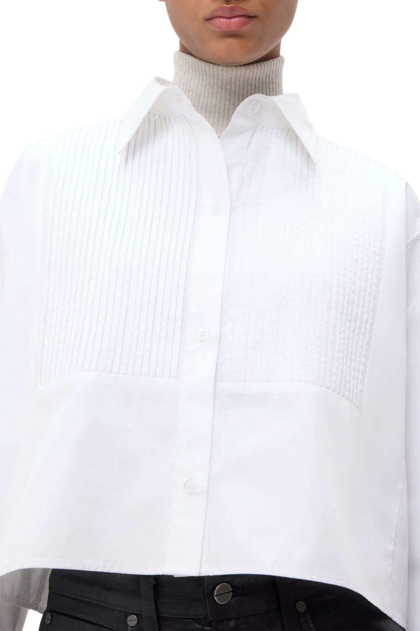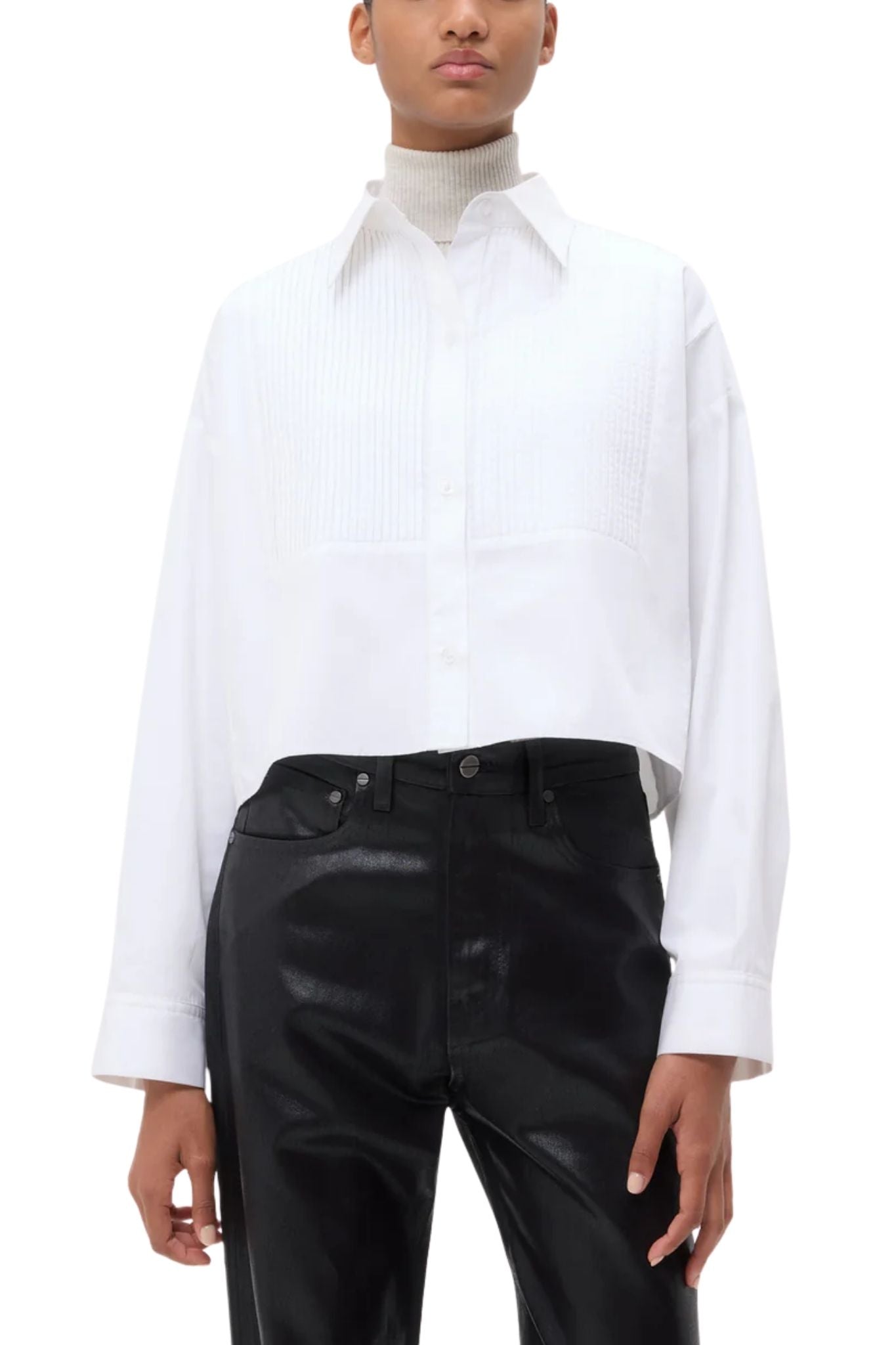 Cropped long-sleeve button-down in cotton poplin. The Soon To Be Ex features a boxy silhouette with a tuxedo-style bib. Complete with an exposed button-up placket, chest patch pocket, and single-pick up button cuffs.