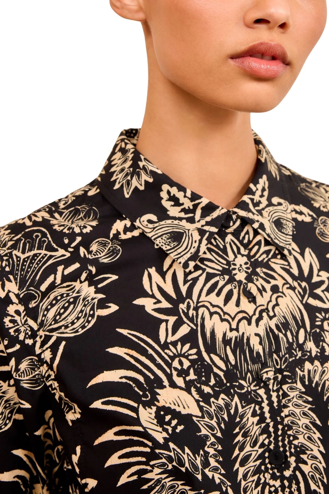 Richly graphic, the Taliah Dress is cut from poplin featuring a symmetrical floral leaf print with subtle, batik textures. This black and ivory dress has a shirt-inspired silhouette, with a classic collar and a mini hemline with godet pleats for elegant volume.
