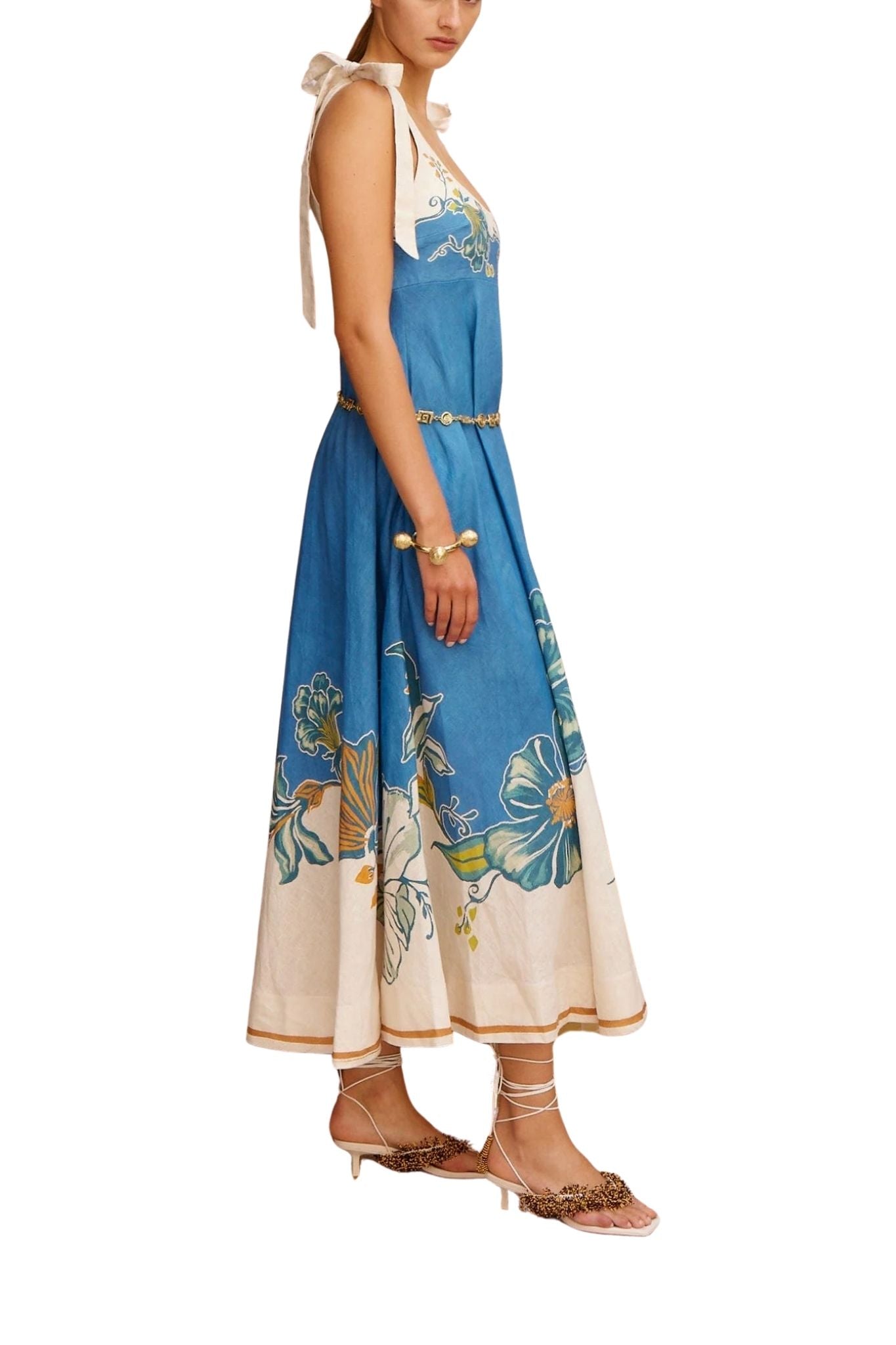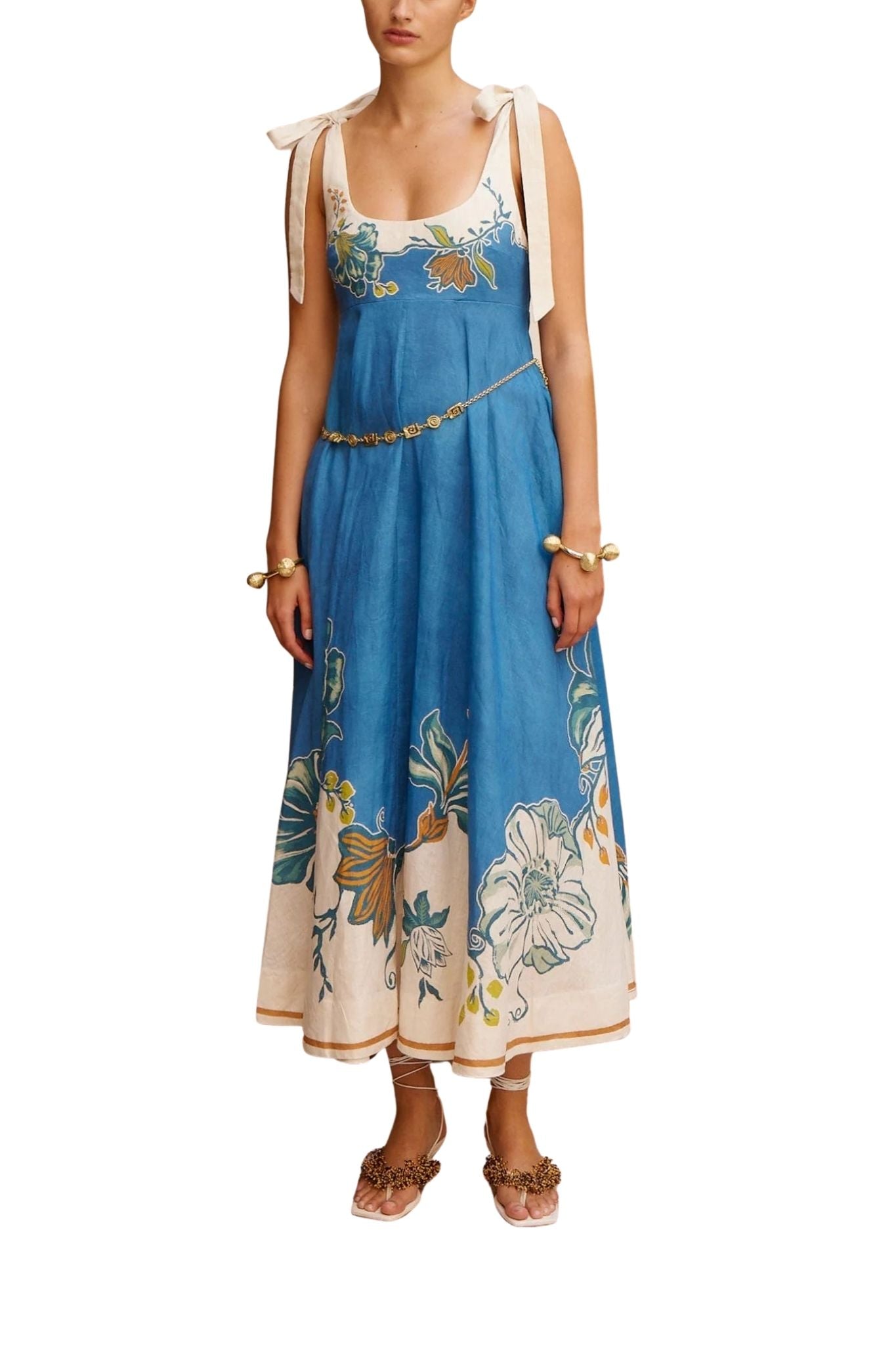The Alemais Luda Ballet Sundress features a midi silhouette with adjustable self-tie straps and a shirred back panel for a flexible fit. It includes an invisible side zip and practical inseam pockets, blending elegance with everyday ease.