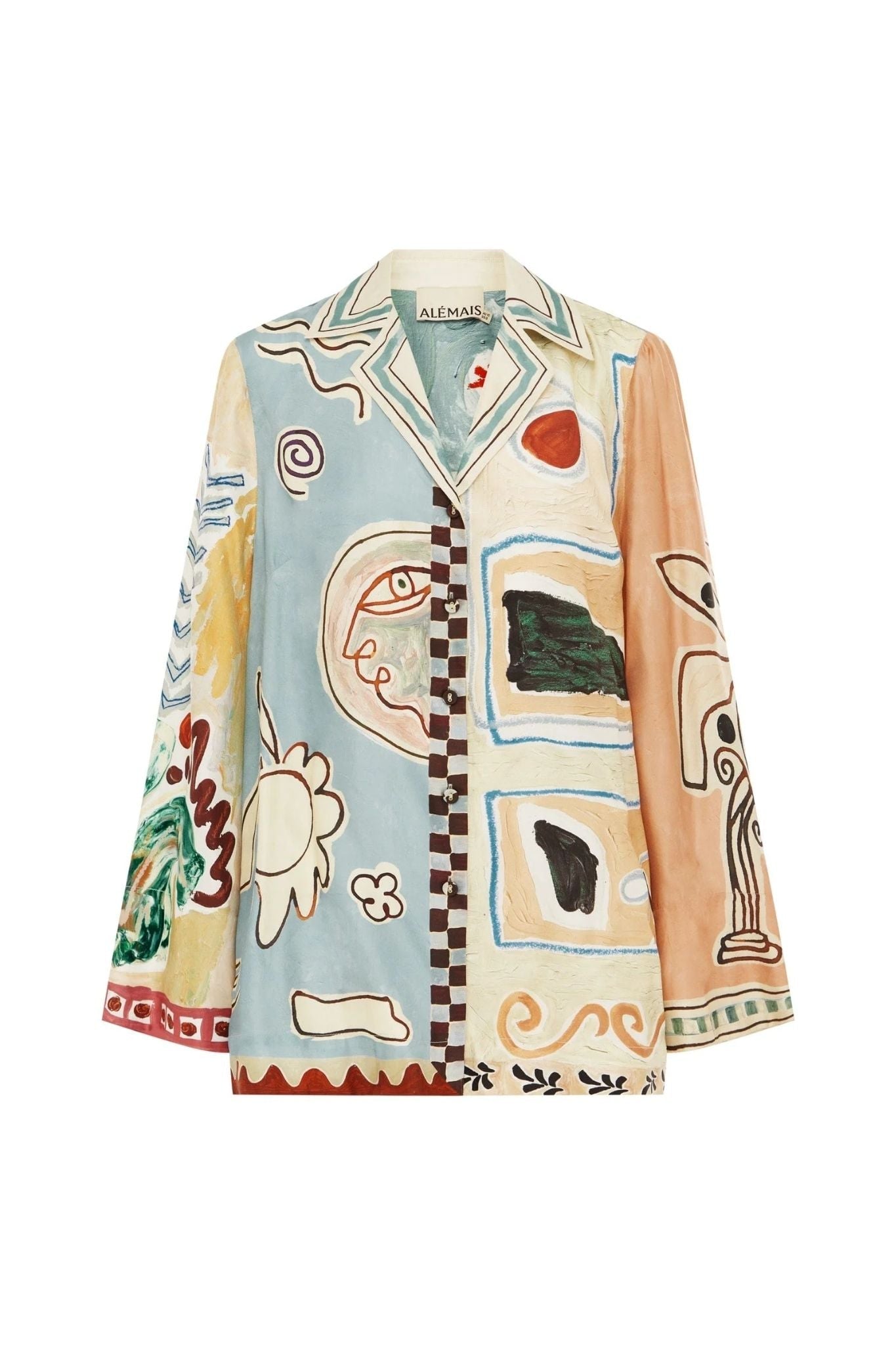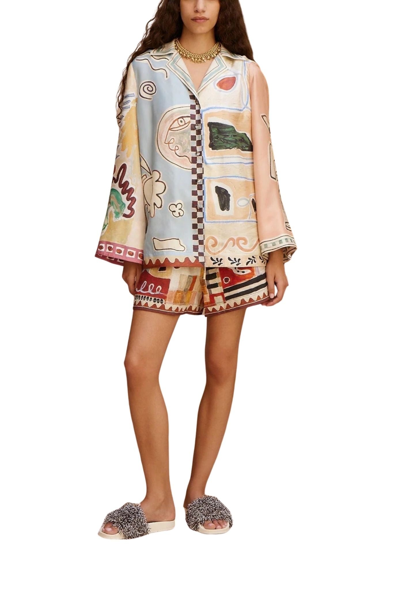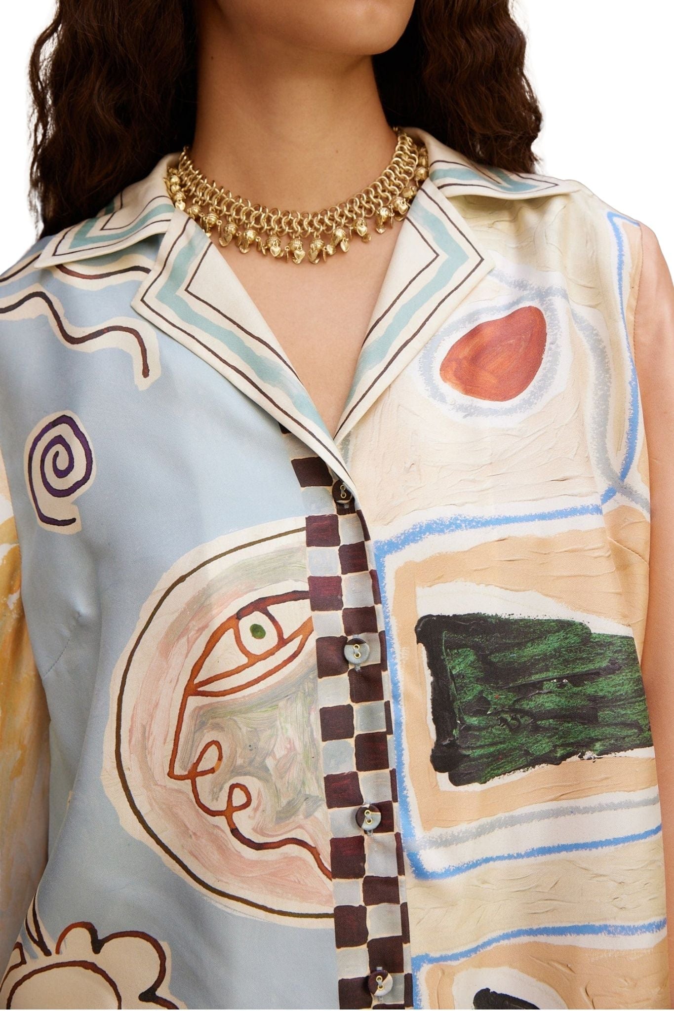 The Michelle silk shirt features a relaxed silhouette with a camp collar and self-covered buttons. Created in collaboration with artist Laurence Leenaert, it combines refined craftsmanship with a subtle artistic touch.