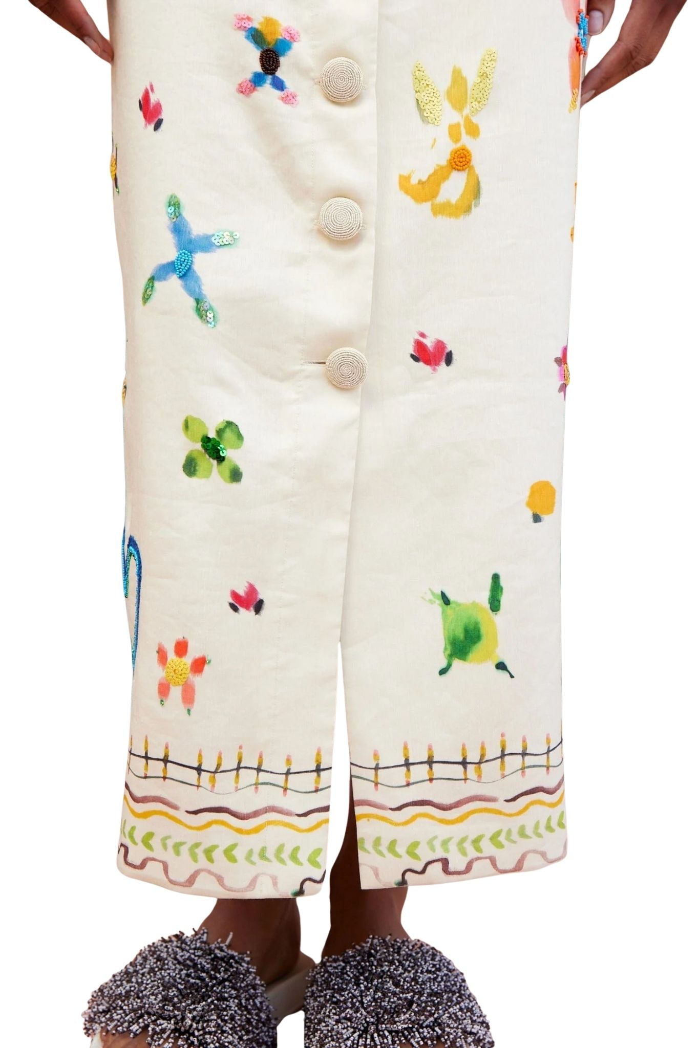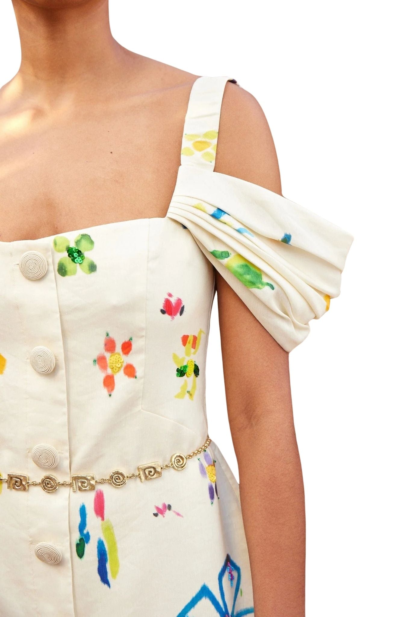 Fitted midi dress with a square neckline and off-the-shoulder gathered layered sleeves. Features corded buttons down the center front.