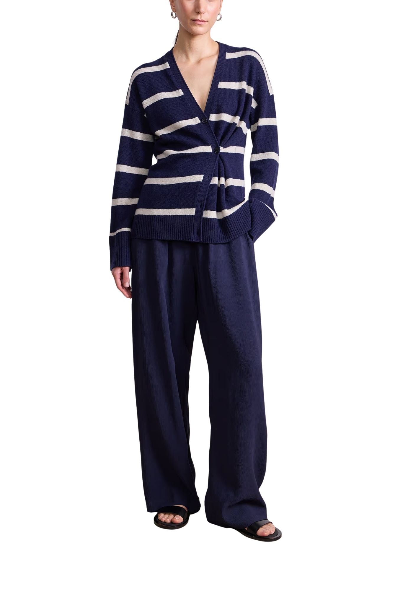 V neckline, slim fit, front button placket, option to fasten with the extra button at the left side waist for a wrap closure.