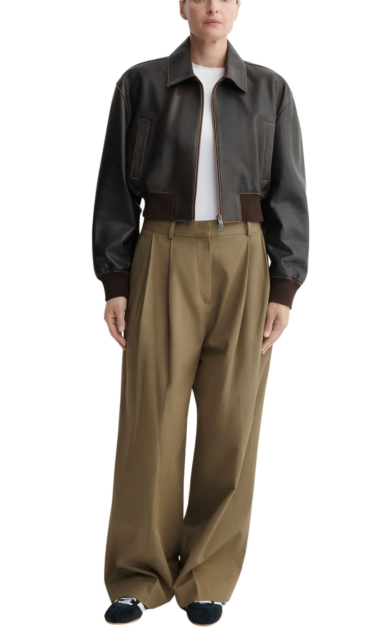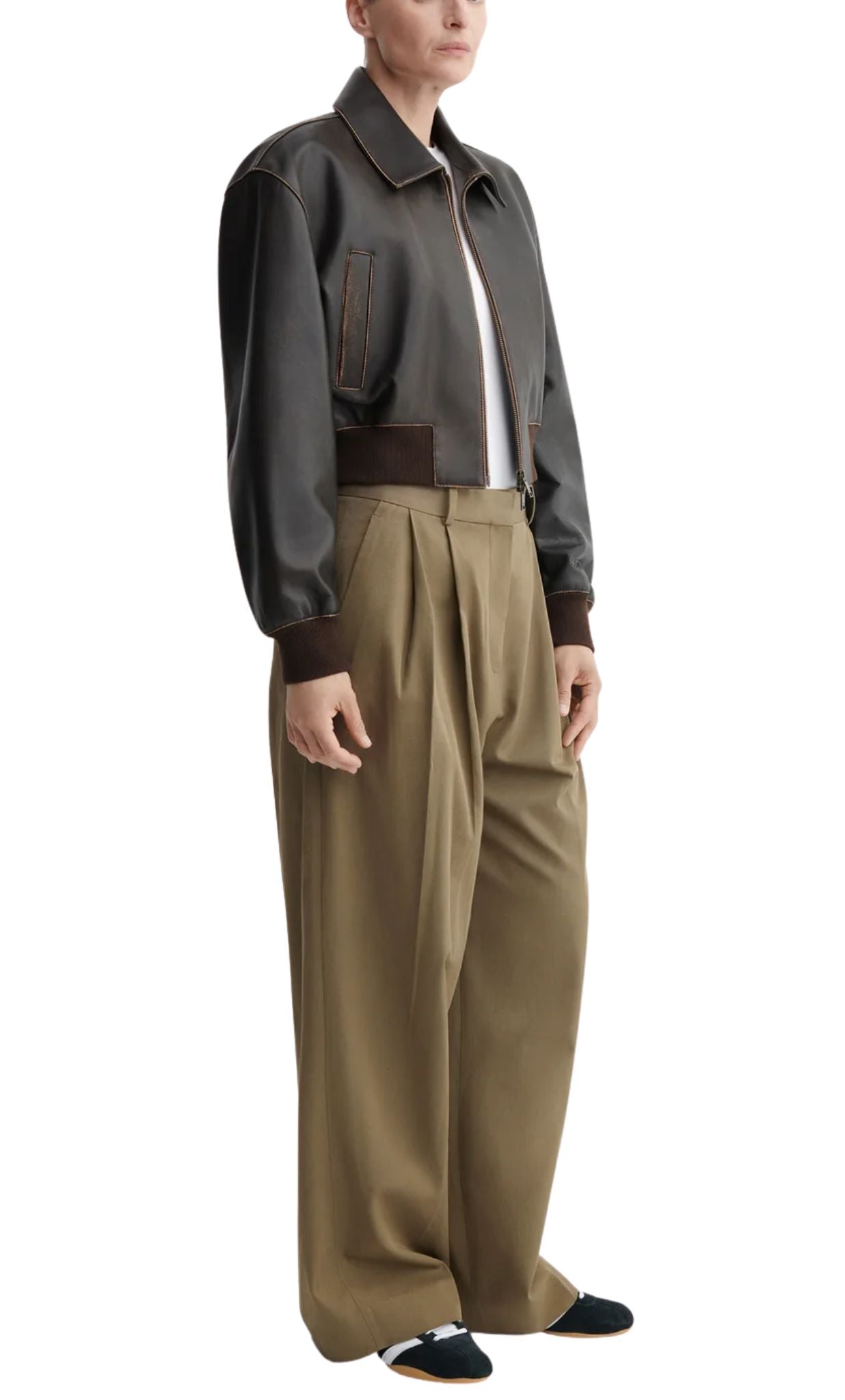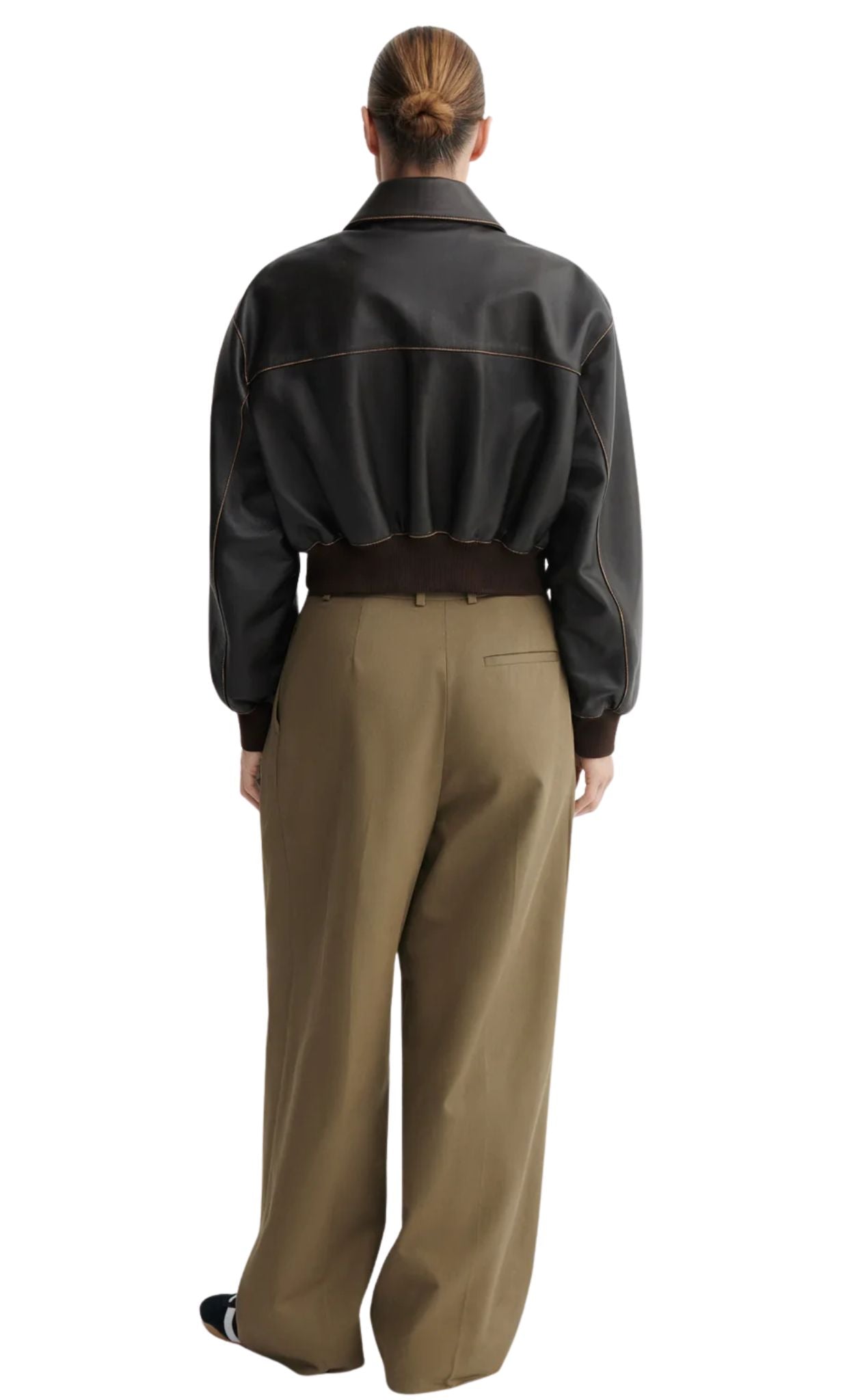 Vintage Leather Jacket is an elevated take on our signature Elettra style. This cropped silhouette brings a refined edge to a timeless design. With its modern cut and added pointy collar, this vintage leather jacket offers a fresh update to a beloved classic—perfect for effortless, everyday sophistication.