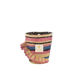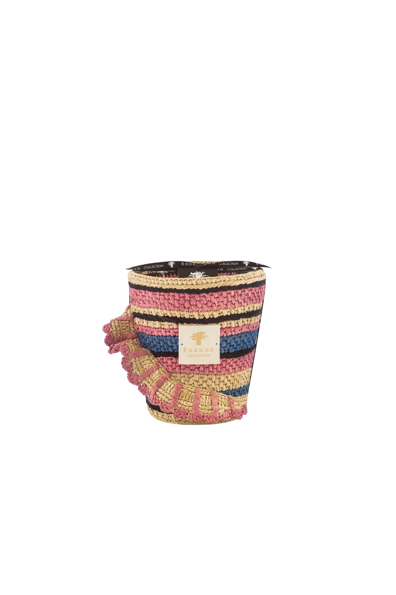 Covered in raffia crocheted with pink and sky-blue stripes, the Mandihy scented candle becomes a decorative object with a festive, humorous look. An embroidered pale pink ruffle is placed diagonally across the candle for a quirky touch.