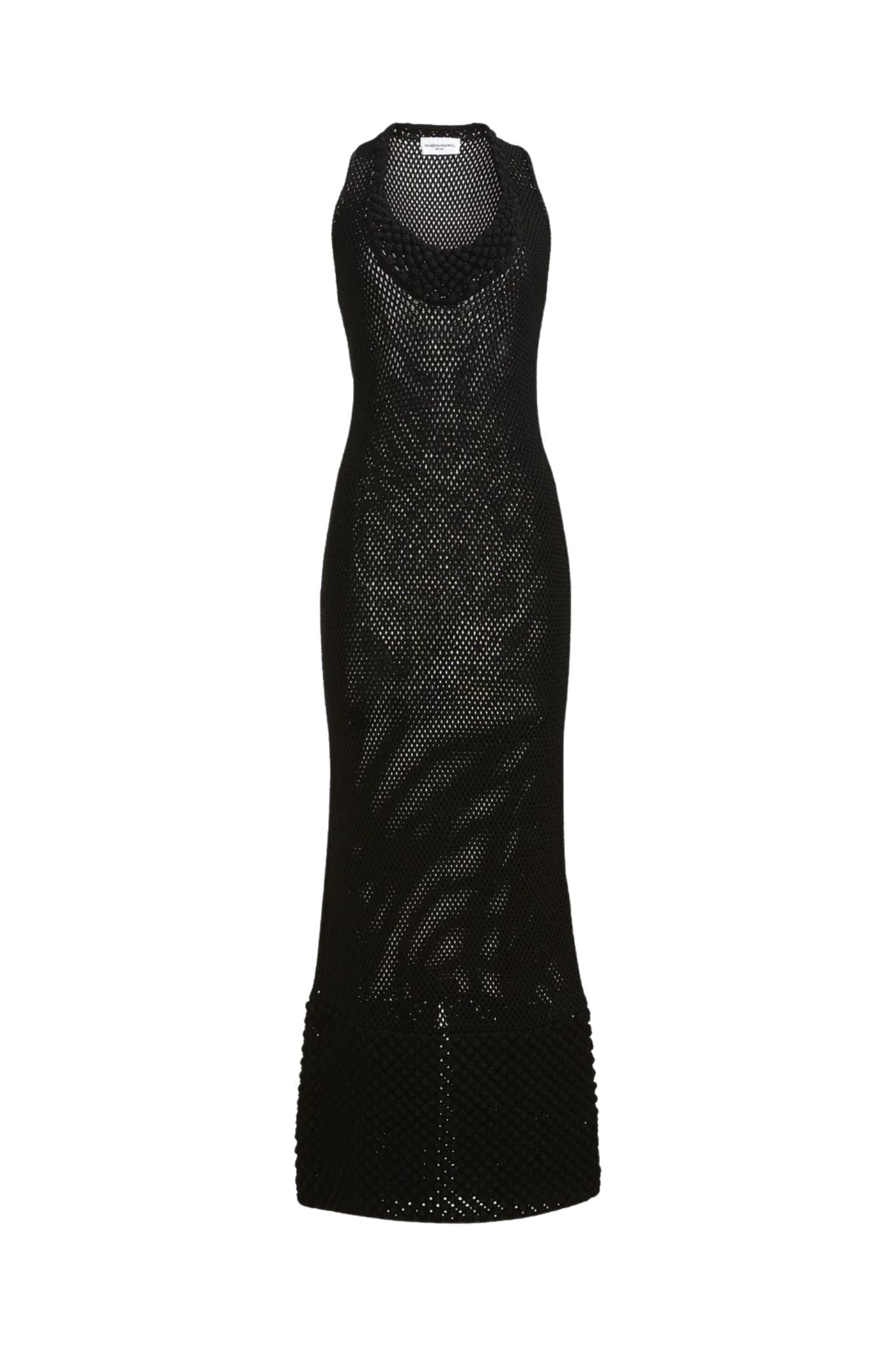 Crafted from a lightweight viscose open-stitch knit, this dress combines texture, transparency and sculptural detail. The neckline is framed with a gradual bauble trim that widens toward the center front, lending dimensional elegance to the silhouette. A bauble hem and subtle back slit create movement and fluidity, while the sleeveless shape enhances its clean, elongated lines. Designed for layering or worn alone, it captures modern sensuality through refined craftsmanship.