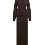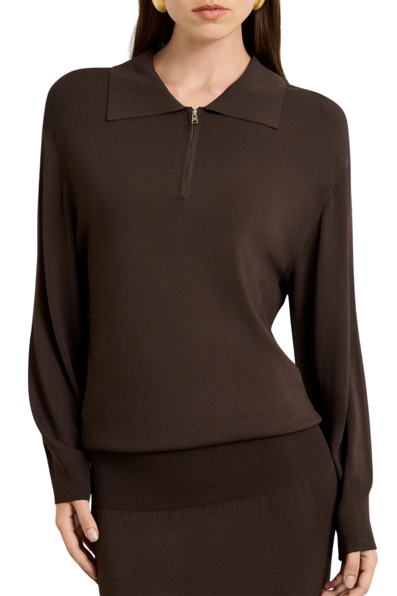 Knit in a soft truffle hue, this midi polo dress balances understated polish with everyday ease. Crafted from a fluid viscose blend with gentle stretch, it skims the body with relaxed precision. A silver half-zip neckline lends a subtle sporty note, while ribbed cuffs, a wide hem band, and a softly blouson waist bring shape and structure. Finished with a clean collar, it captures modern refinement in effortless motion.