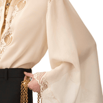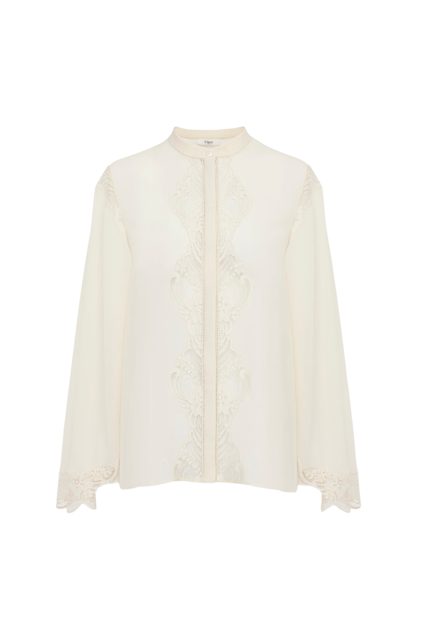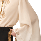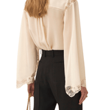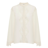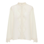 Fluid blouse in organic silk georgette, featuring lace trims, jour échelle inserts, and mother-of-pearl buttons.