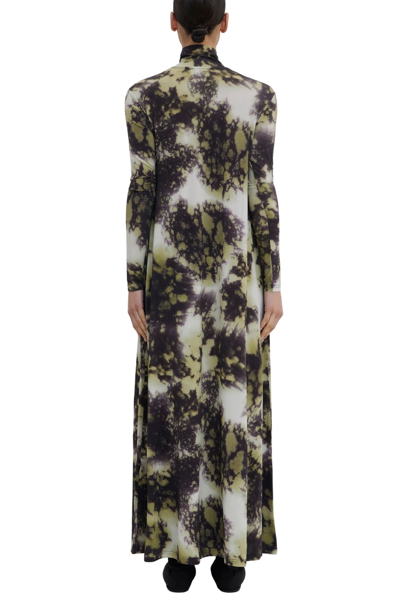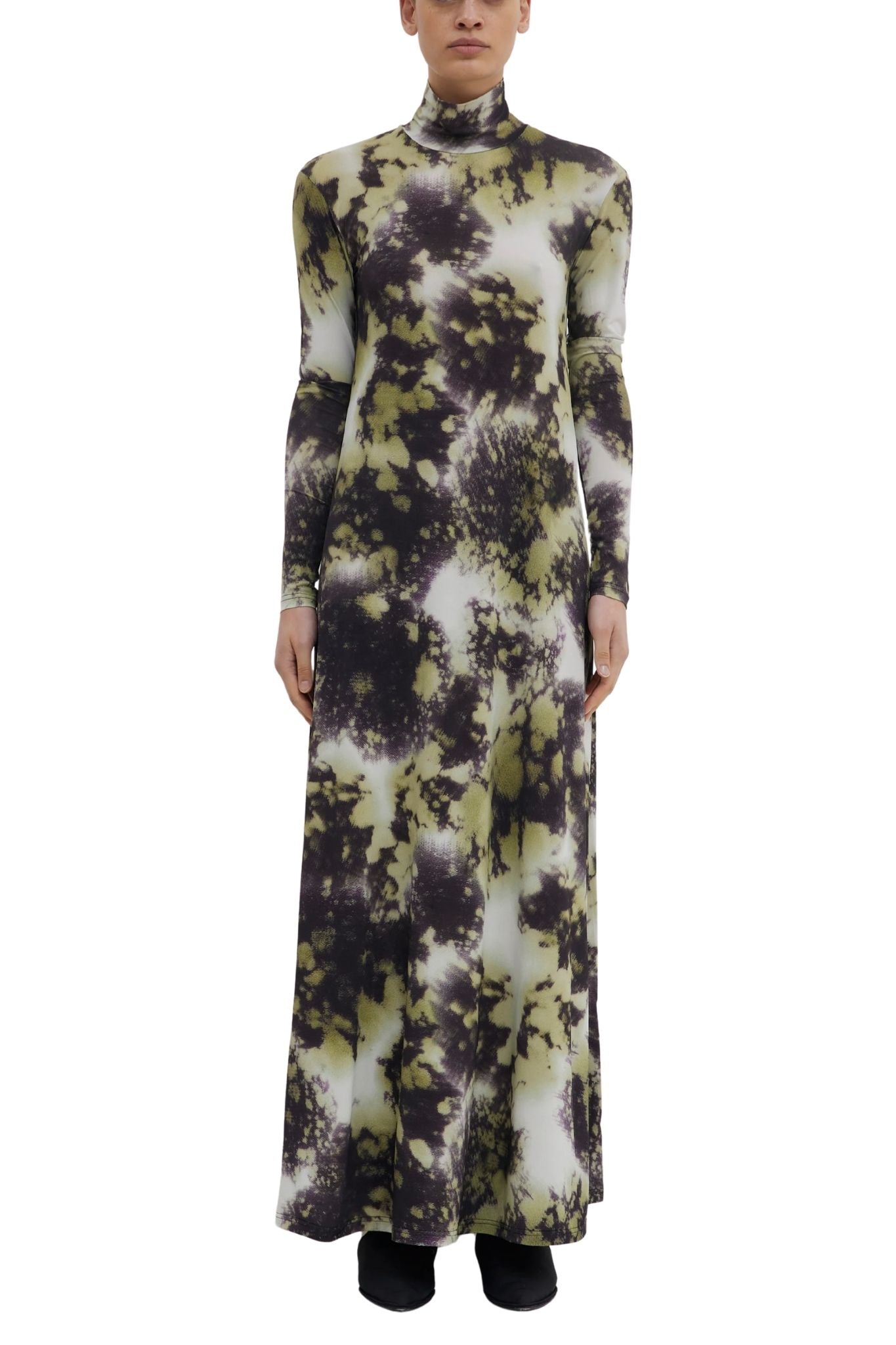 A floor-length column dress in stretchy fabric, cut for a close fit that skims the body. The high turtleneck and long sleeves create a streamlined silhouette. The pistachio jasper print blends organic shapes in deep moss, ivory, and shadowy black for a fluid, almost painterly effect. Soft jersey drapes with a gentle weight, giving the style a second-skin feel.