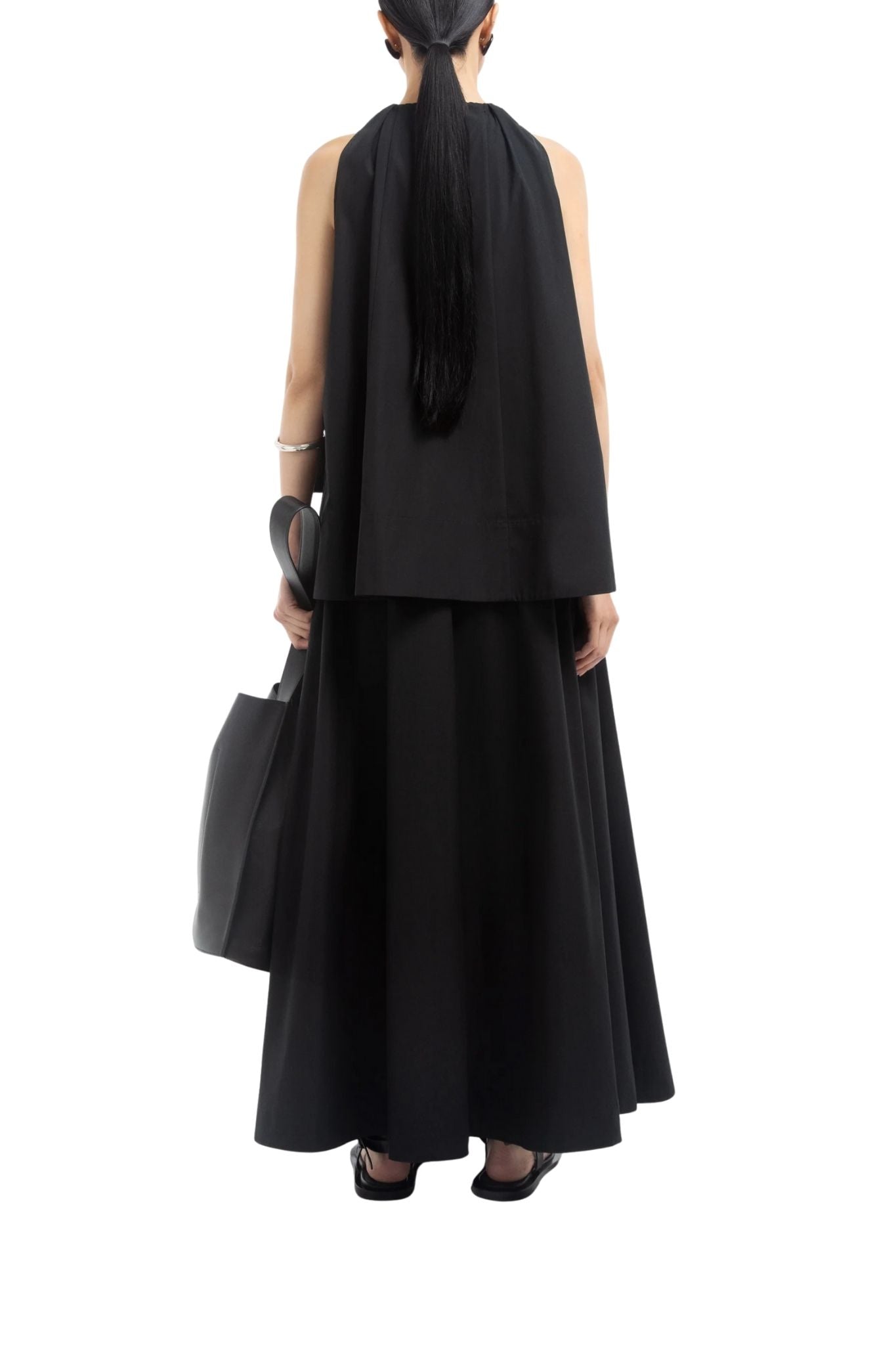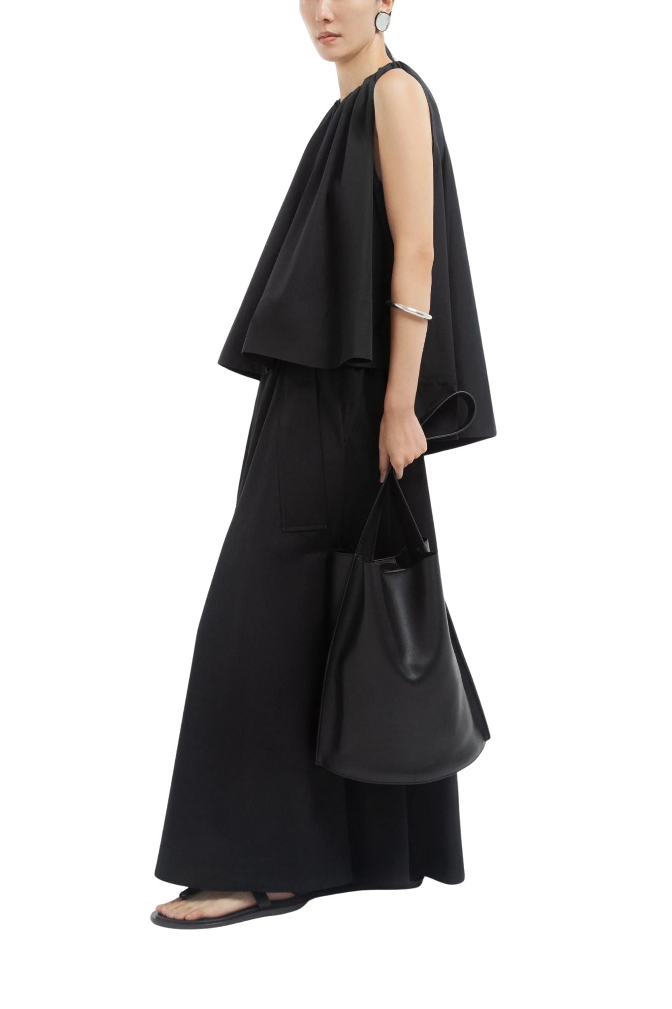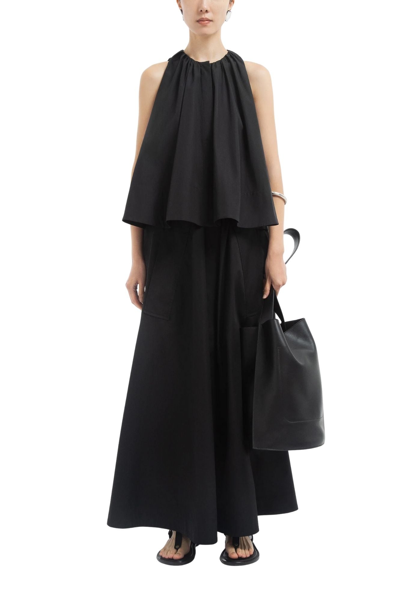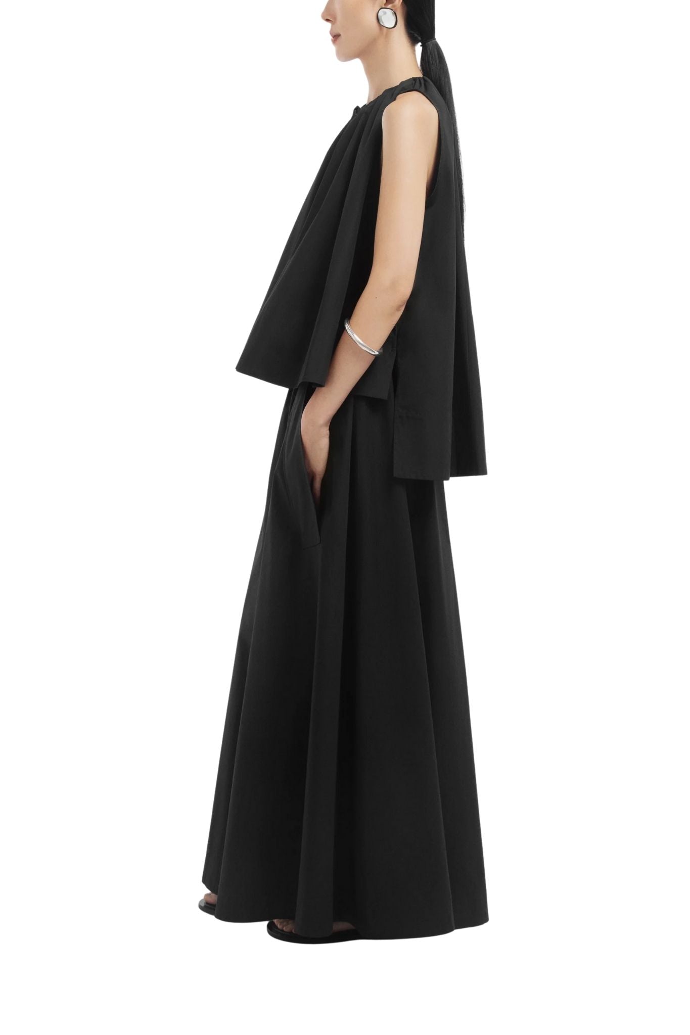 A sleeveless tunic cut in crisp cotton sateen with a soft sheen. Gentle gathering at the neckline gives quiet volume and an easy A-line shape. The high–low hem lifts away from the body and adds movement.