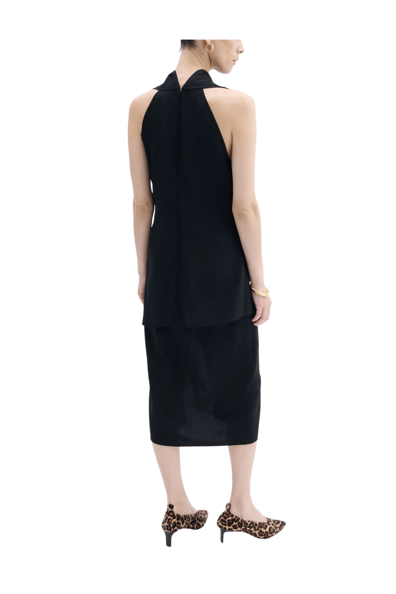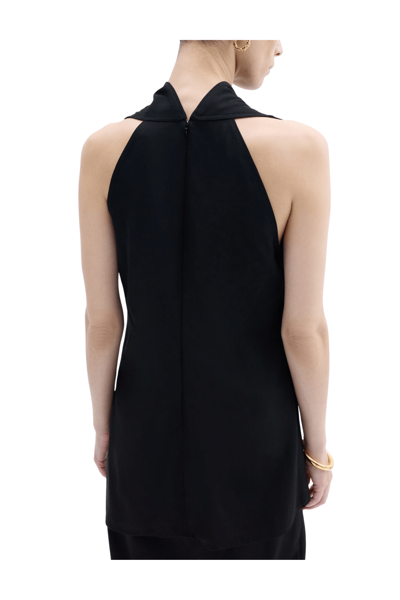 A tailored evening top in viscose-wool suiting with refined matte finish. The sculptural neckline drapes gracefully at the front, while a clean, asymmetrical hem lends architectural balance. Finished with an invisible back zip.