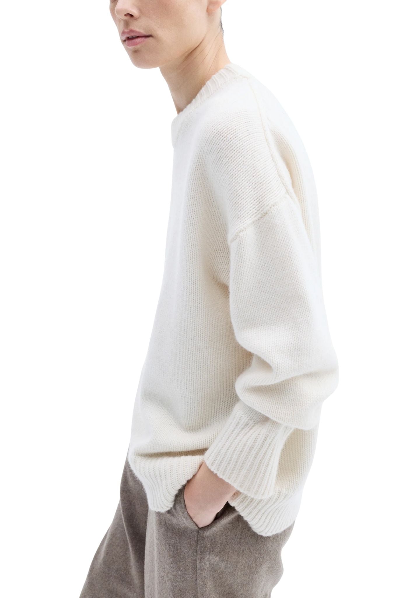 This oversized, comfortable crew neck sweater is crafted from a wool-cashmere blend yarn. It showcases a relaxed boxy shape complemented by timeless ribbed detailing at the neckline, cuffs, and hem.