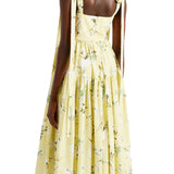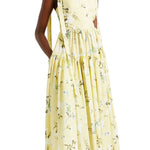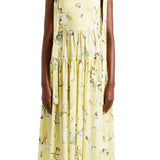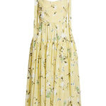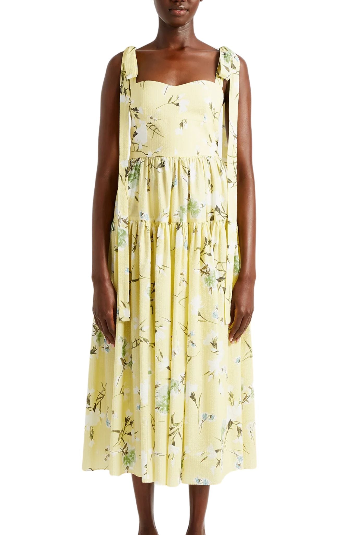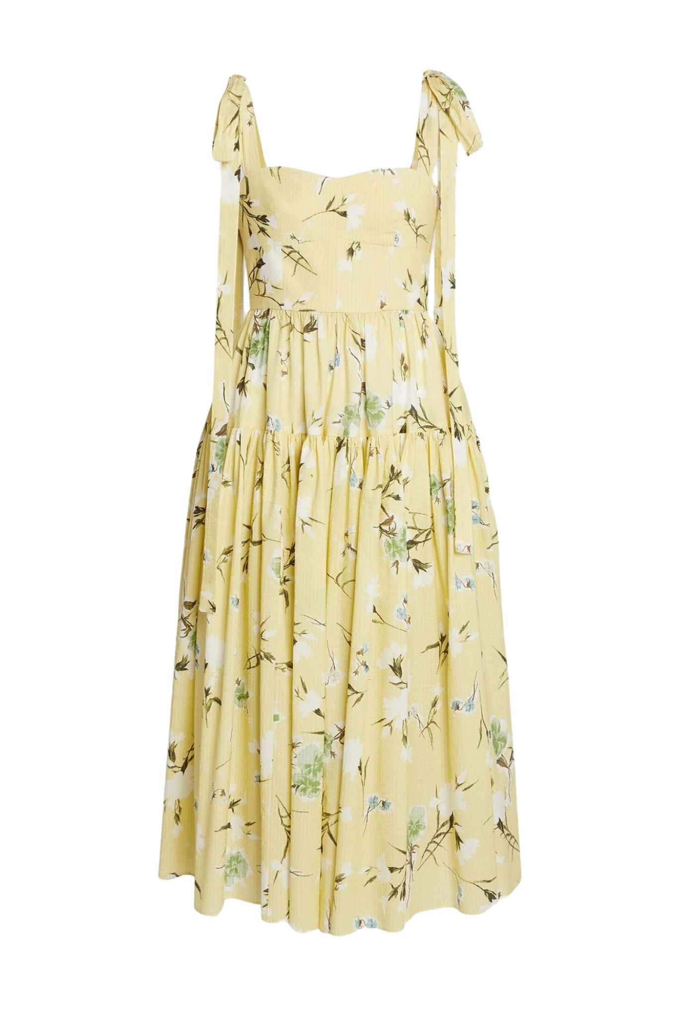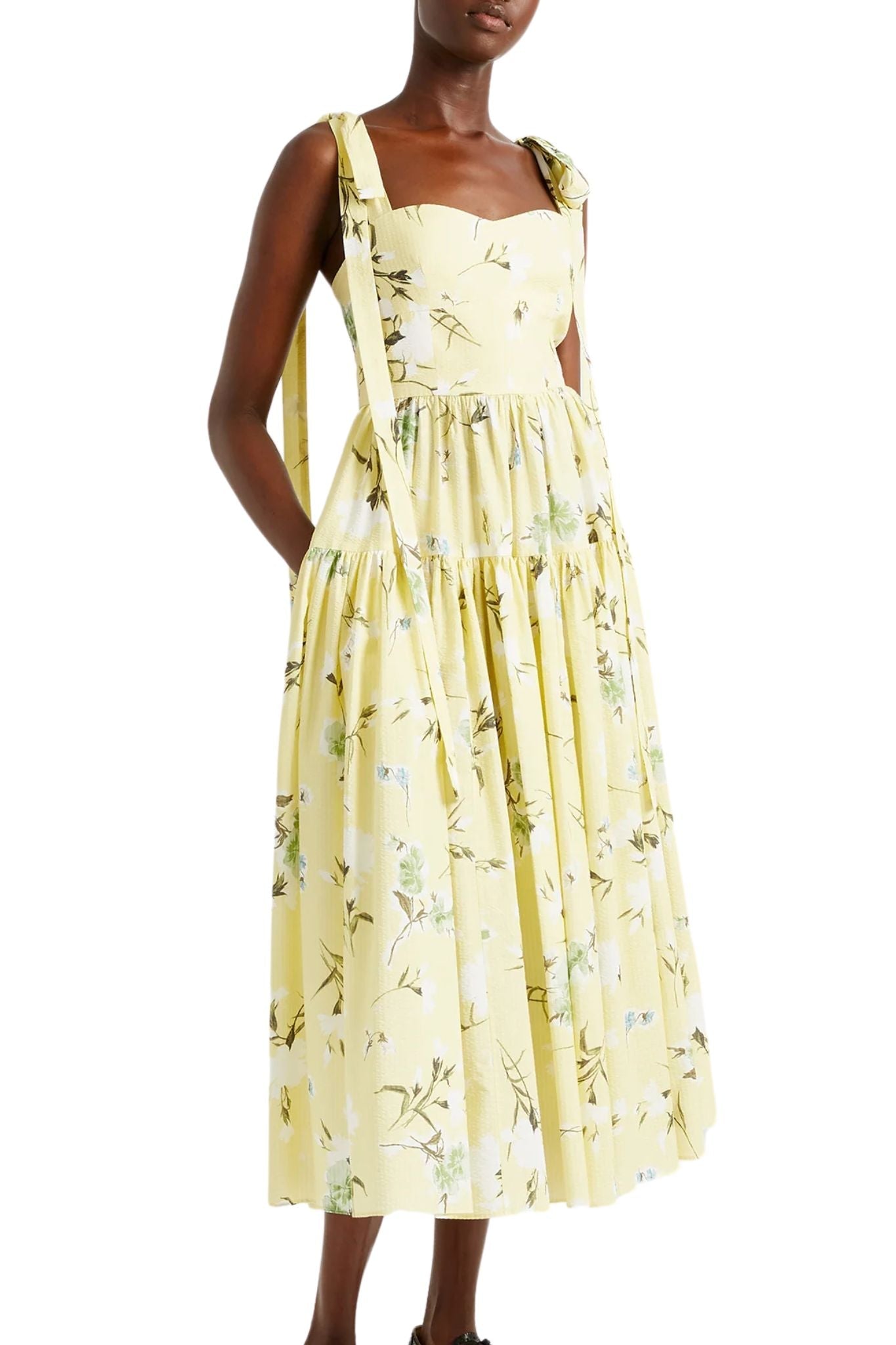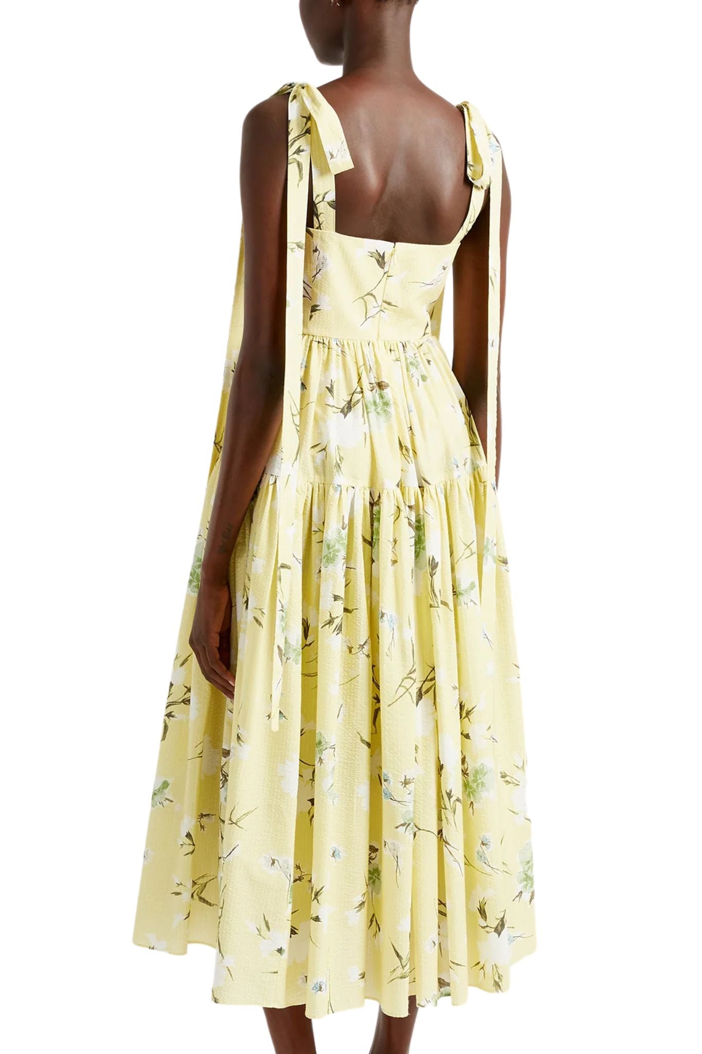 Feminie fit and flare midi dress from Erdem featuring tie-fastening shoulder straps, a sweetheart neckline and tiered skirt. It is cut from lemon cotton seersucker printed with carnations, pansies and violets.