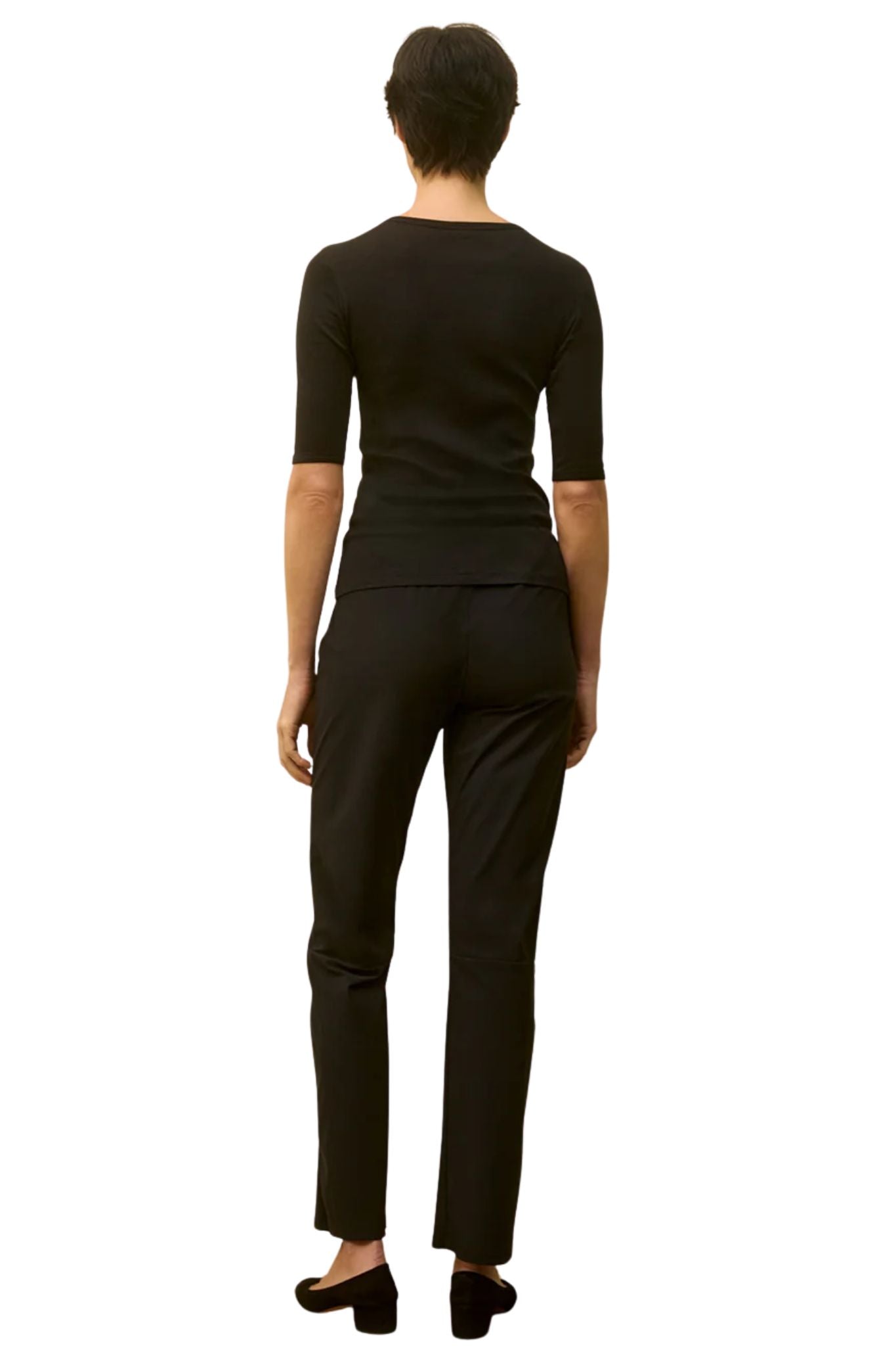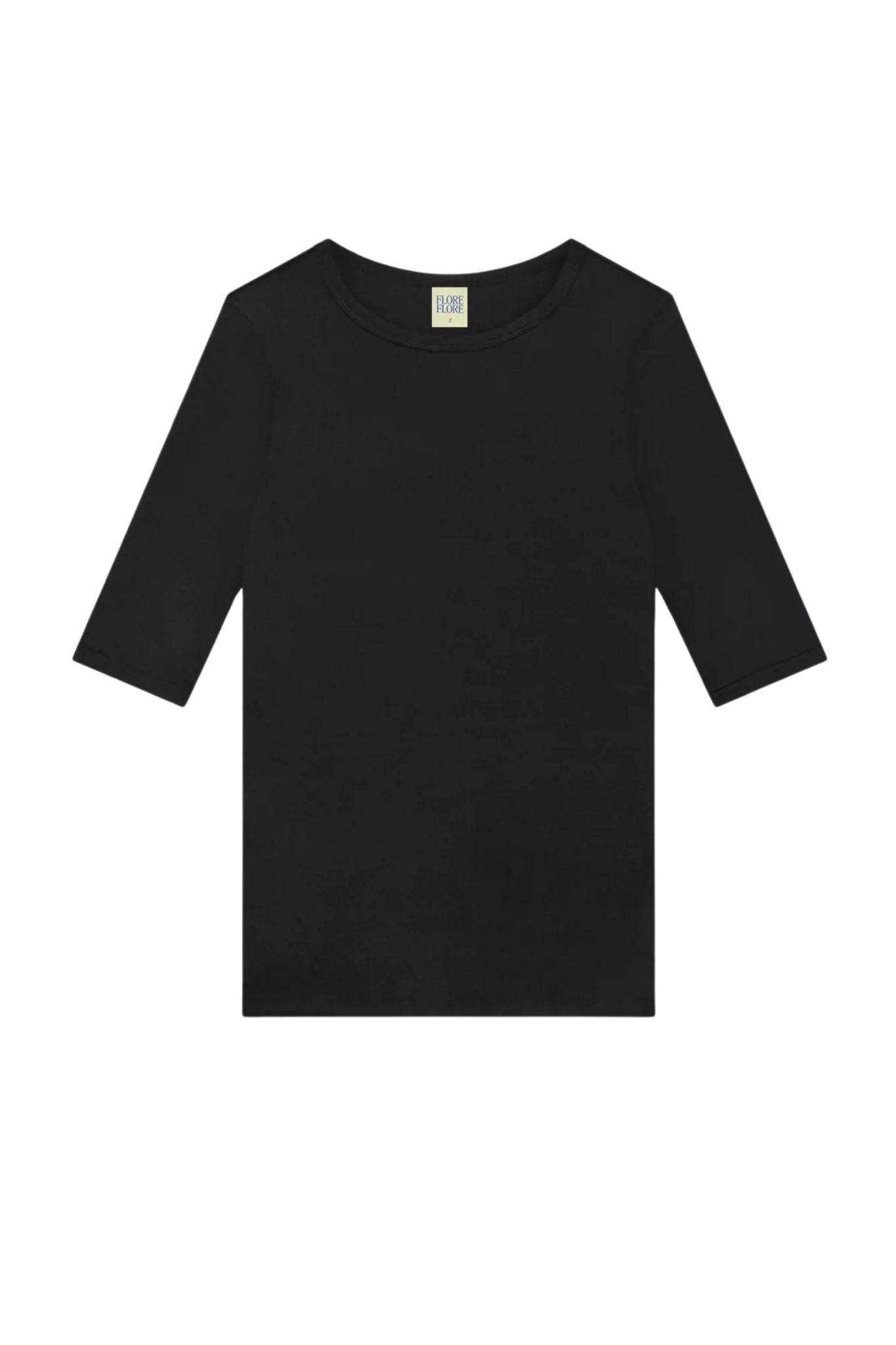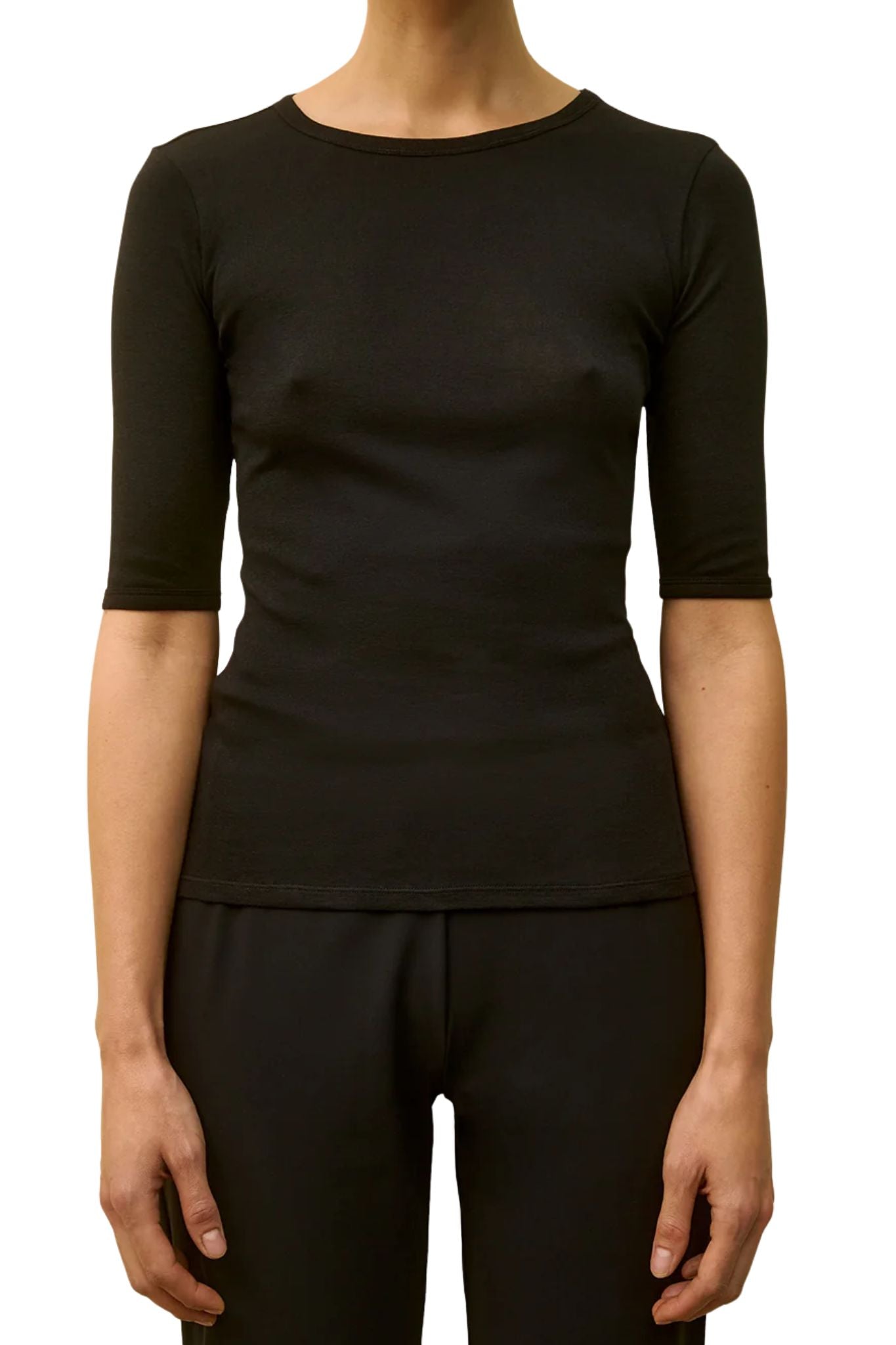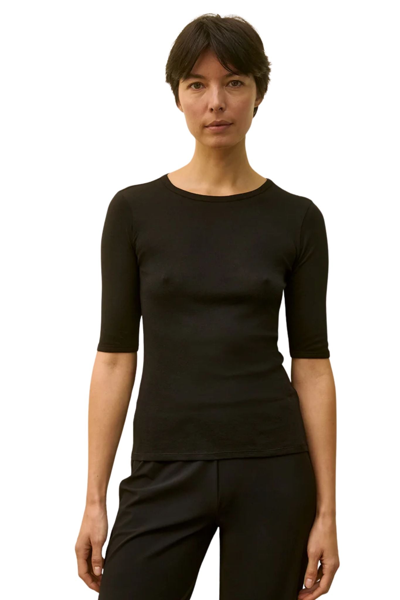 A lengthened t-shirt with lengthened short sleeves, made from lightweight transparent organic cotton 1 x 1 rib. Layer underneath or wear on its own during warmer days.