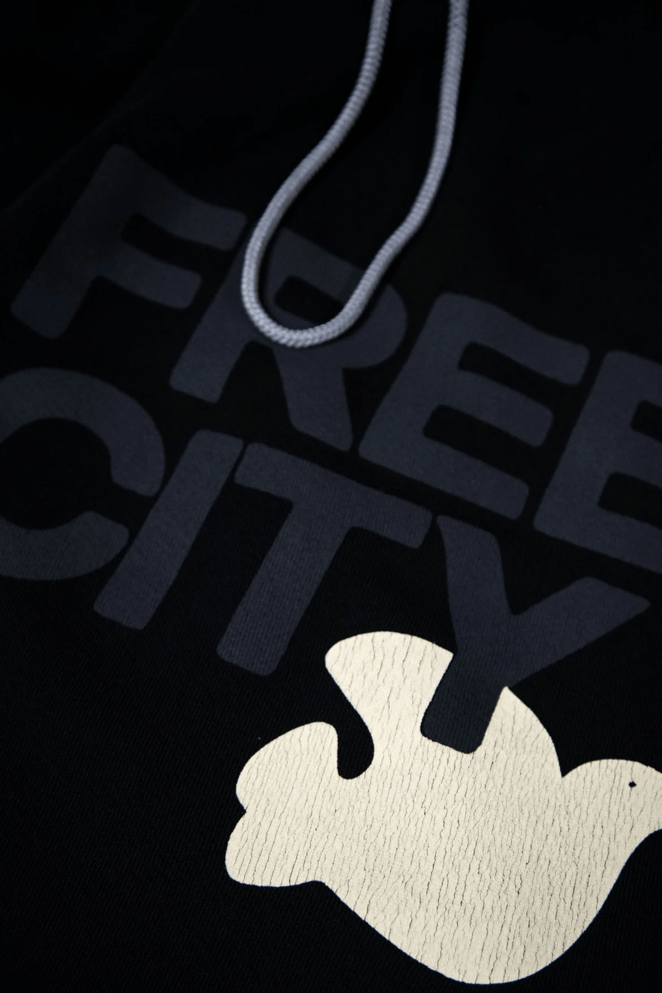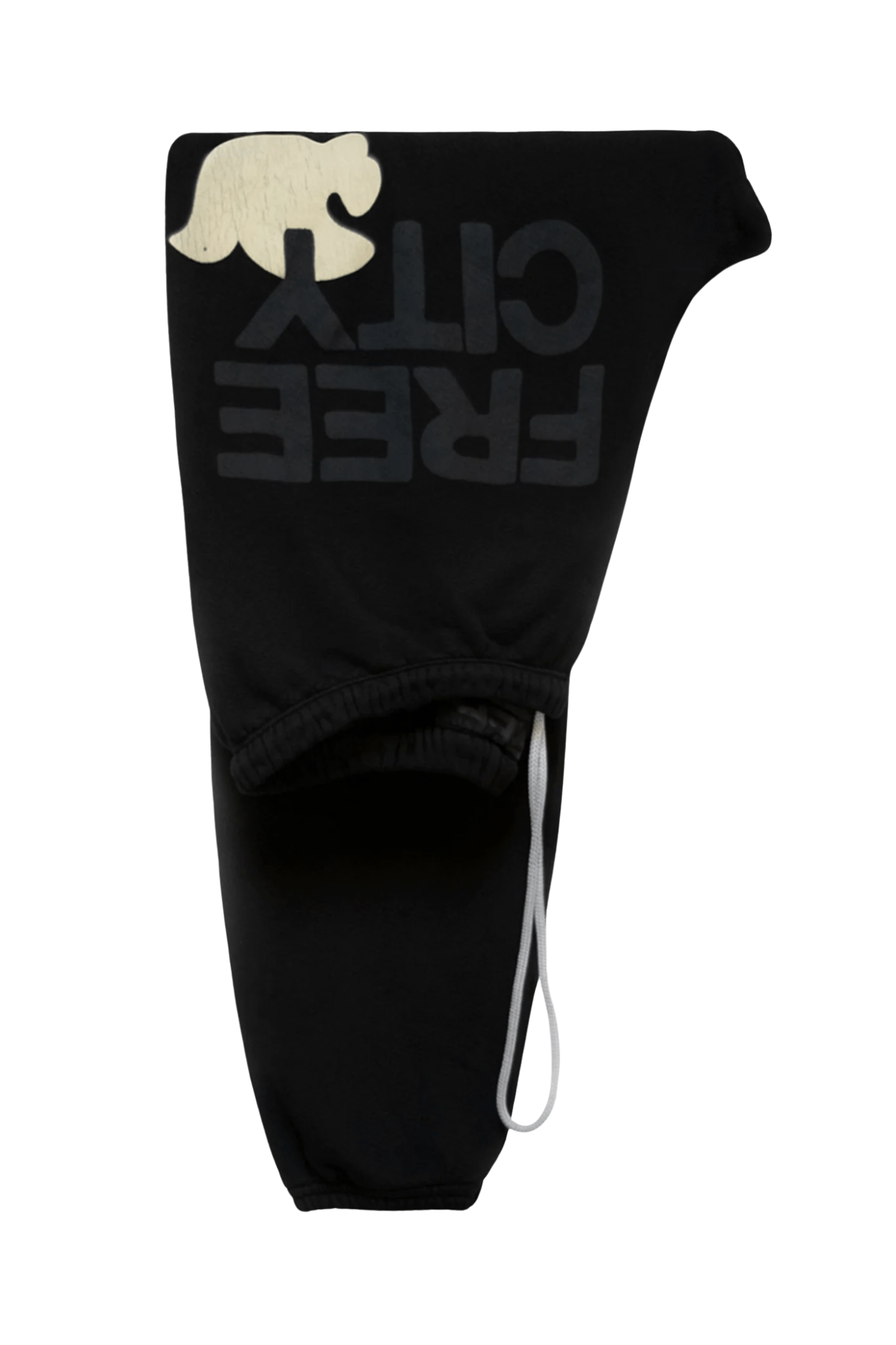 Unisex FLOW sweatpant in blackspace with classic "FREECITY" print in gray and cream "FREECITYDOVE," covered elastic waist and pull drawcord.